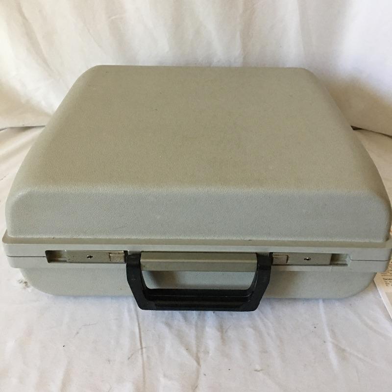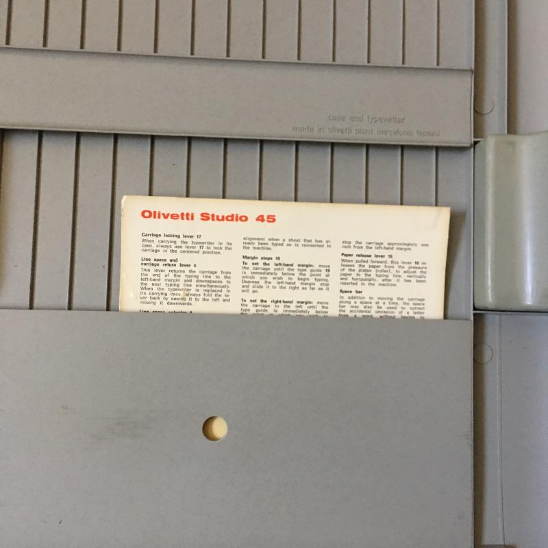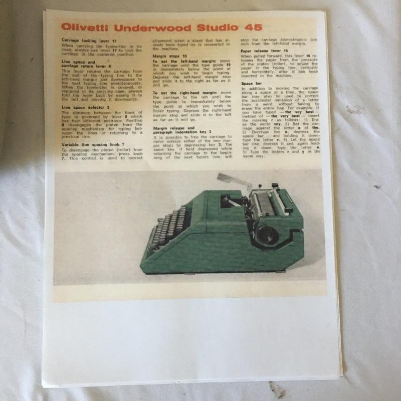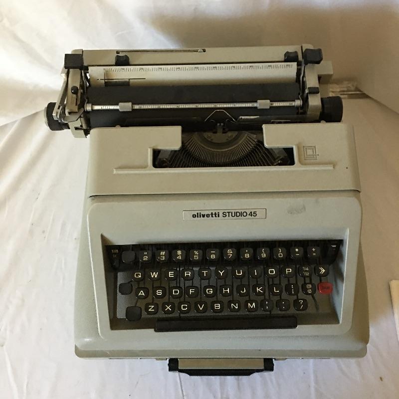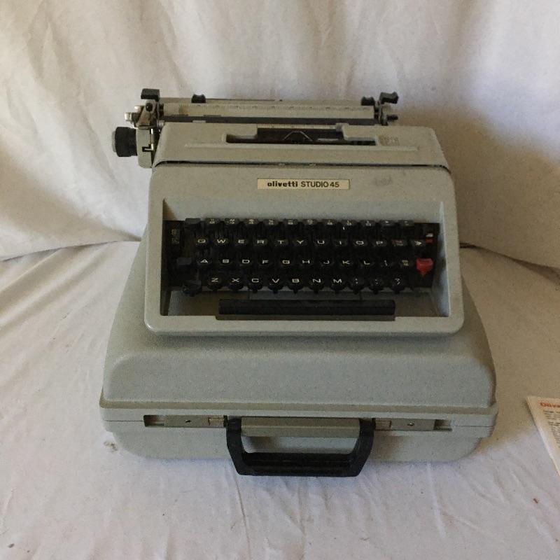 Olivetti Studio 45 typewriter with case and information card. Go old school with this classic typewriter. Typewriter worked when tested but ribbon is dry so you can not see typing. Typewriter is missing shift key on right.