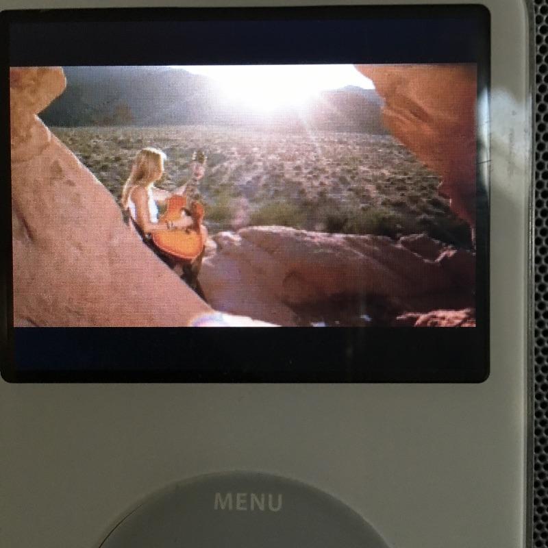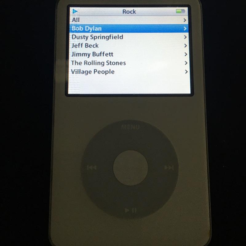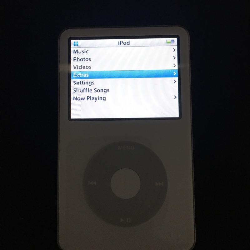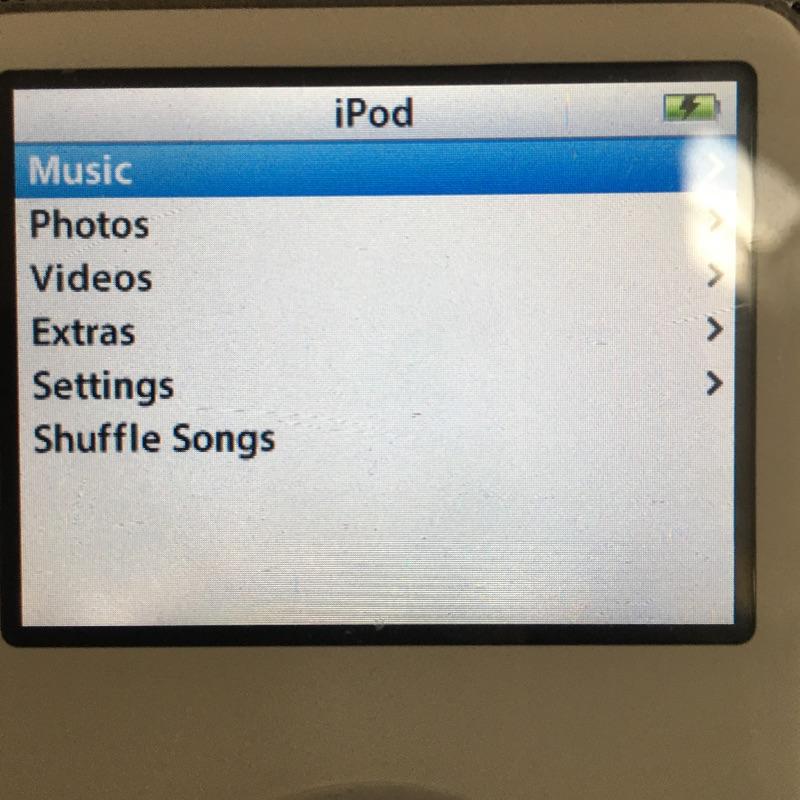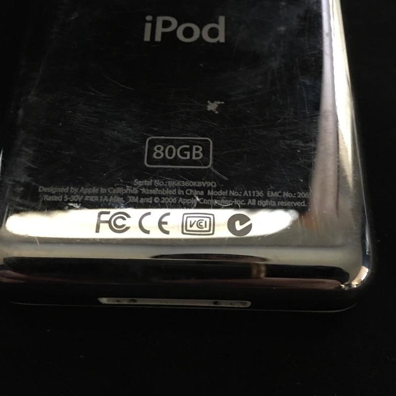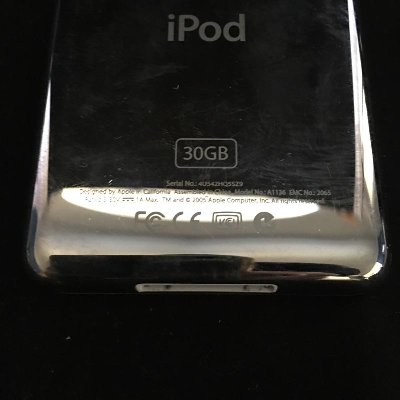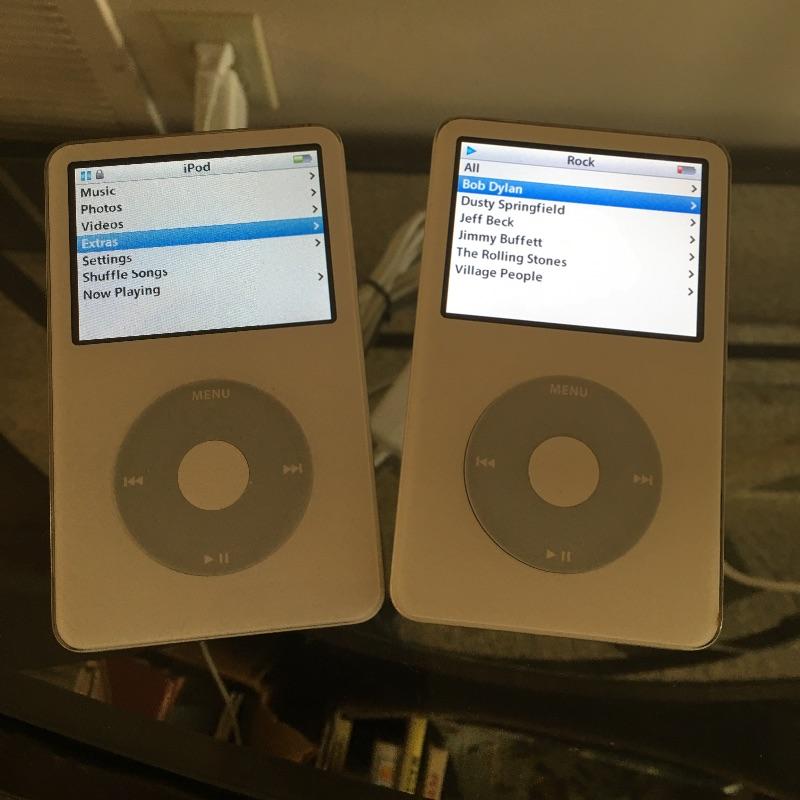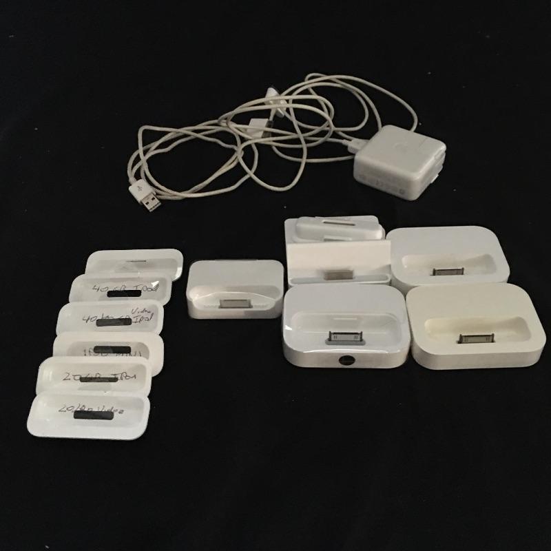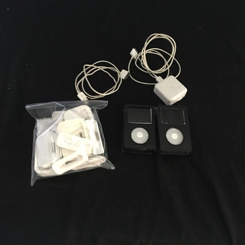 Pair of iPods and charging stands. Lot includes one 30 GB iPod and one 80 GB iPod with charging stands and cables.