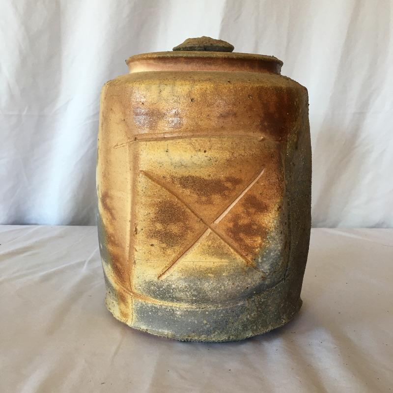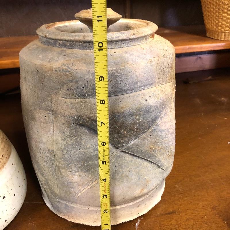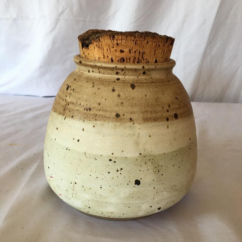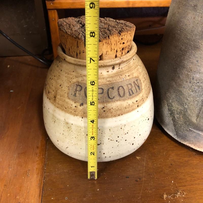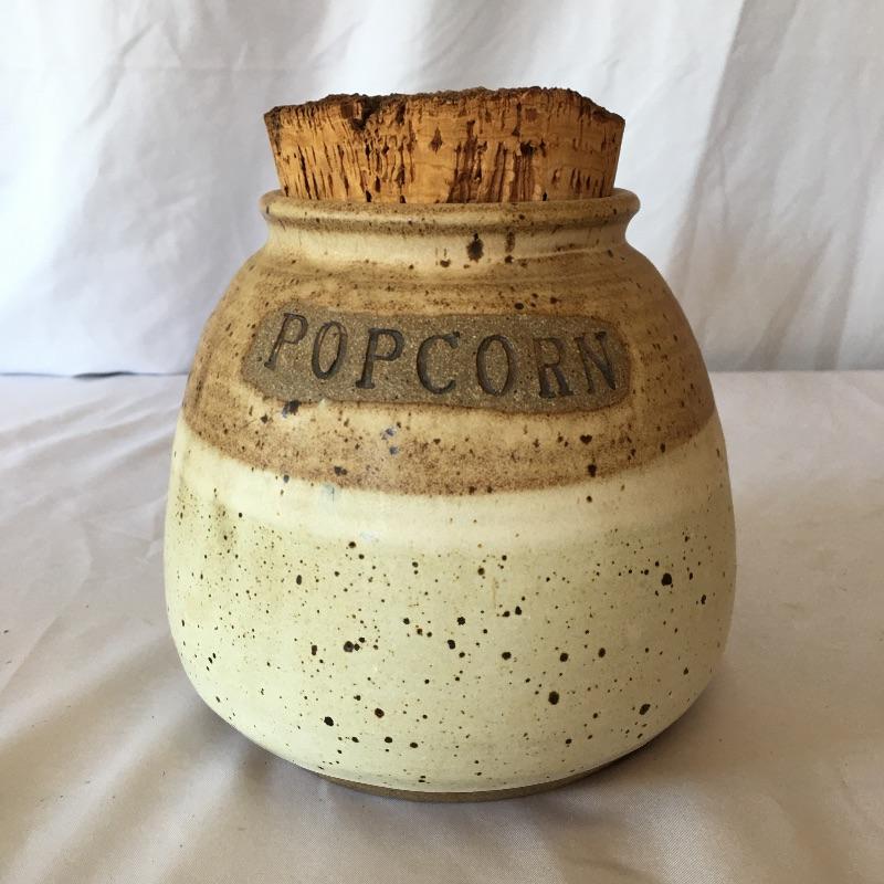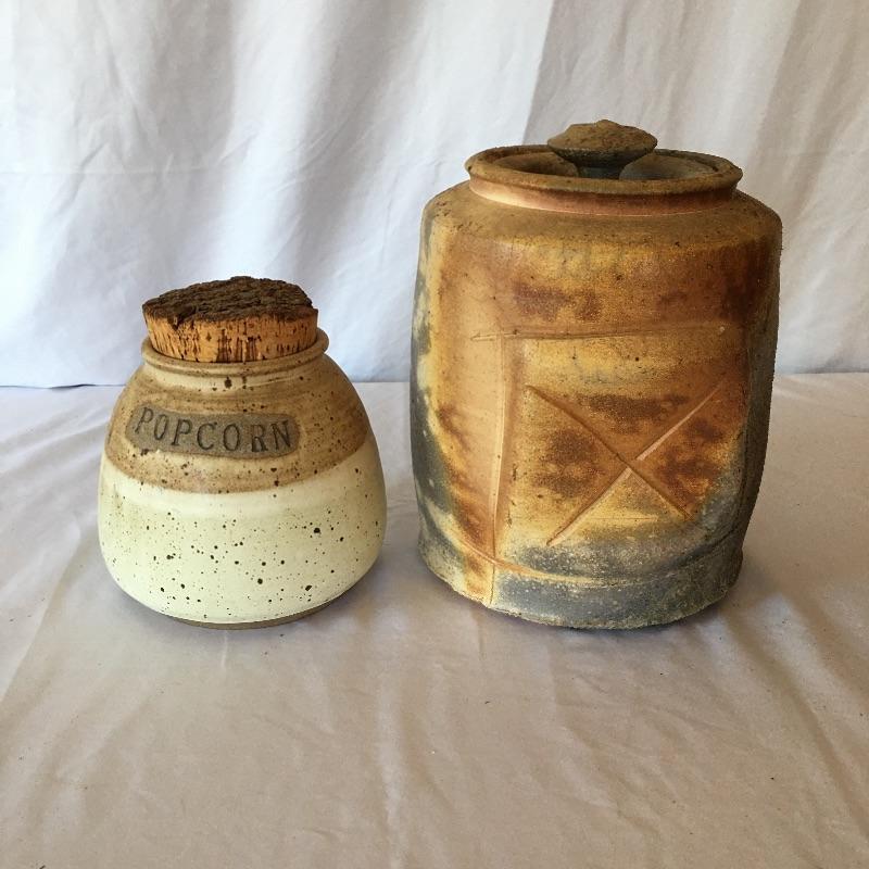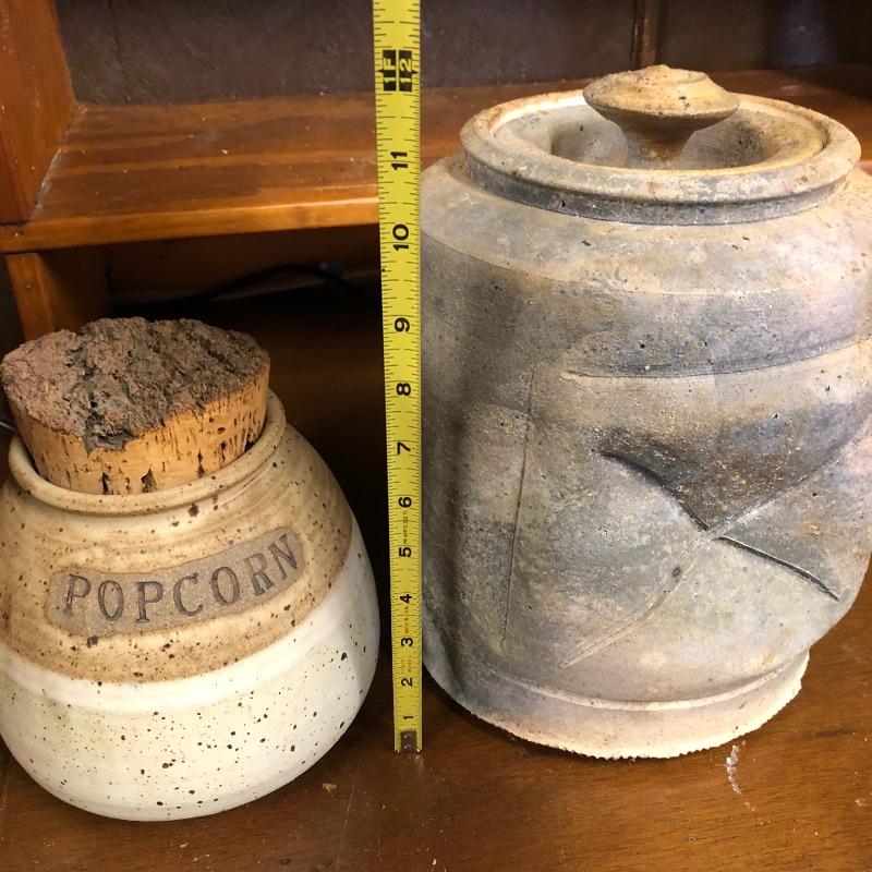 This dynamic duo of pottery canisters includes one marked Popcorn with a cork lid and is signed and the second one has lid and appears the finish is worn on half of the canister and is unsigned. Largest canister measures 8.5” x 11.5”.