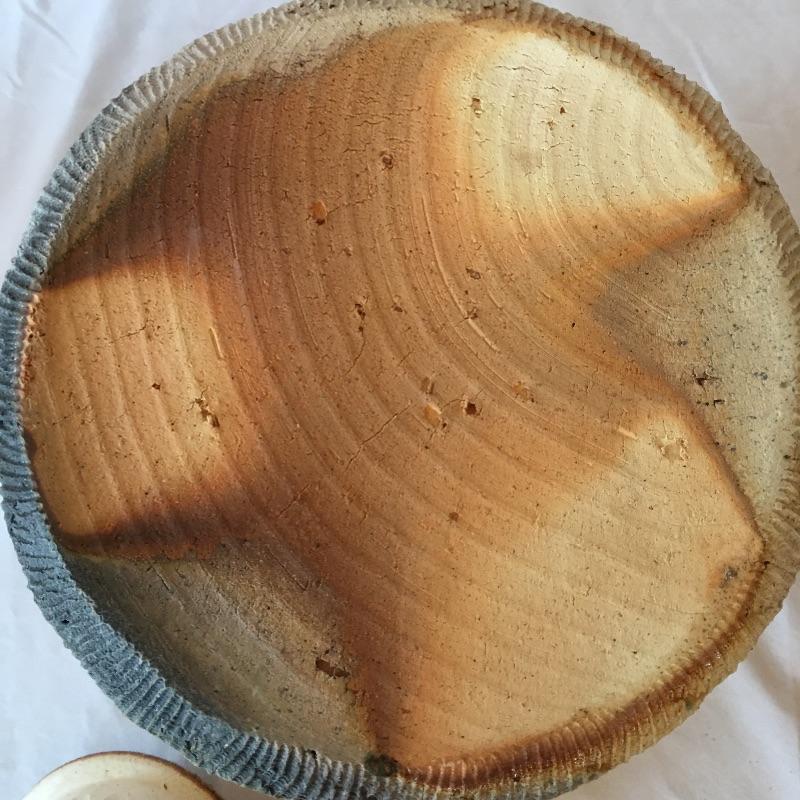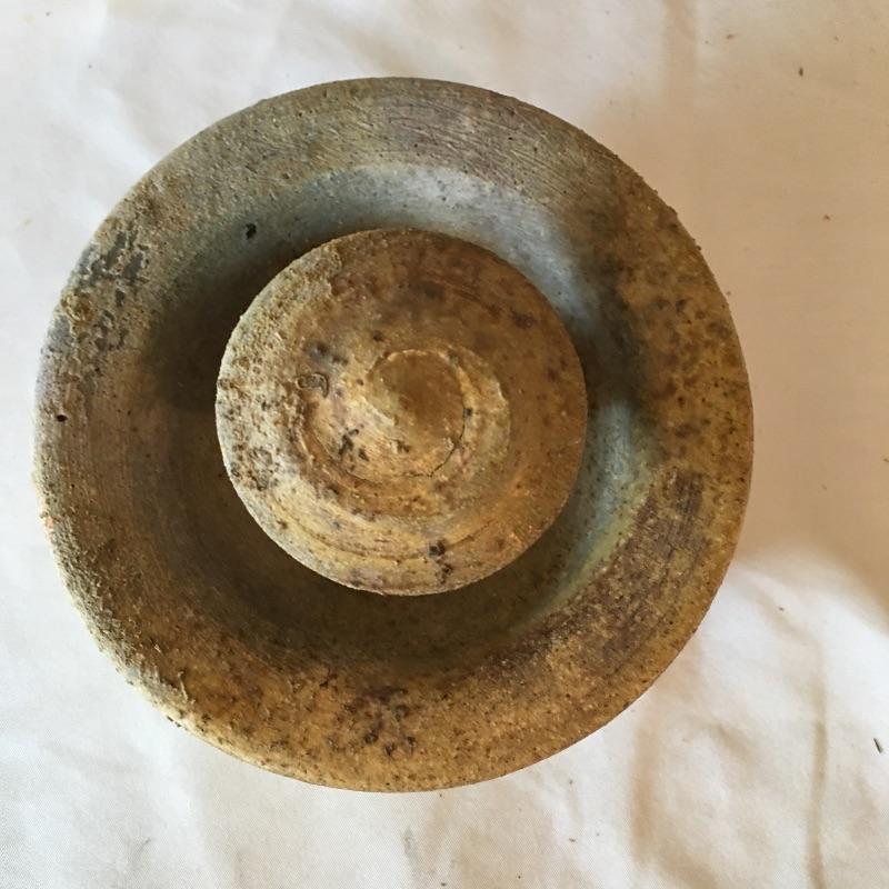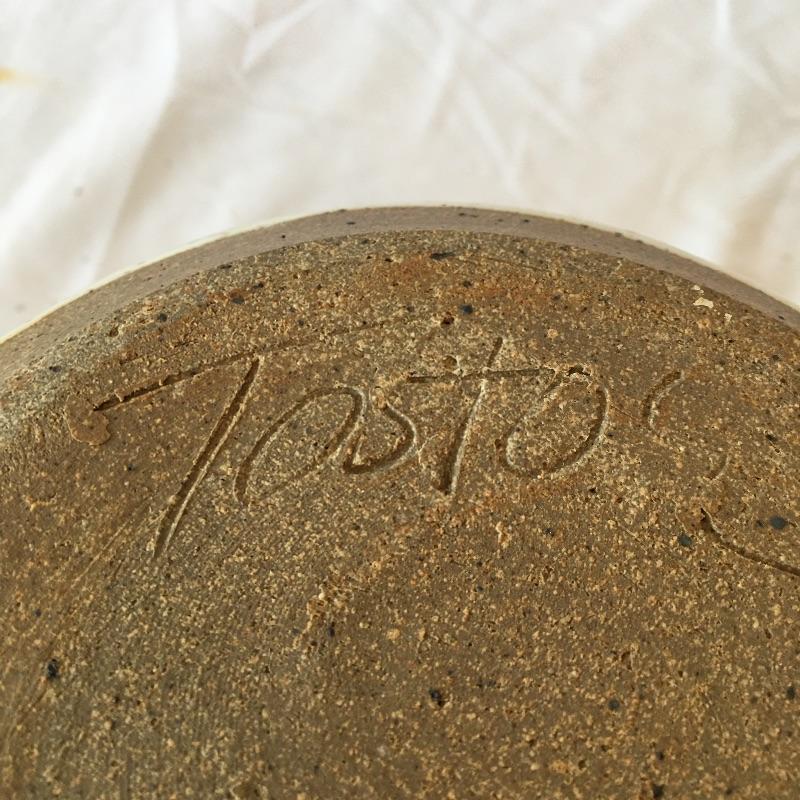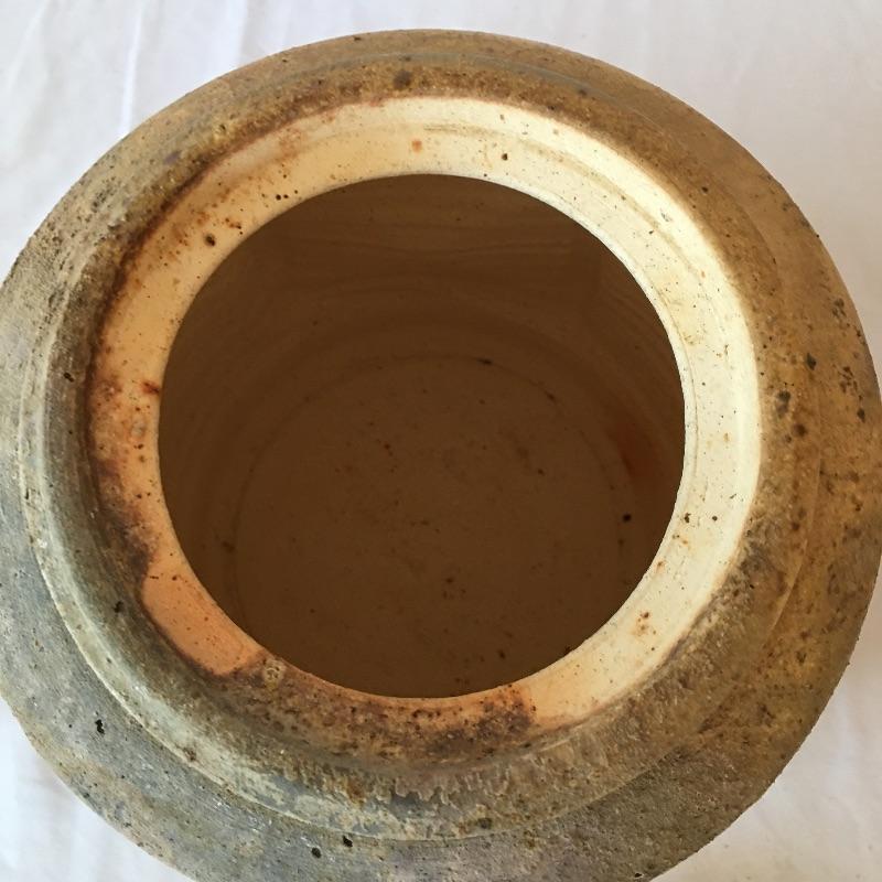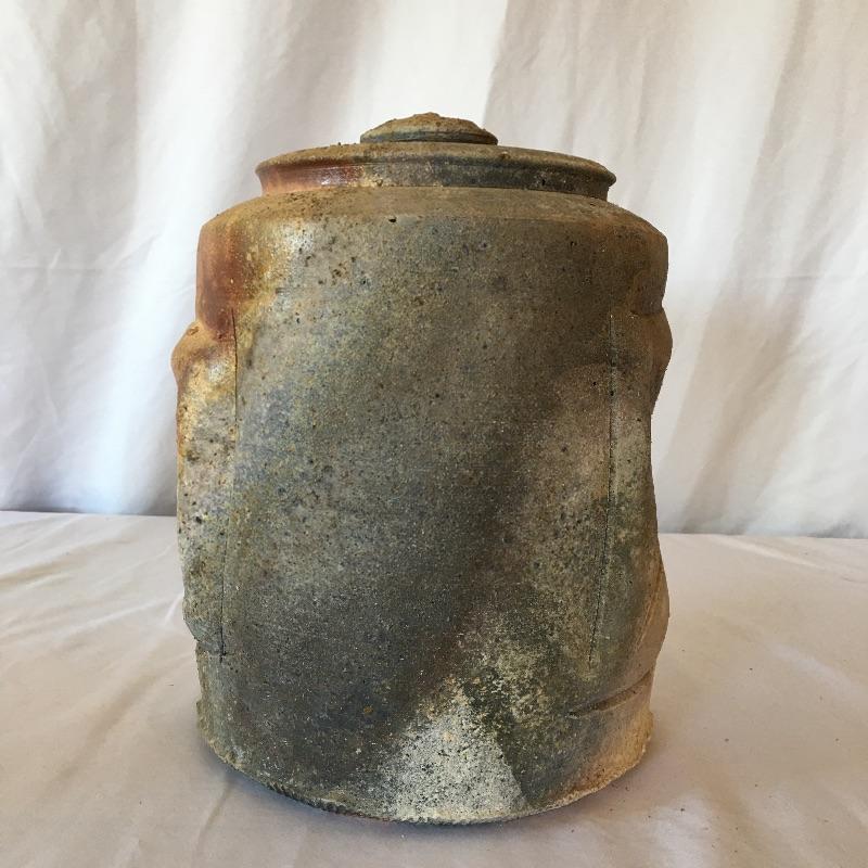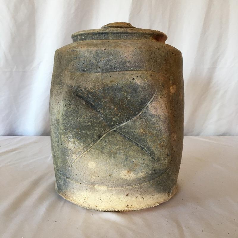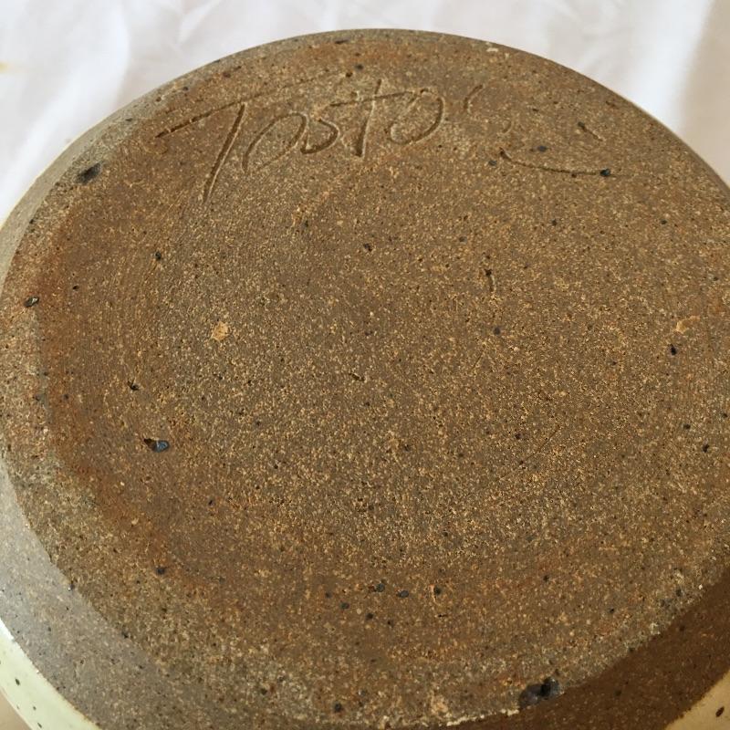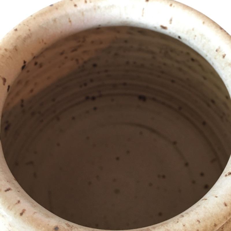 This dynamic duo of pottery canisters includes one marked Popcorn with a cork lid and is signed and the second one has lid and appears the finish is worn on half of the canister and is unsigned. Largest canister measures 8.5” x 11.5”.