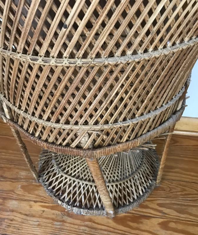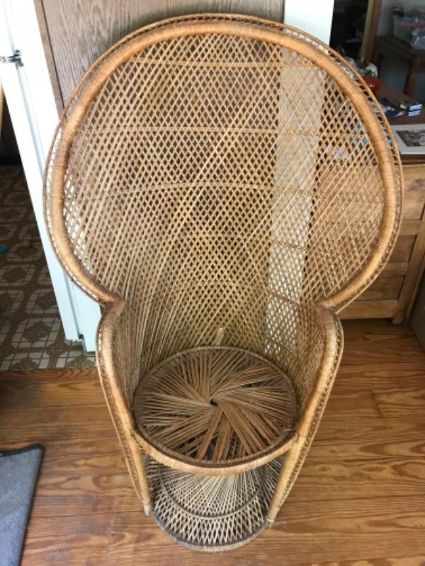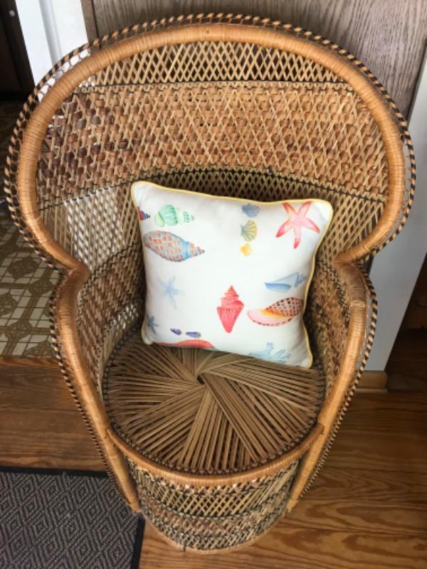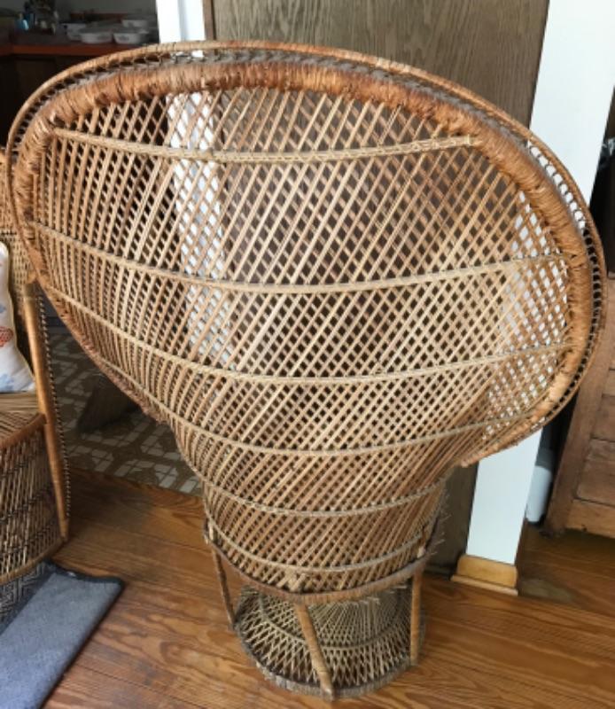 Pair of wicker peacock chairs smaller chair measures 3’5-1/2” tall 2’ wide and 1’7” deep. Larger chair measures 4’2” tall 2’10” wide and 1’7” deep. Small chair is in great condition, large chair has some flaws (see pictures). Comes with a seashell theme throw pillow. These chair do not have cushions . Pet friendly home
