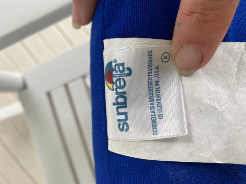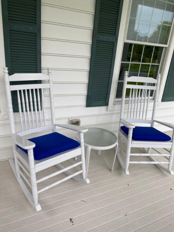 Pair of wooden white porch rockers with one plexiglass metal table and Sunbrella Royal blue cushions