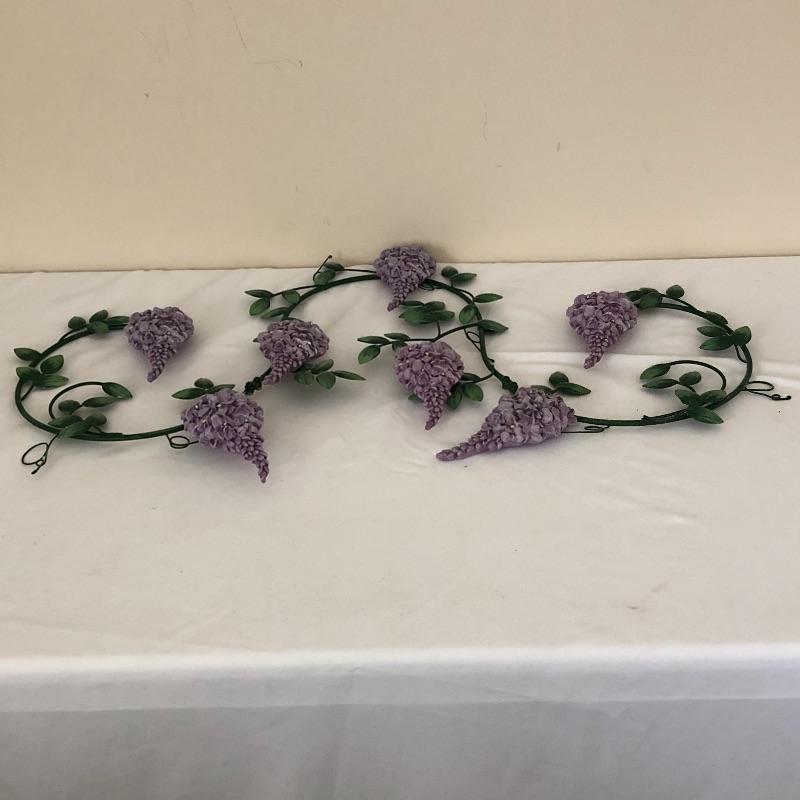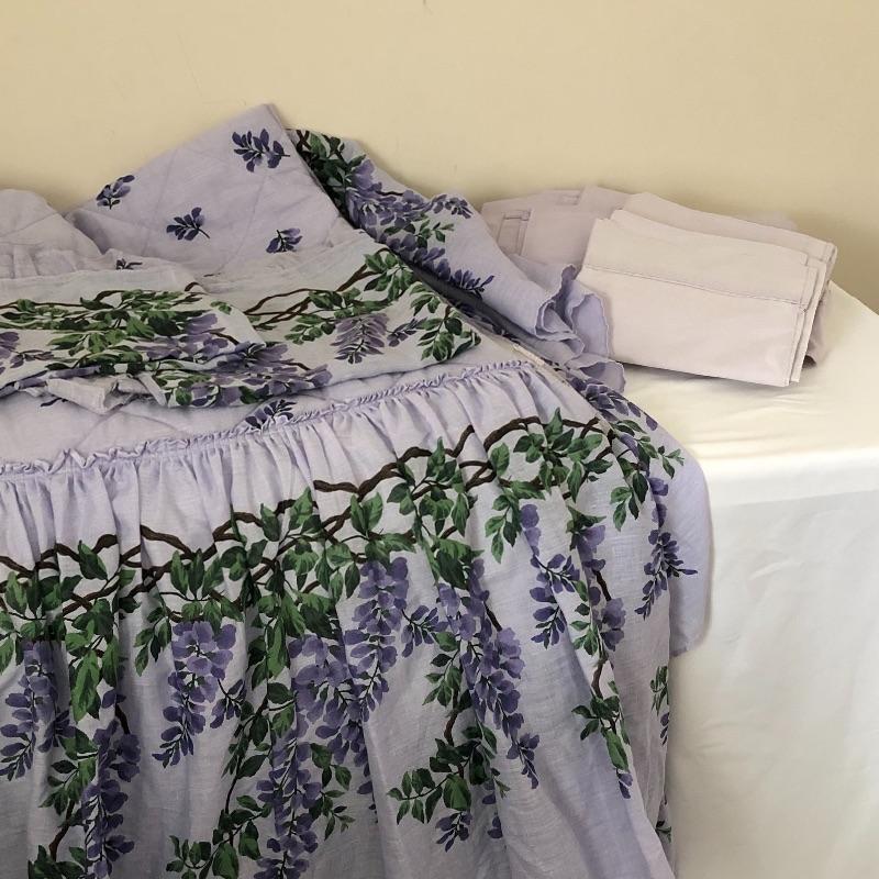 Decorate in style with this lot! Lot includes metal and plaster lilac wall hanging, welcome bench, ceramic decor, two plastic hummingbirds, and linens. Linens include a blanket, bedspread with two matching pillow shams, a set of sheets and six placemats with six matching napkins. Linens and bedspread appear to be queen size. Local pick up only.