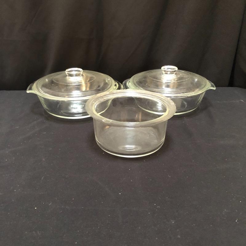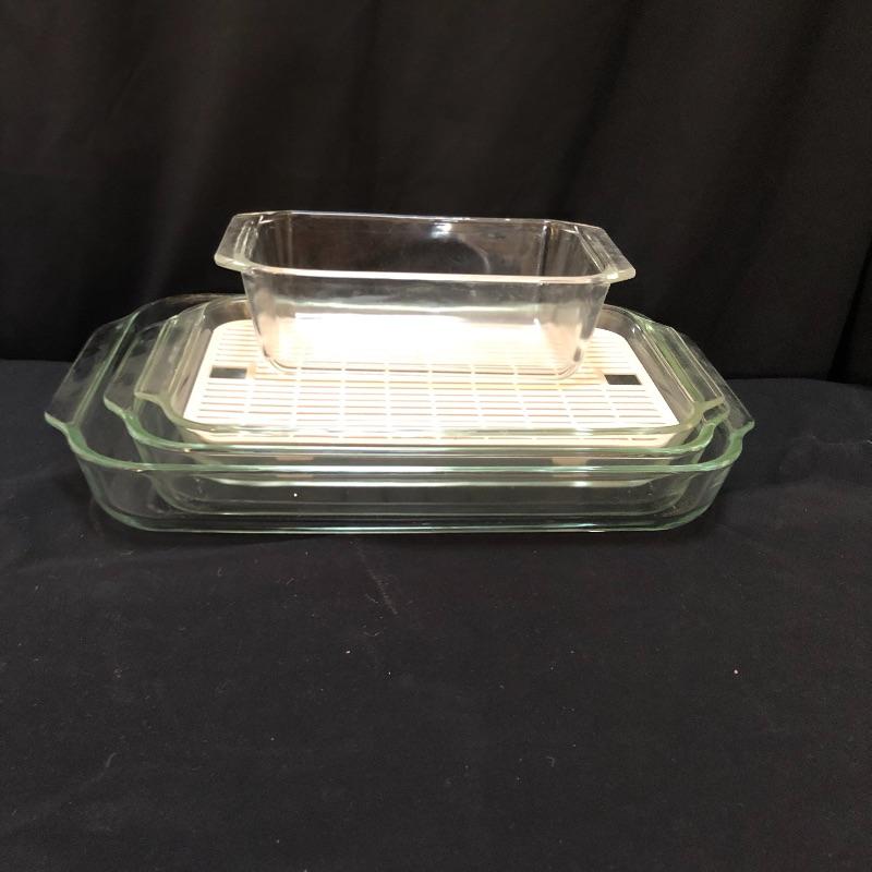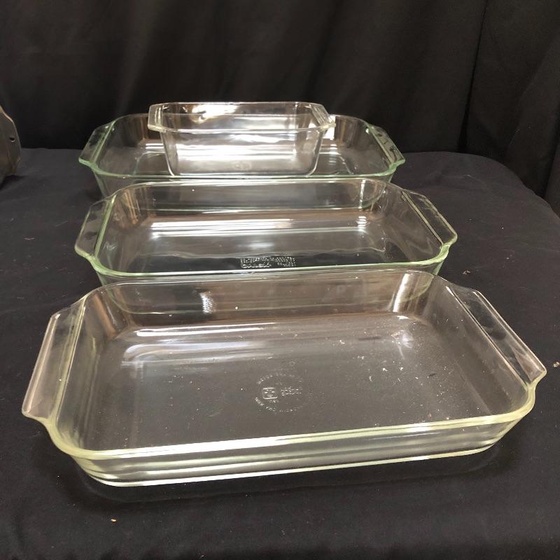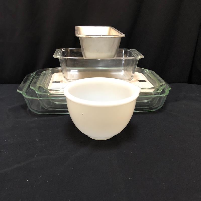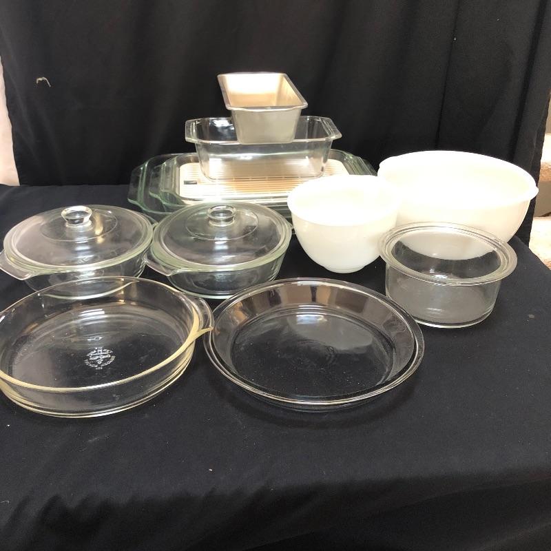 Get these classic dishes for your kitchen. Lot includes three casserole dishes, glass and metal bread pan, two white Glasbake bowls, two pie plates and two round dishes with lids. Largest casserole dish measures 10.75” x 17.25” x 2.25”.
