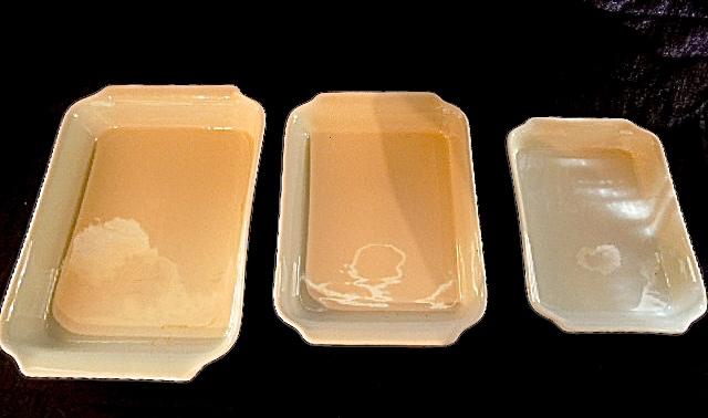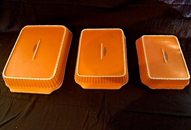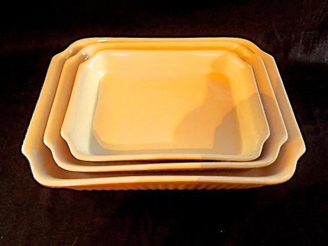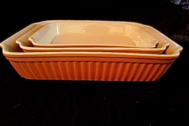 Made by Reco International. 3 lightly used terra cotta colored pyrex glass nesting rectangular casseroles