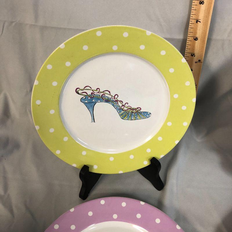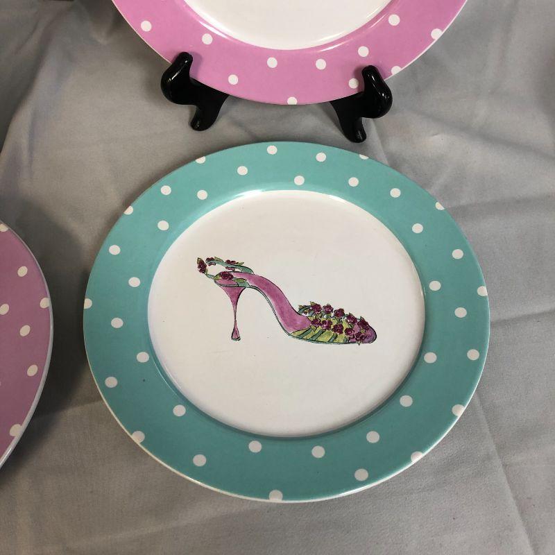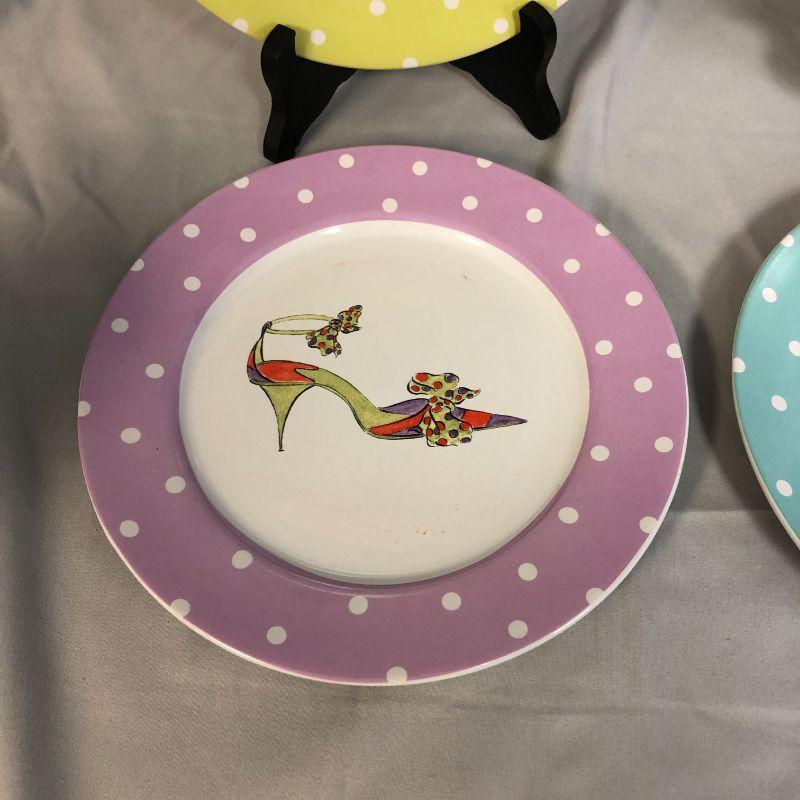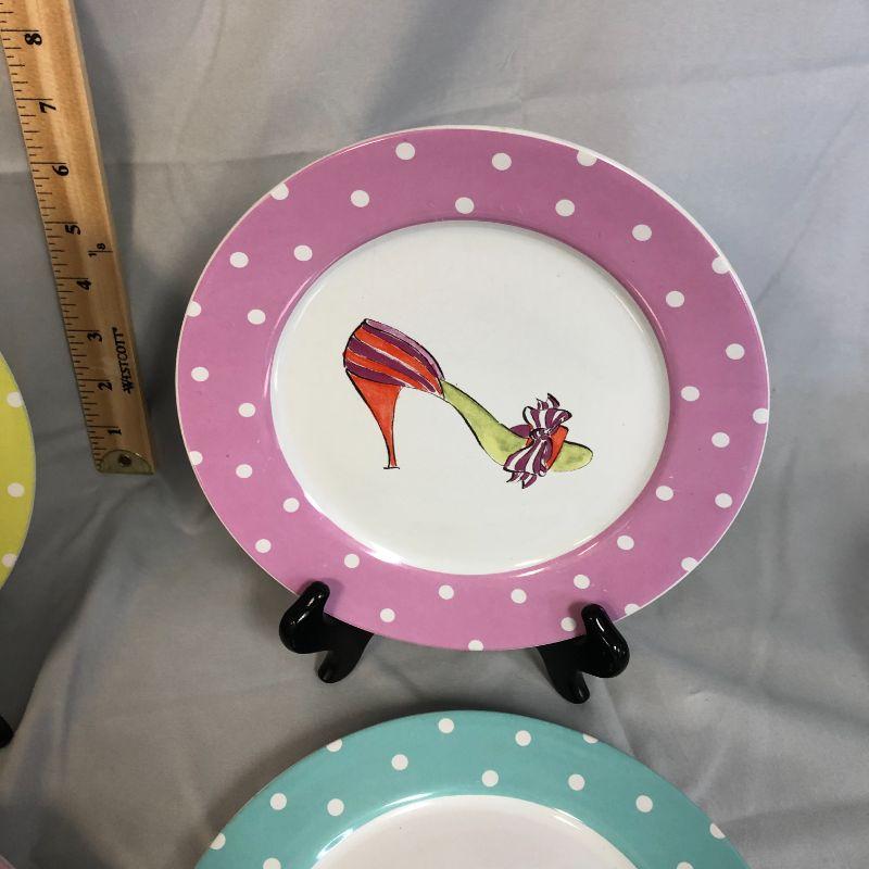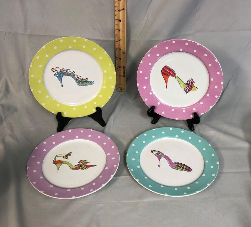 This set of four plates has a different rim color and a different glamour shoe on each. They are each about 8" in diameter and in excellent condition.