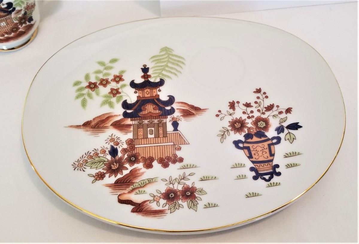 No maker noted, but this complete set of 8 vintage snack sets is quite attractive and in excellent condition. Plates have a small recessed area where the cup sits. 9.5" x 8". They each feature a Chinese temple scene.