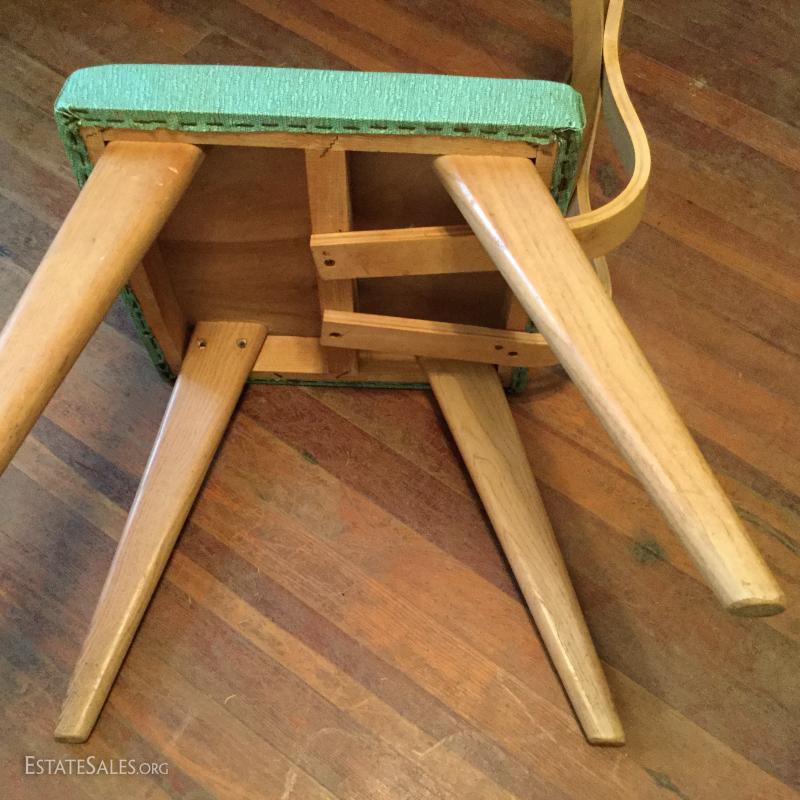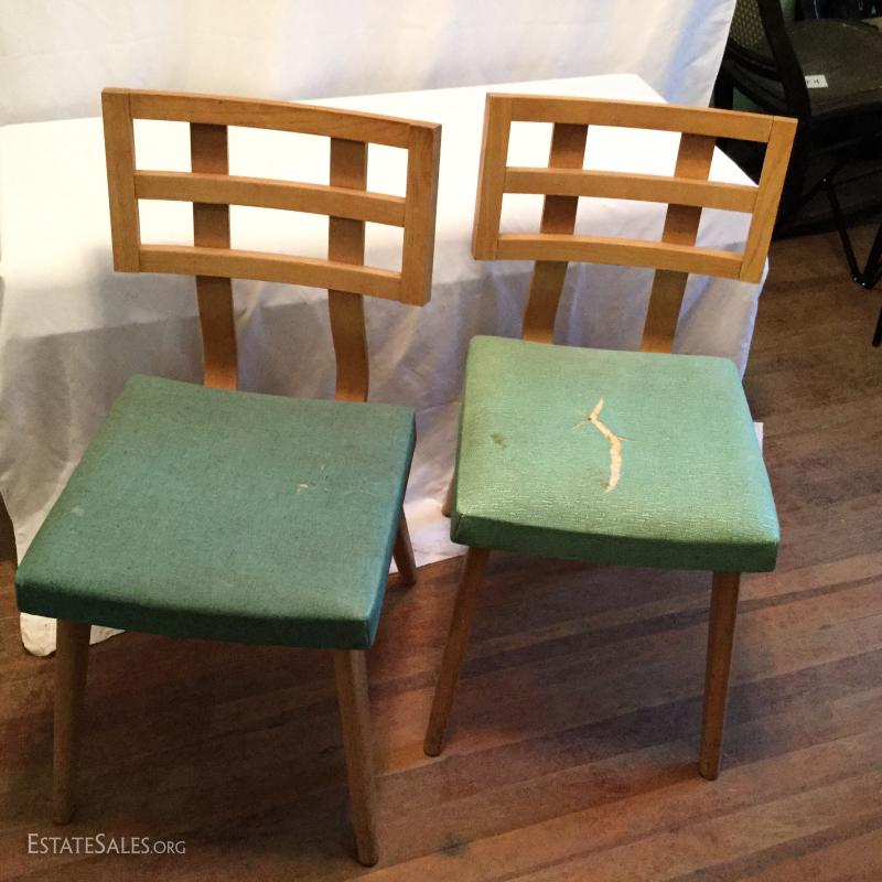 Set of two, bentwood chairs with a blue vinyl seats (both chairs have some damage to seats and would need to be recovered).