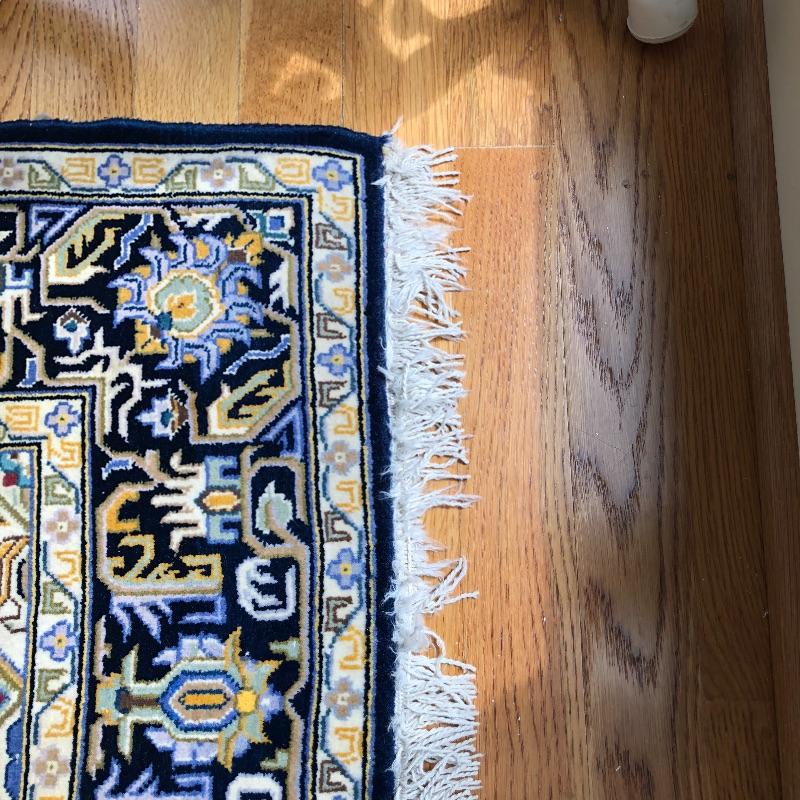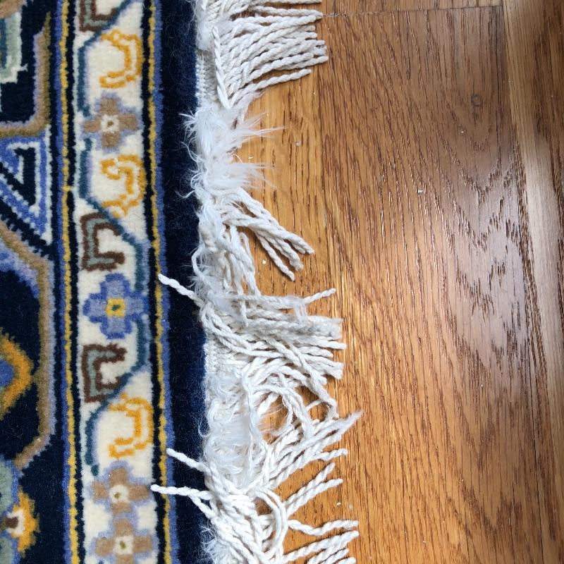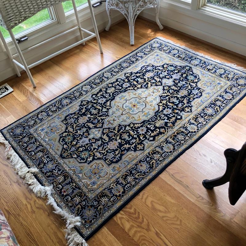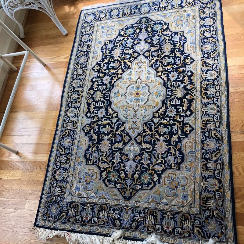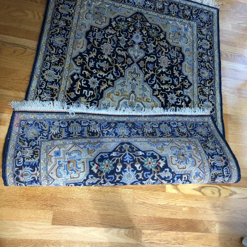 A handy size, this rug measures 42” x 64”. A combination of light to navy blue, this attractive rug is in Good condition with some loss of its fringe in places.