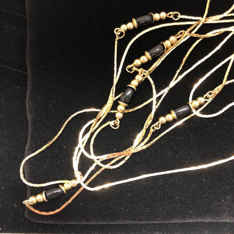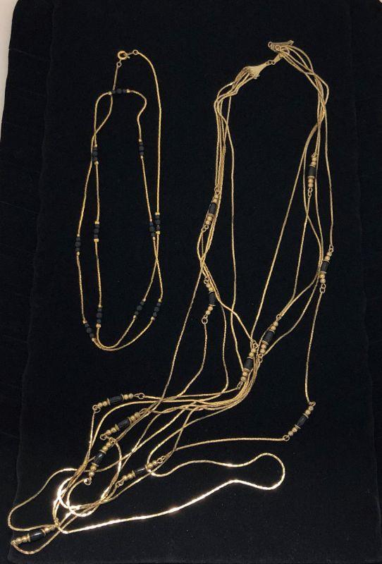 The multi-strand has five strands. Both are gold tone with black beads embellishing. They are in excellent condition. The single strand is about 28" long and the multi-strand is about about 32" at the longest point. Both have spring ring clasps.