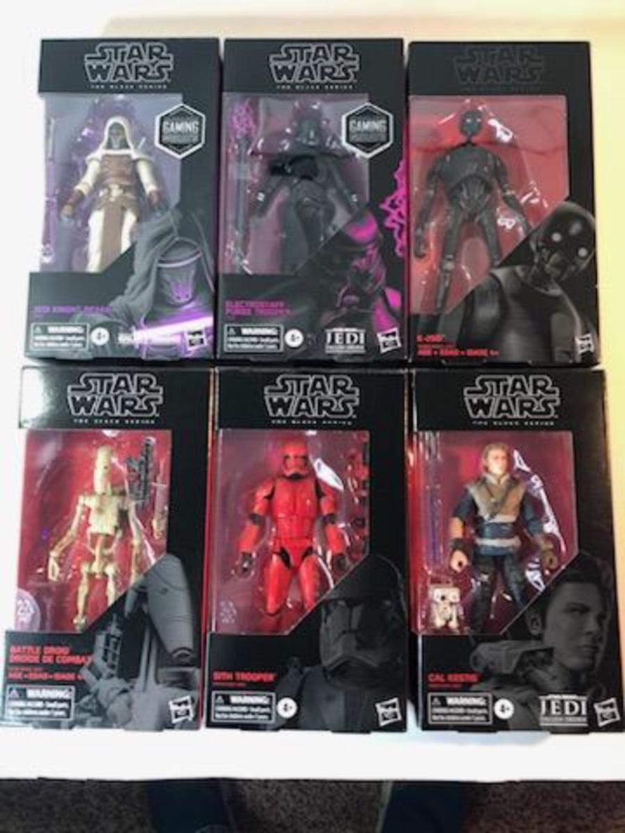 Lot 11 Star Wars 6-6” action figures in original box. Includes; Jedi Knight Revan, Electrostaff Purge Trooper, K-2SO, Battle Droid, Sith Trooper, Cal Keaton