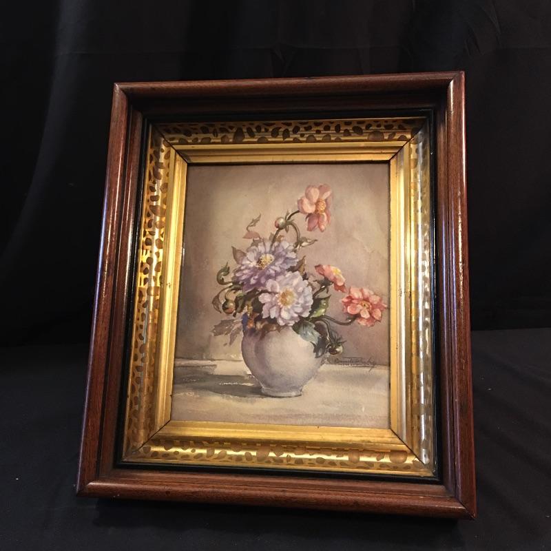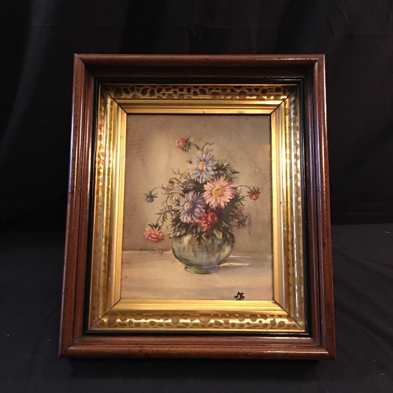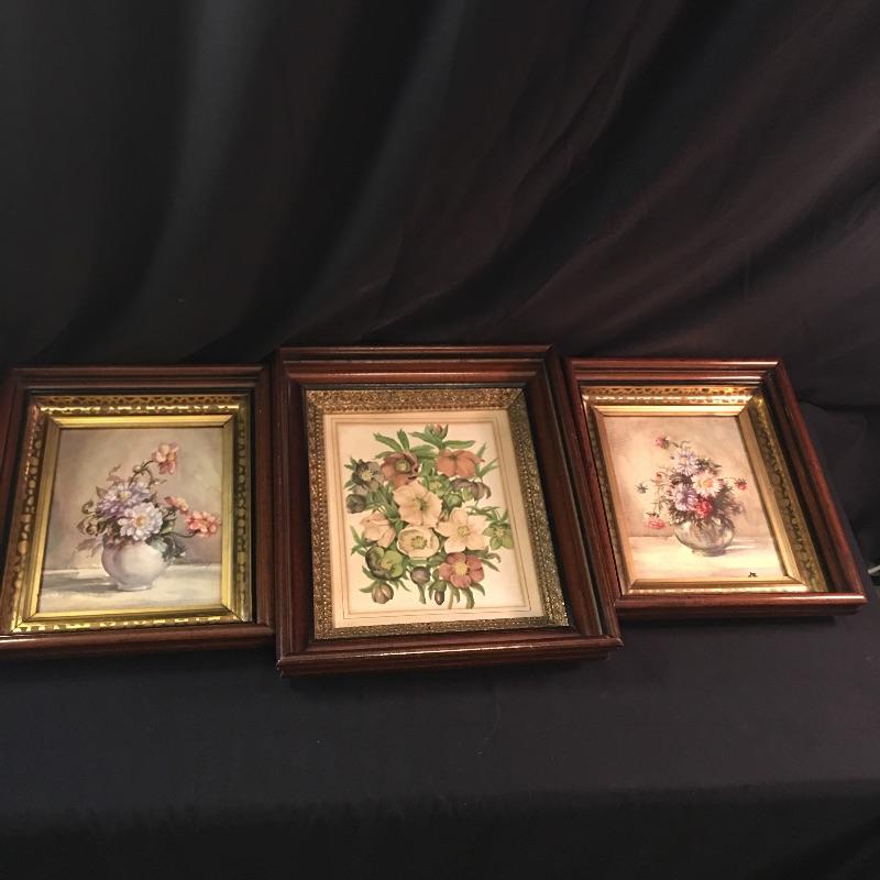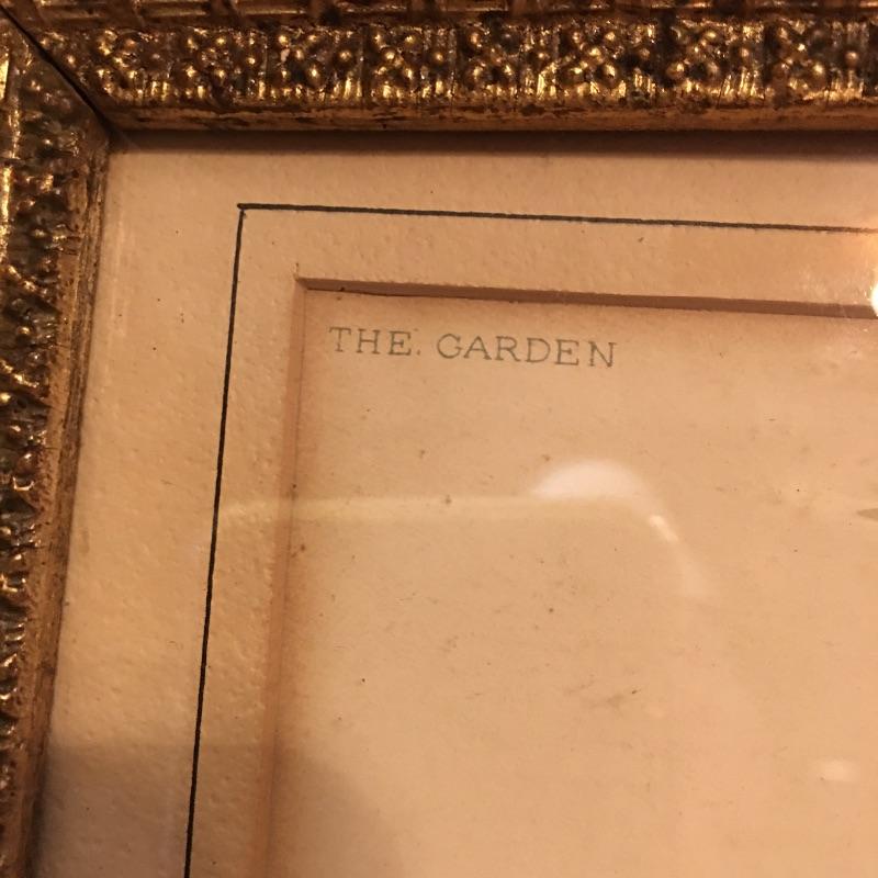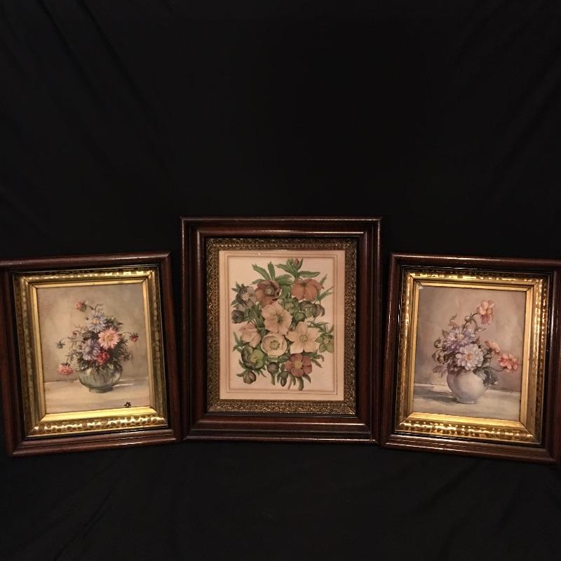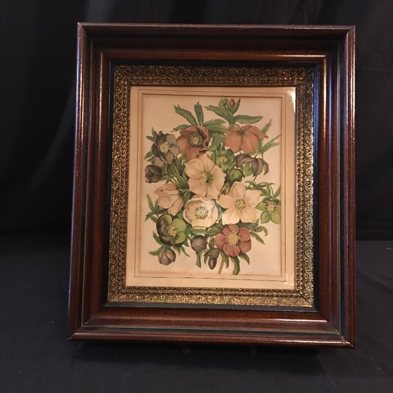 This trio of botanical prints are beautiful pieces of art that are mounted in the most gorgeous wood frames that appear to be antique. The two smaller frames are matching and all three frames are very similar with their dark wood and unique gilded inner frames. These deep almost shadow box style frames set their respective art a full 3.5” deep. The larger art is titled “˜The Garden’ and as each Hellebore flower is numbered, we predict there will be a flower key under the back of the frame. No signature on this piece, but the two smaller pieces are signed, with one having mark on bottom of artwork, see images.