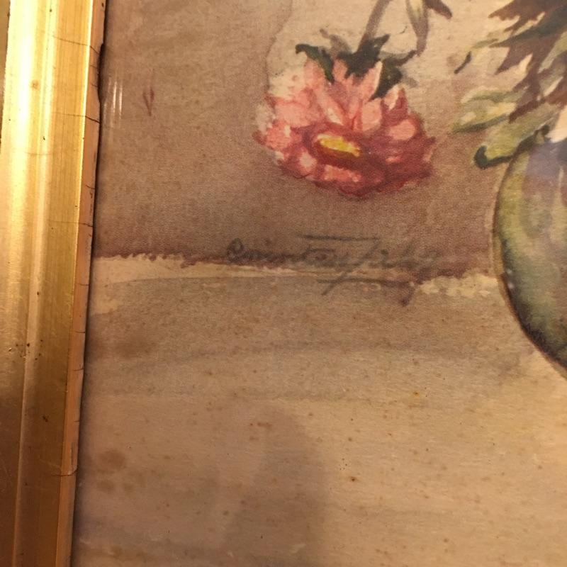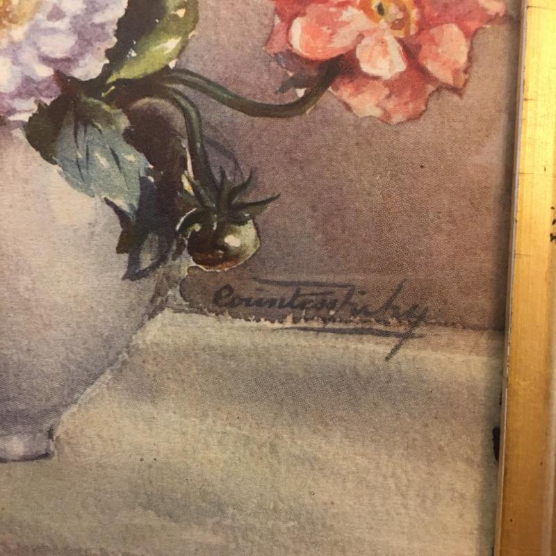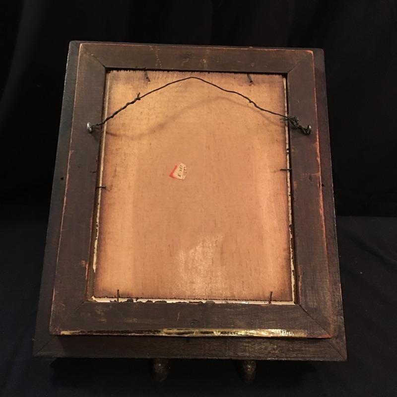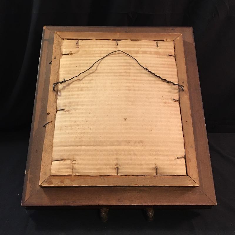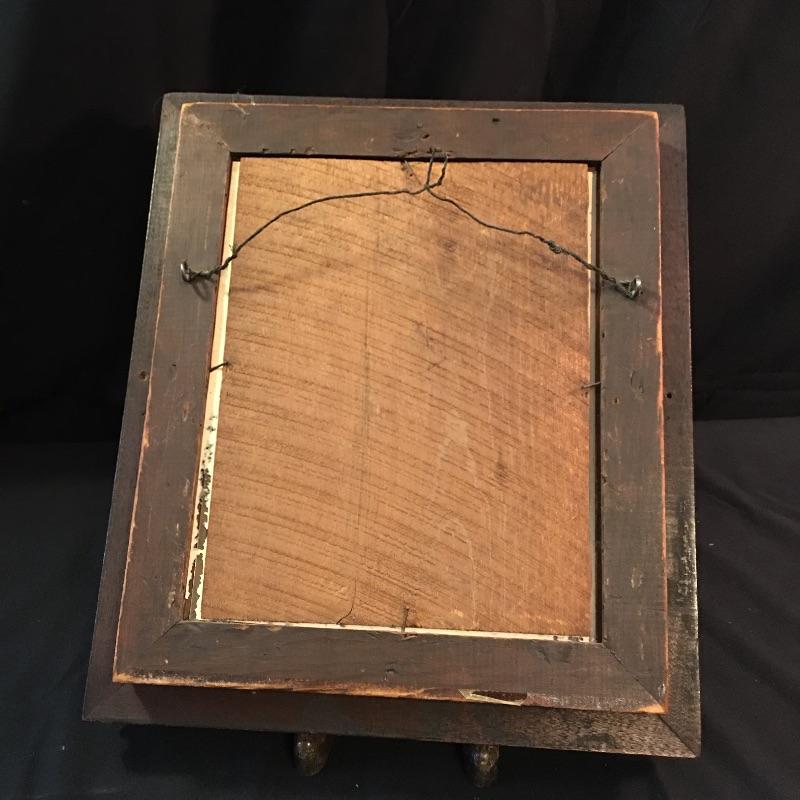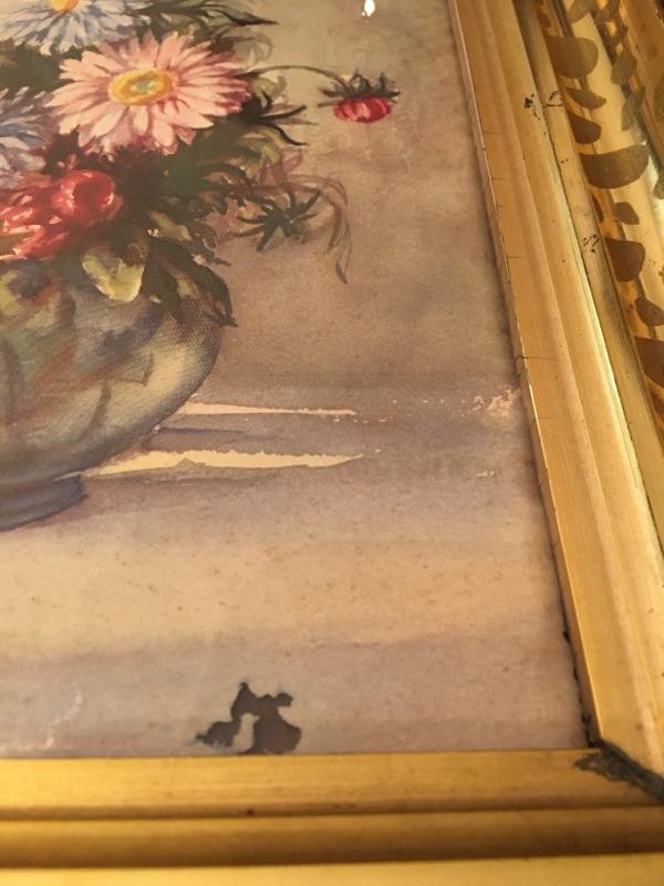 This trio of botanical prints are beautiful pieces of art that are mounted in the most gorgeous wood frames that appear to be antique. The two smaller frames are matching and all three frames are very similar with their dark wood and unique gilded inner frames. These deep almost shadow box style frames set their respective art a full 3.5” deep. The larger art is titled “˜The Garden’ and as each Hellebore flower is numbered, we predict there will be a flower key under the back of the frame. No signature on this piece, but the two smaller pieces are signed, with one having mark on bottom of artwork, see images.
