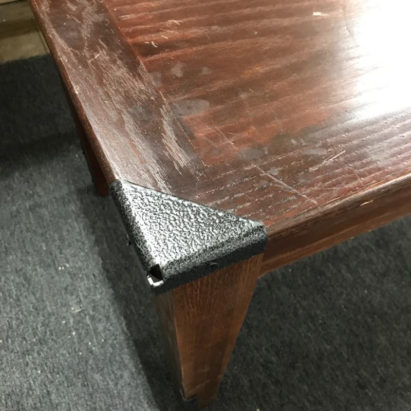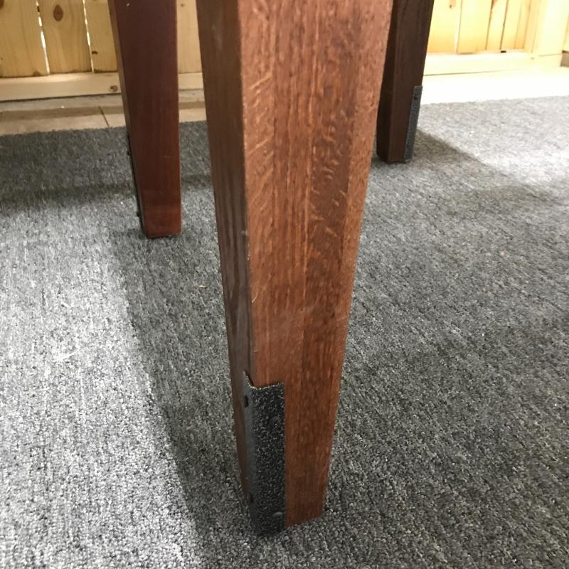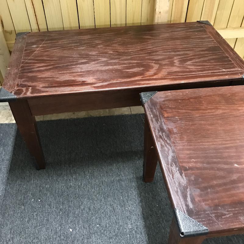 Pair of dark colored mixed wood tables. Metal accents. A few dings. Some pressed wood. Heavy. Each Measure 45.5” x 24” x 22.5”h No shipping. Local pick up only in Maggie Valley, NC.