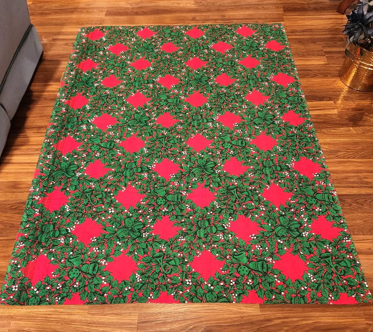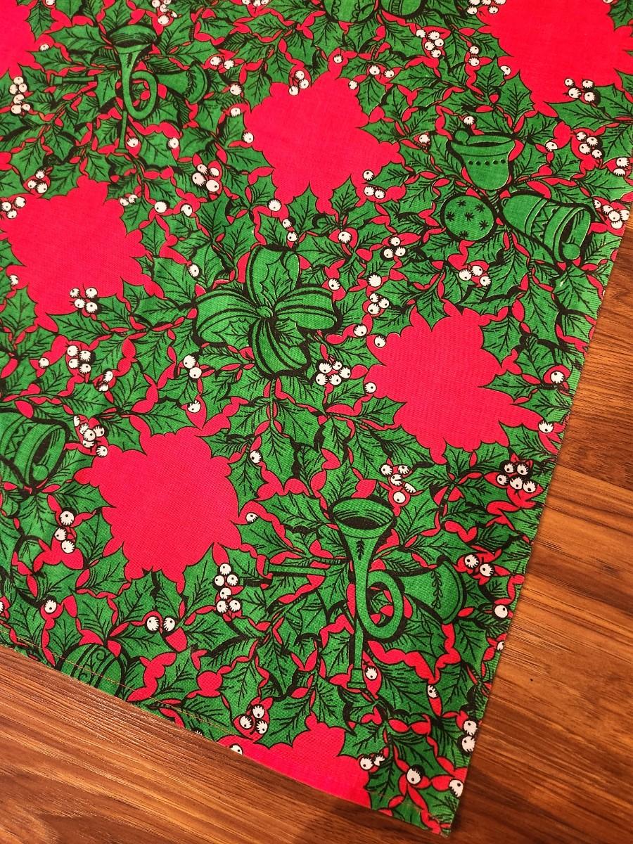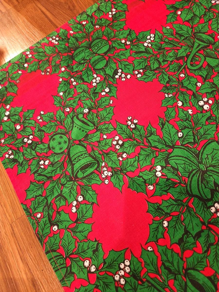 MCM Vintage Christmas tablecloth - cotton fabric - hemmed at each end. 52" across, 66" long. Colors still rich and vibrant - good condition. Late 1960's. early 1970's.