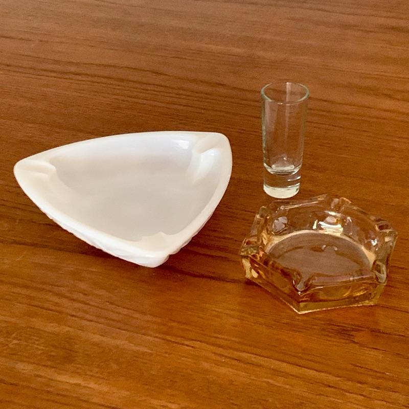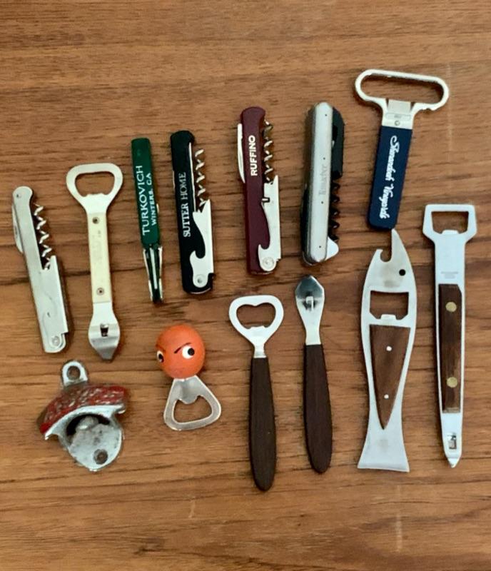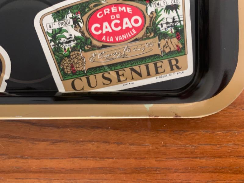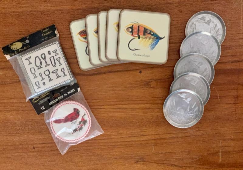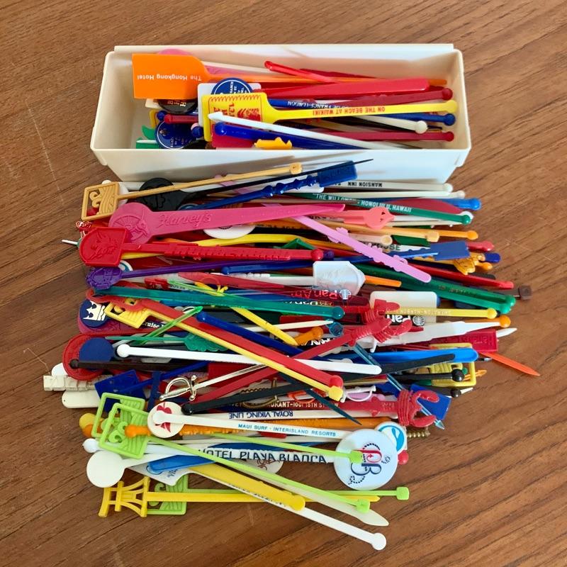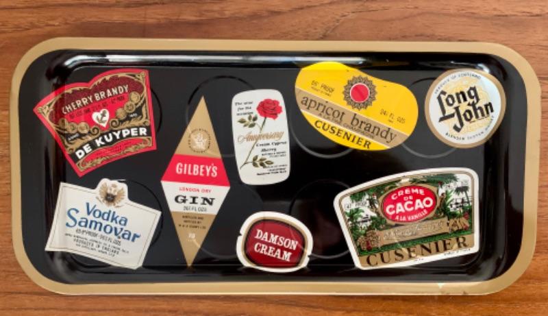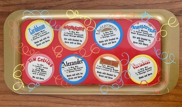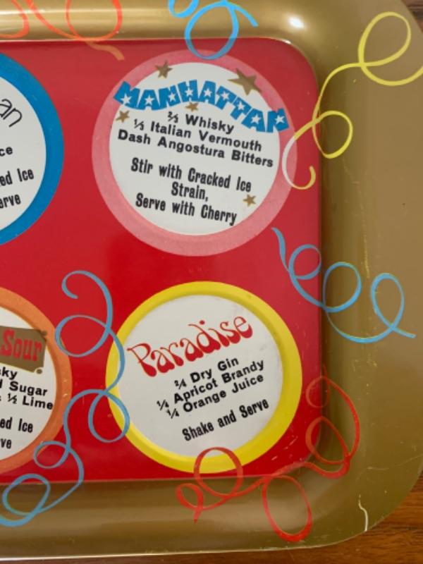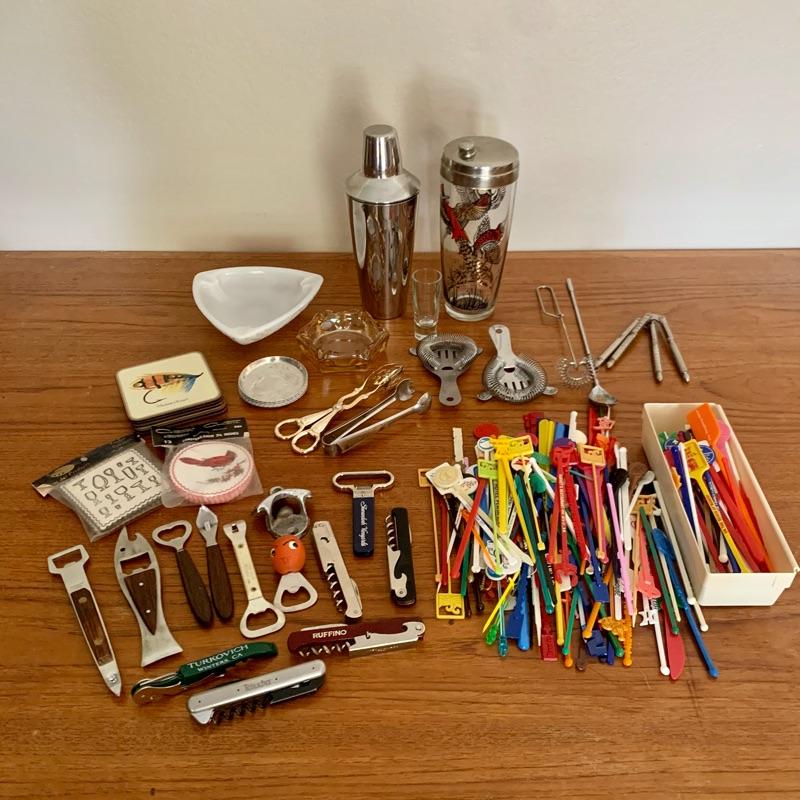 2 metal trays with drink recipes for liquor ads. Caribbean tray has Handiware, made in England print, other appears unmarked. Very little wear, less than typical for age. Each tray measures 16” x 7 3/4,” 2 Cocktail Shakers, 1 glass with red, black and gold pheasants, 1 stainless steel, Irvinware. No nicks chips, dents. Typical wear for age. Top for metal shaker appears stuck. Various vintage bar tools, can openers, corkscrews, 2 pair tongs. All in excellent condition with minor use. Approx. 200+ plastic swizzle drink sticks snd toothpicks /appetizer picks from various hotels, airlines, travel destinations. Vintage coasters; 5 square with fishing lure designs and cork back, 5 round aluminum with embossed wildlife duck scene, 2 packs of unopened, vintage paper coasters. Long stirrer spoon, very worn. 2 metal strainers, 1 metal mixer /beater and 2 metal nutcrackers, all in great condition, 1 shot glass, 2 ashtrays, 1 cut milk glass and 1 iridescent octagon shape. Excellent condition.