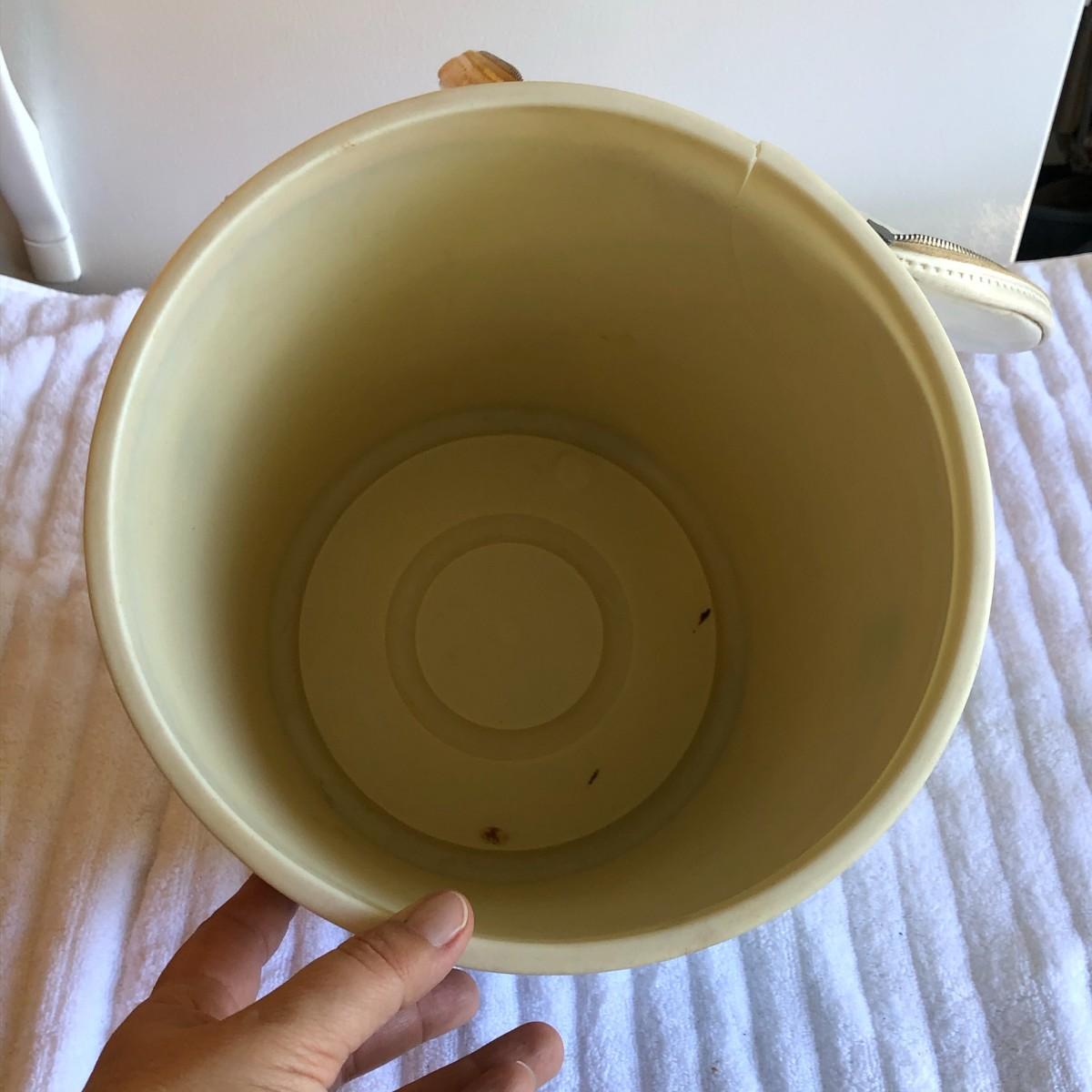 This is 12" tall with hard plastic insert. Only issue is a 4" crack at the top of the plastic insert. The crack should not interfere with usage.