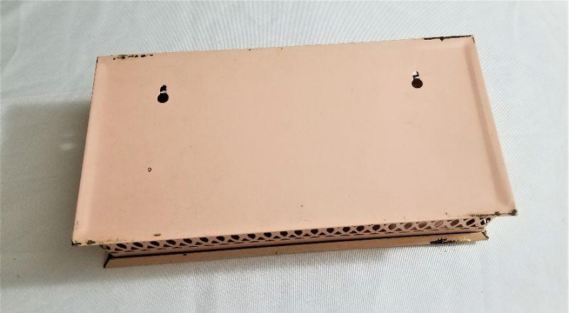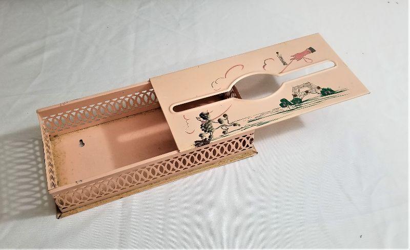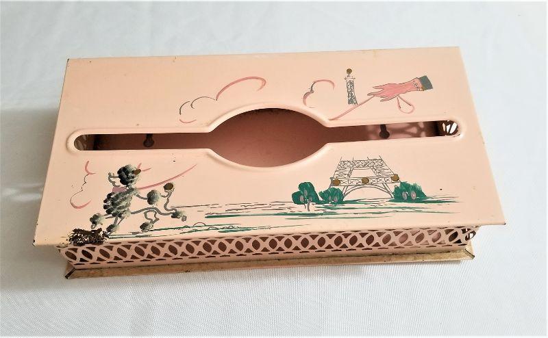 Works flat on your vanity or hangs on the wall - 1960's vintage pink metal Kleenex/tissue holder, painted with scenes of a poodle in Paris. One rust spot (lower edge - as shown). Measures 10.75" x 5.5".