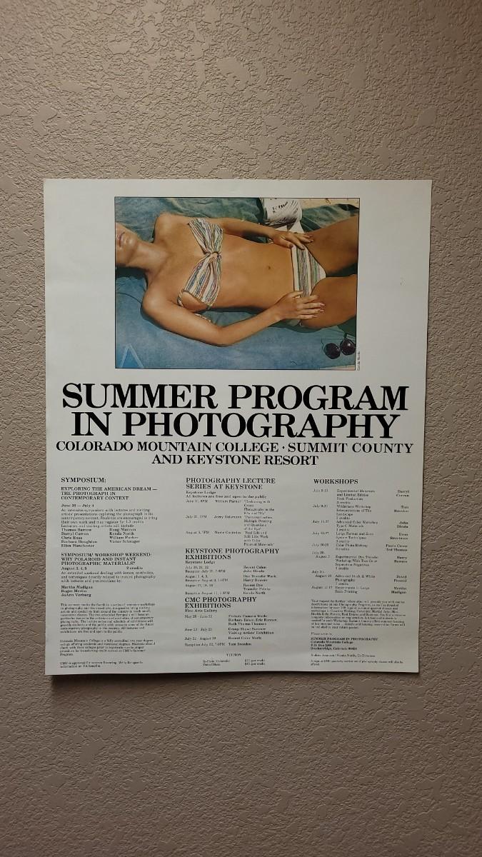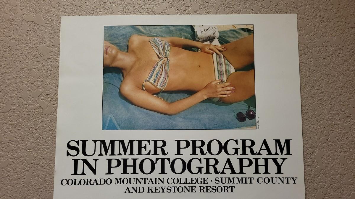 The lot features a vintage poster for the summer program in photography ran by Colorado mountain college. 22" x 17". The highlight of this poster is an original photo by Kendra North. All of the relevant information regarding everything from symposium descriptions to actual exhibition dates