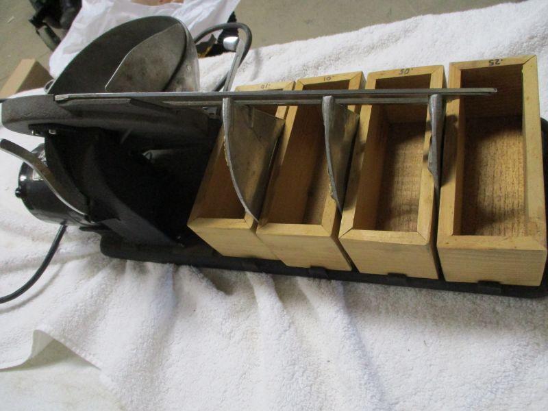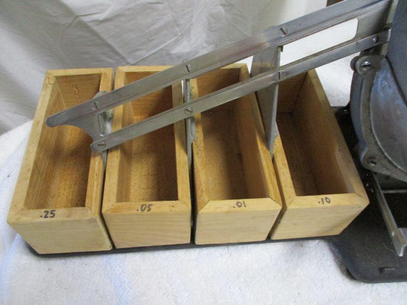 Coin sorter made by W. F. Read & Company, Coldwater Mich. Wheel turns and sorts coins out of the toss-in bin into trays below.