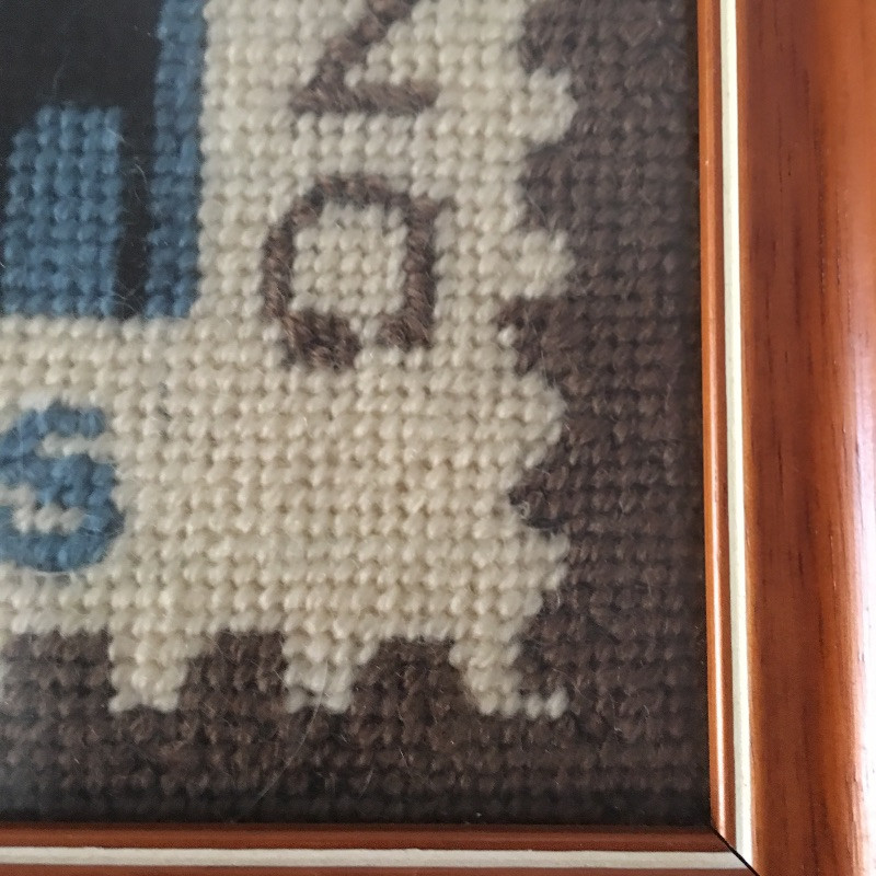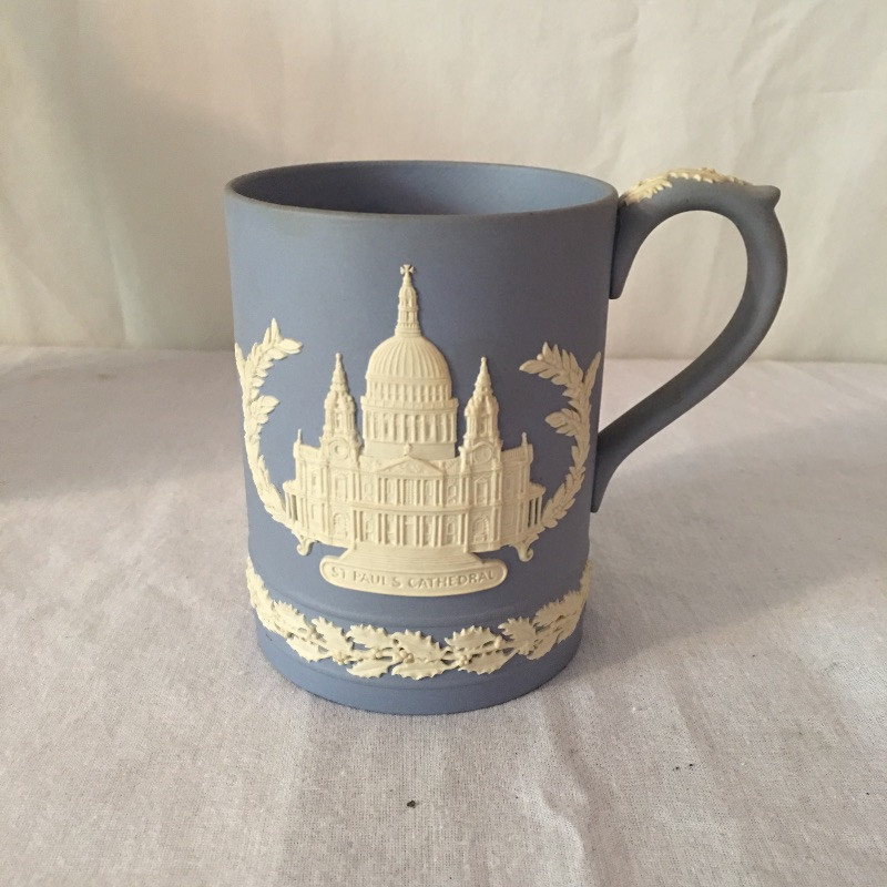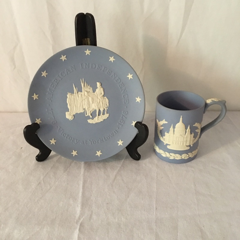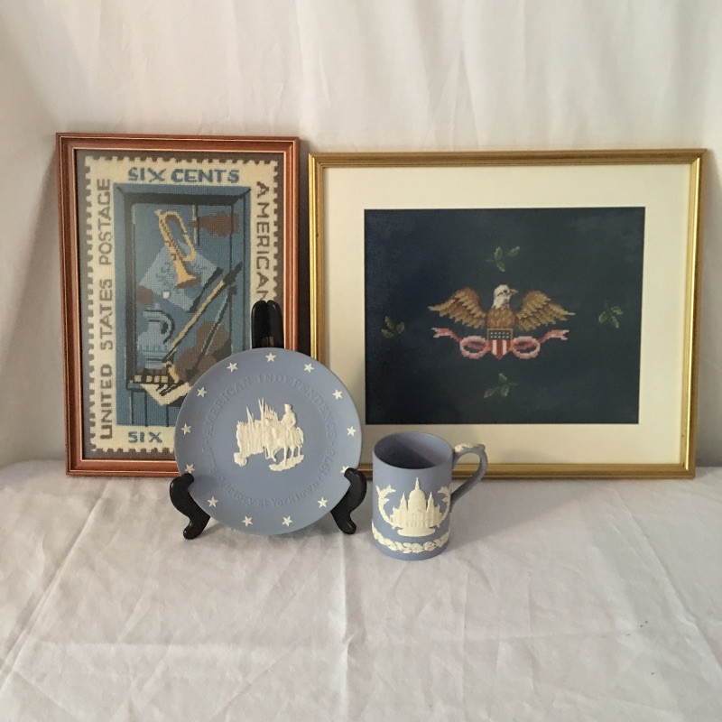 This lovely collection of charming pieces includes a matching Wedgewood plate and mug and two framed embroidered pieces.