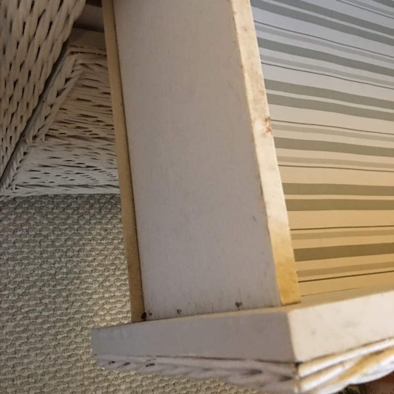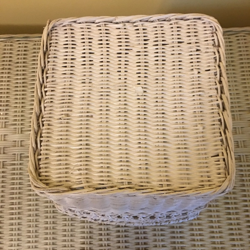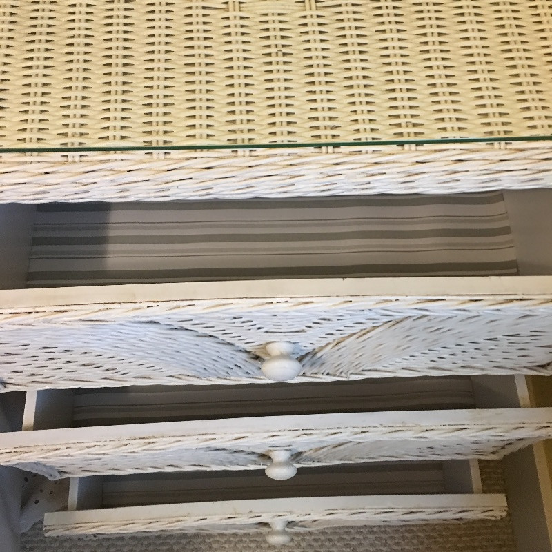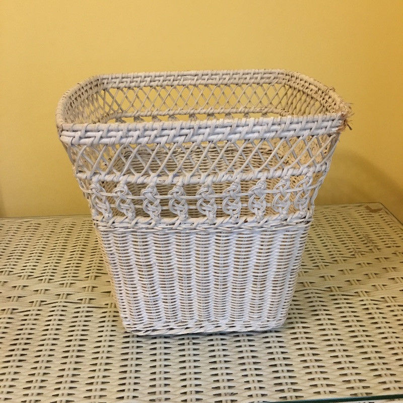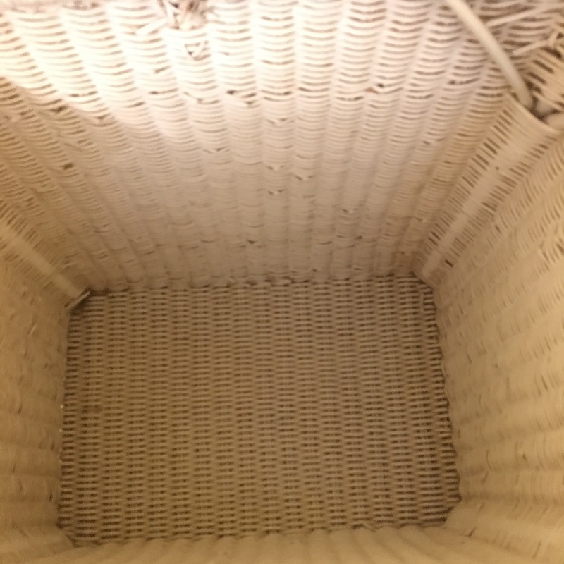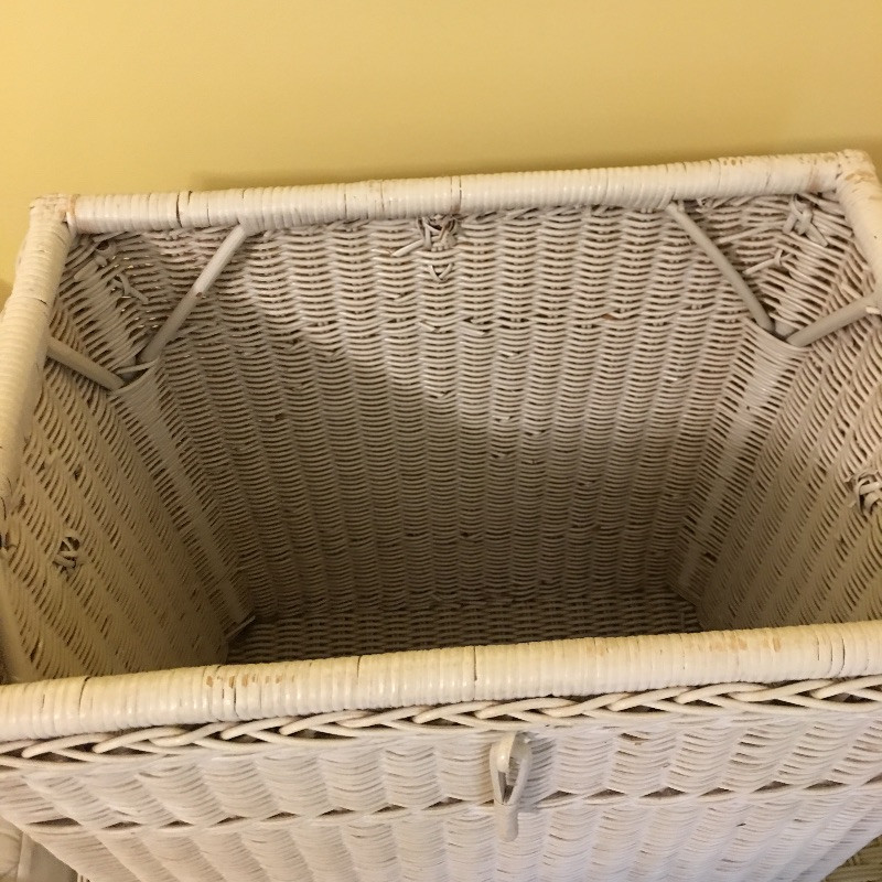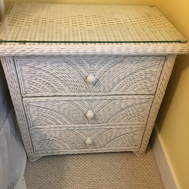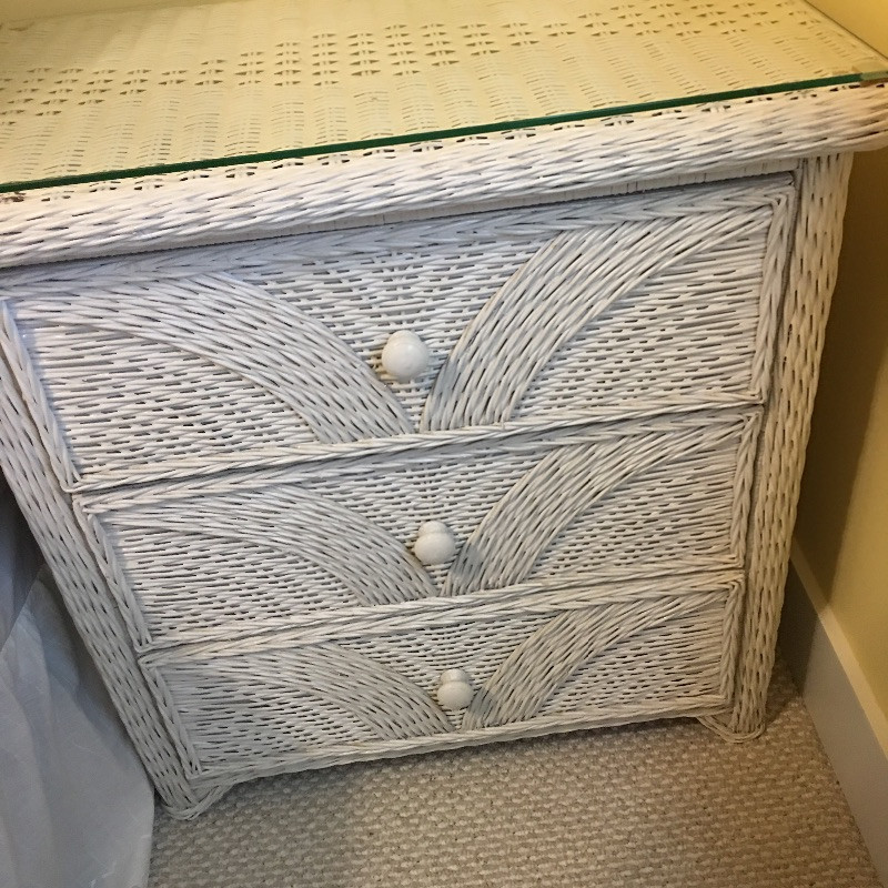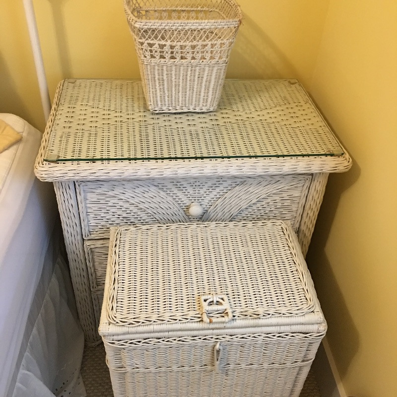 This lovely trio of white wicker pieces will brighten any room and provide great storage options. Included is a good sized end table or bedside table with 2 drawers and a glass top, it has a really nice weave design on it, see images. There is also a hamper and waste basket. Please note the top of the hamper is not attached. End table measures 18.5” x 29.5” x 29.5”.