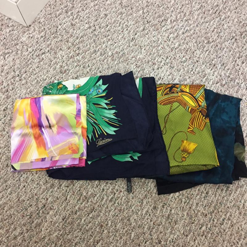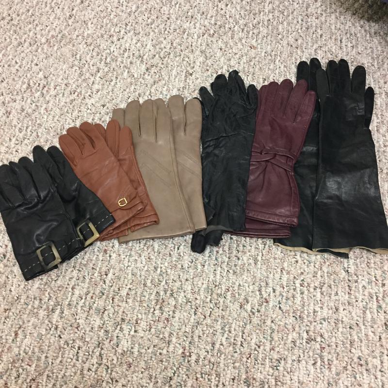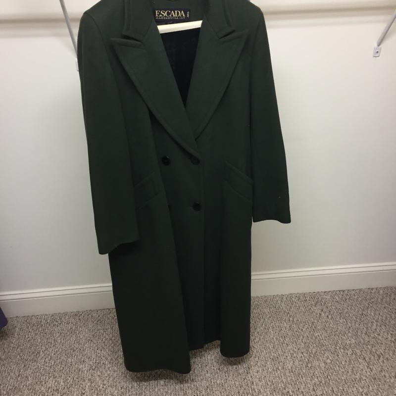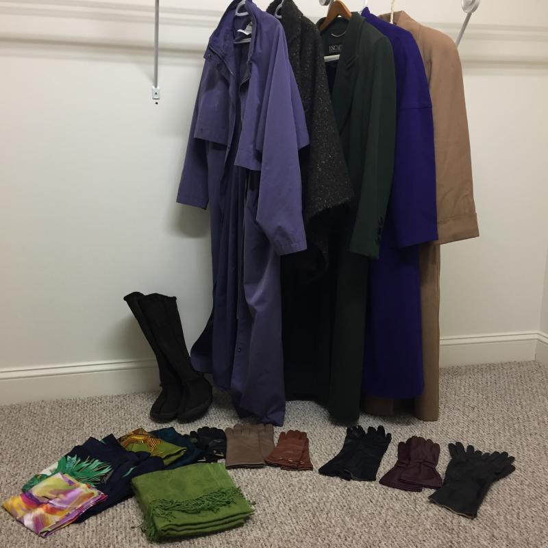 Gorgeous outerwear Escada green wool jacket size 38, Jones New York wool trench coat with wool zip out liner, pair of Patagonia boots size 8.5, several pairs of leather gloves in every color, silk scarves and more.