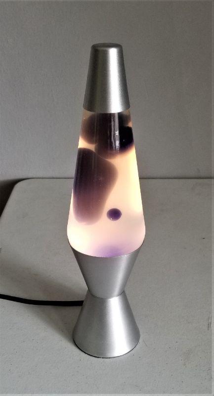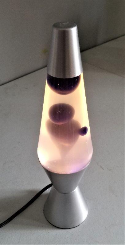 Contemporary lava lamp (pretty groovy) with violet colored "blob". In working condition. A little cloudy, but most of them end up this way. 14" tall.