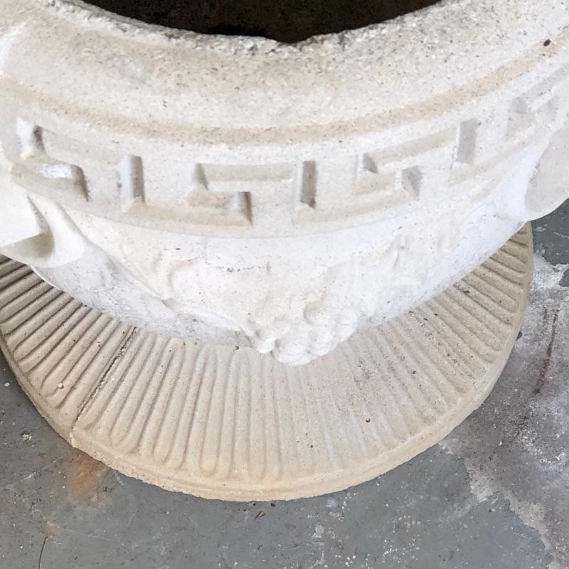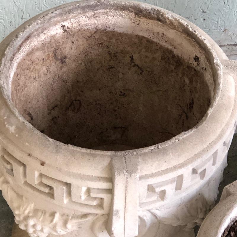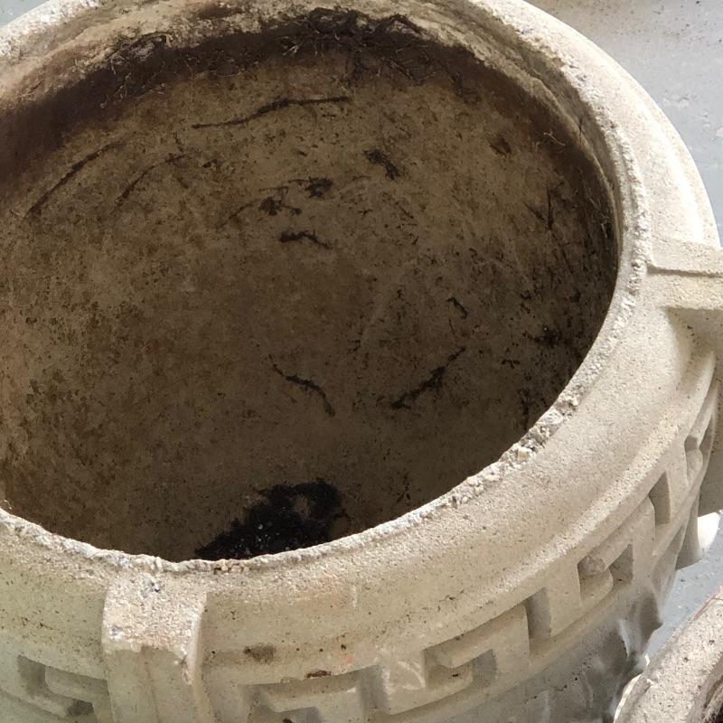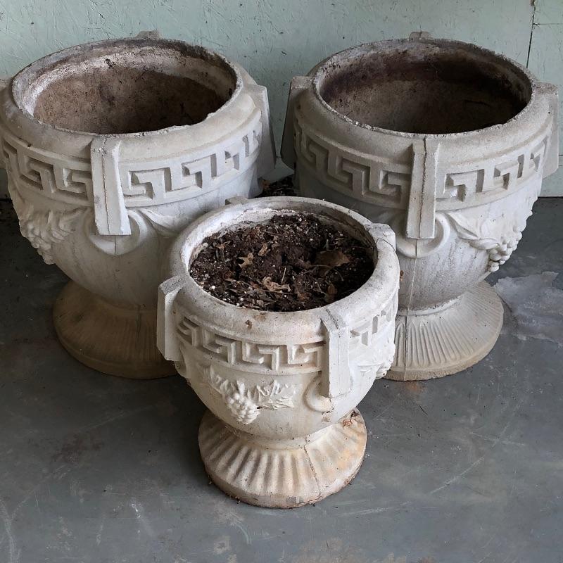 3 matching concrete planters waiting to bring forth life as winter will turn to spring. As an added bonus the smaller planter comes with the soil already in it! Have fun playing in the dirt again.