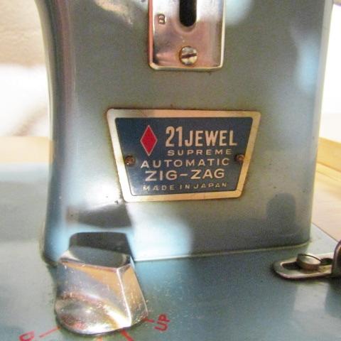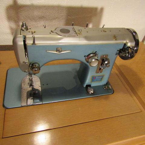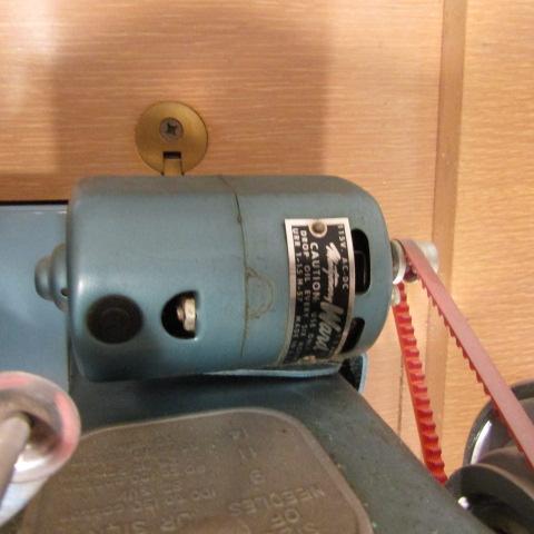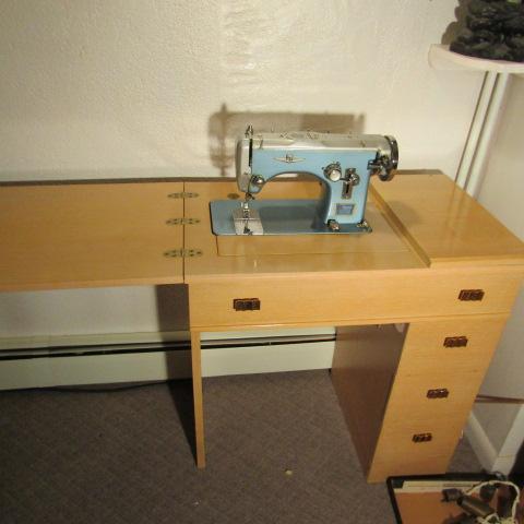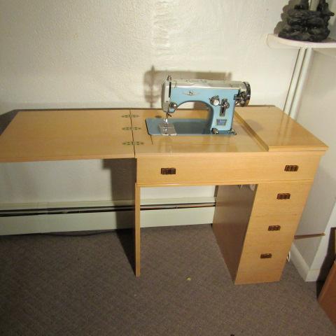 WARDS VINTAGE, ALL METAL SEWING MACHINE IN BLONDE WOODEN CABINET 30" X 18" X 31" WHEN CLOSED