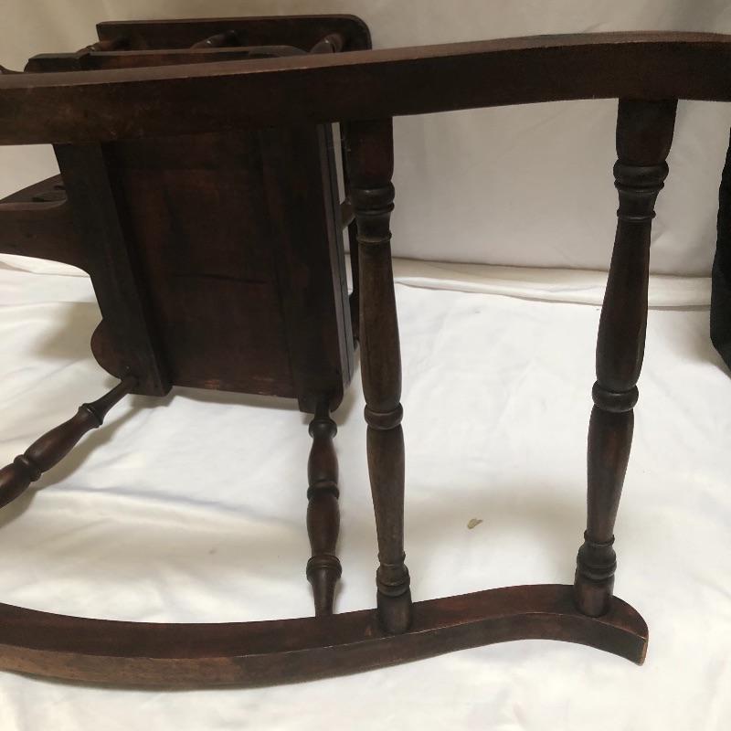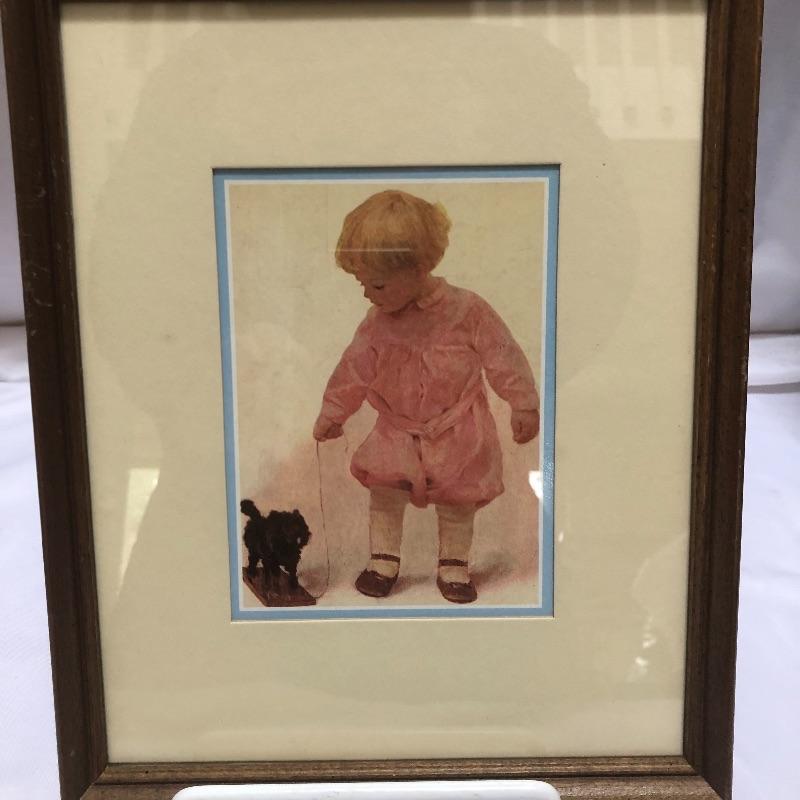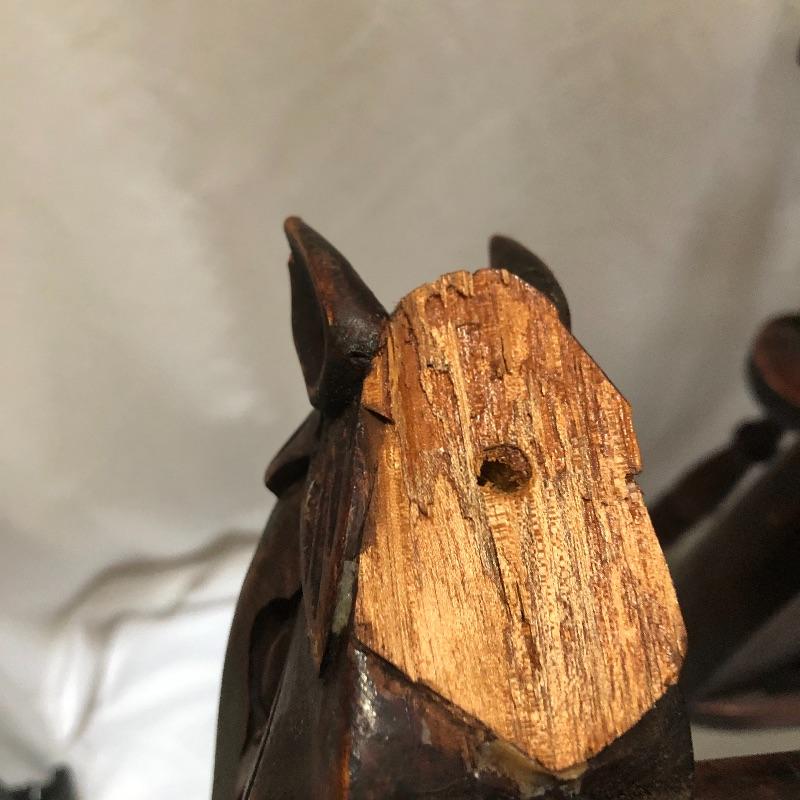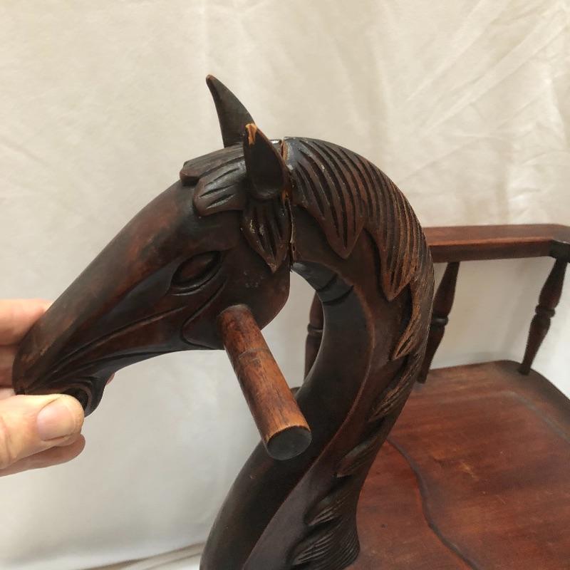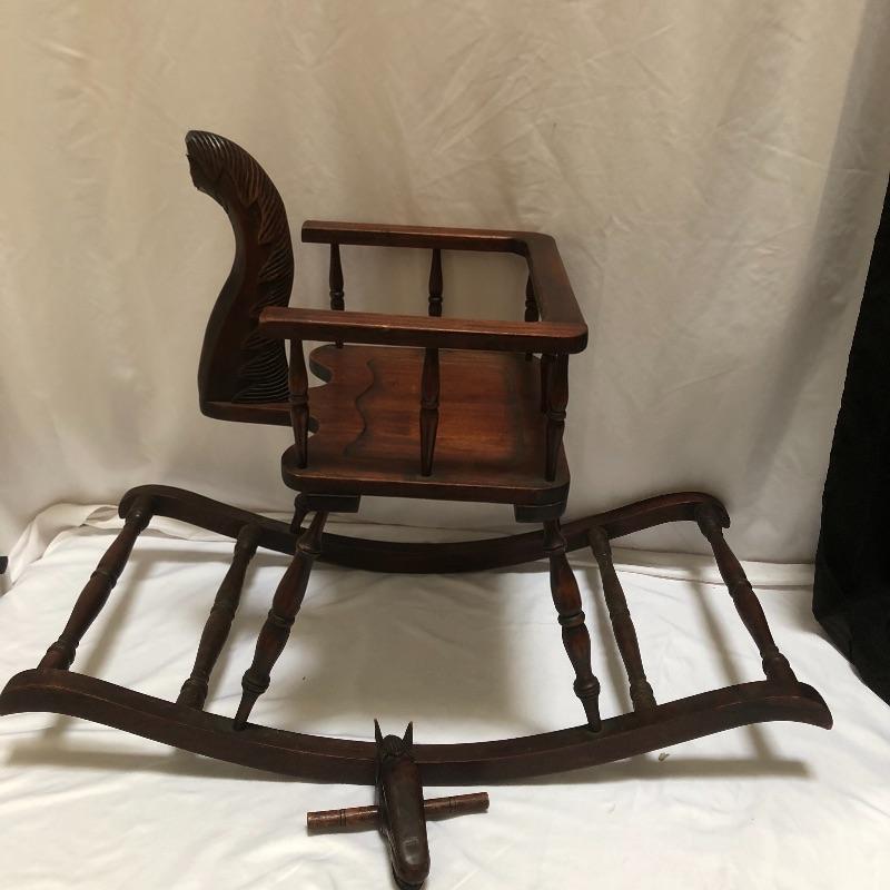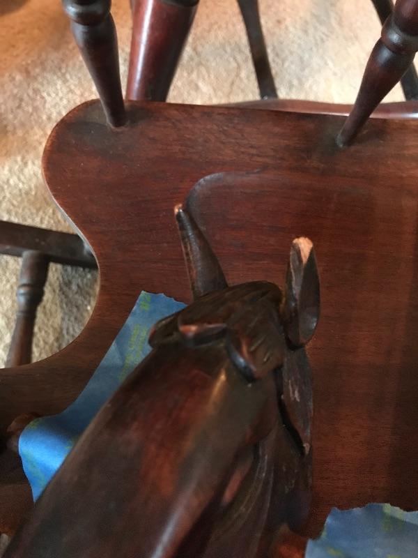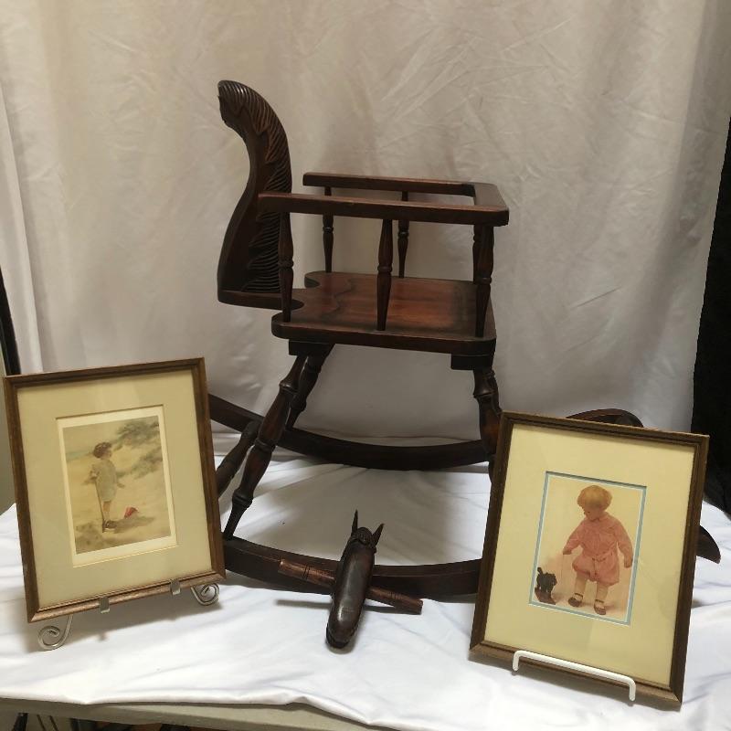 Decorate your home with this lovely rocking horse. Lot includes two matted and framed prints of young children and a wooden rocking horse. Horse has a chip on one ear and needs to have head repaired, see pictures. Rocking horse measures 17” x 34” x 25.5”.
