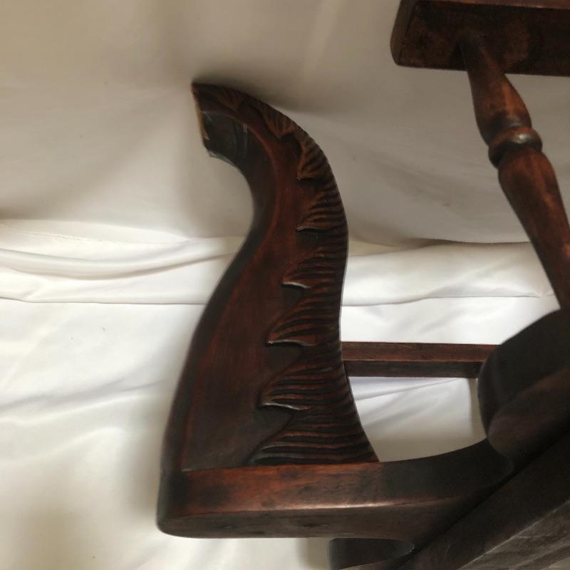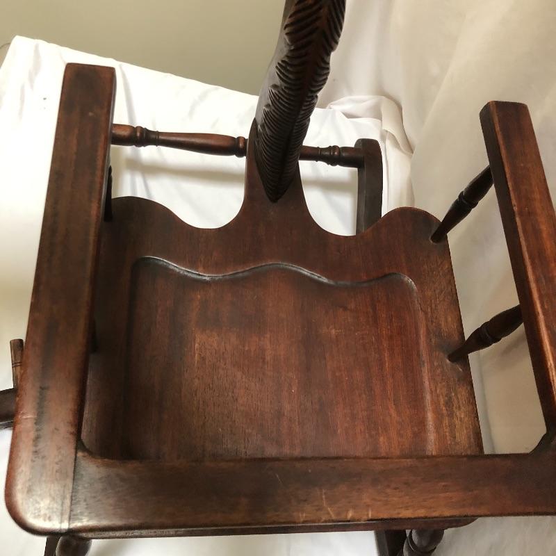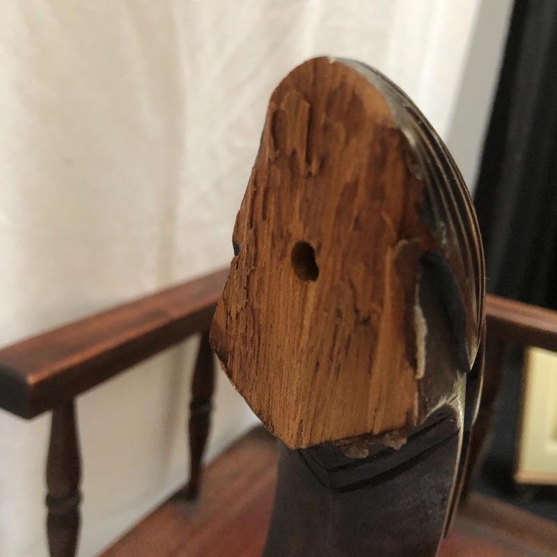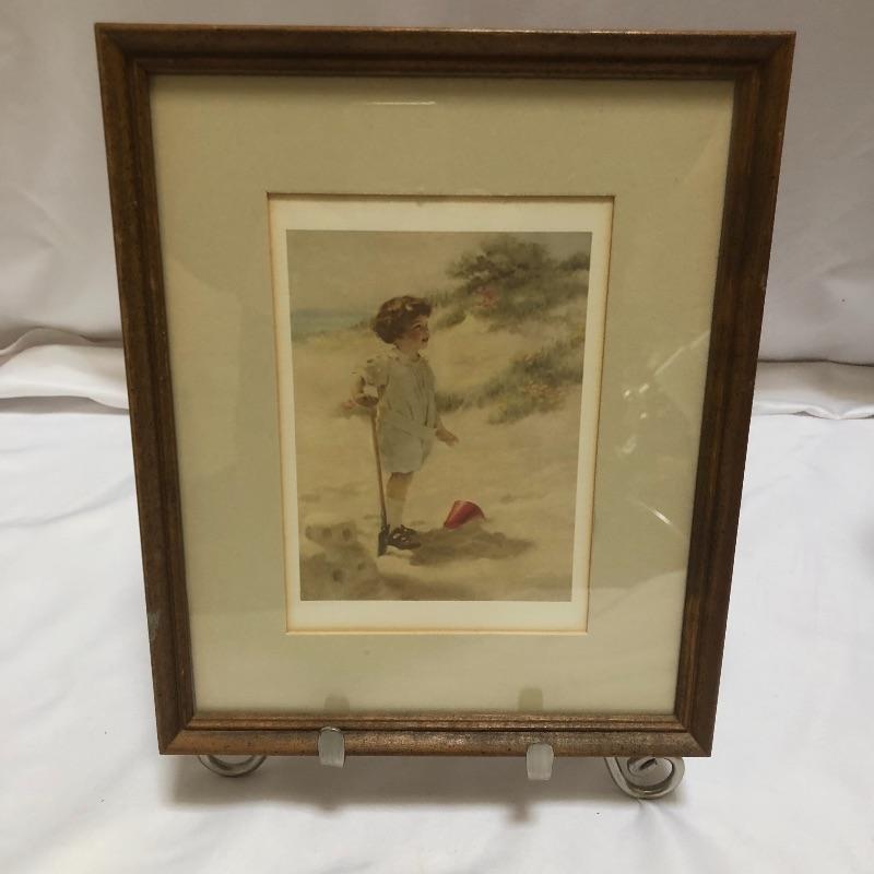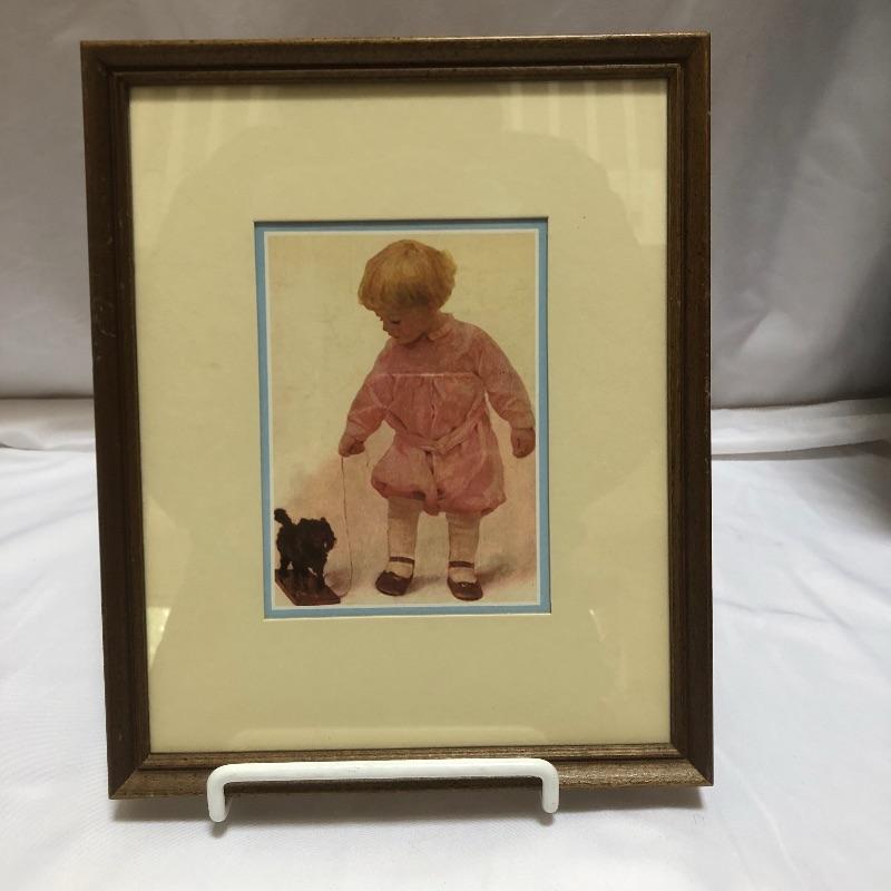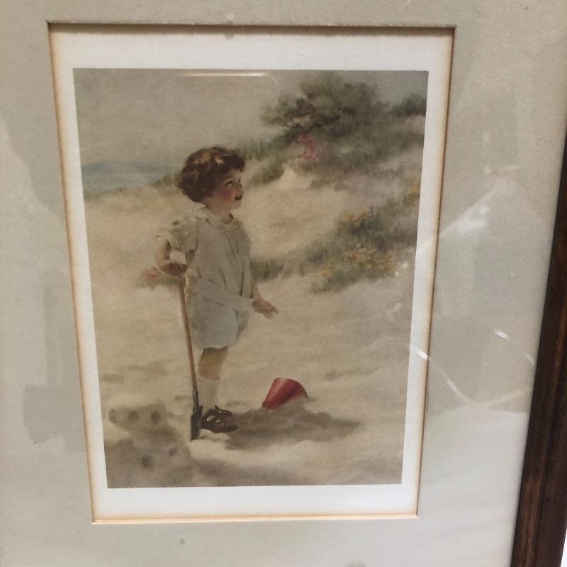 Decorate your home with this lovely rocking horse. Lot includes two matted and framed prints of young children and a wooden rocking horse. Horse has a chip on one ear and needs to have head repaired, see pictures. Rocking horse measures 17” x 34” x 25.5”.