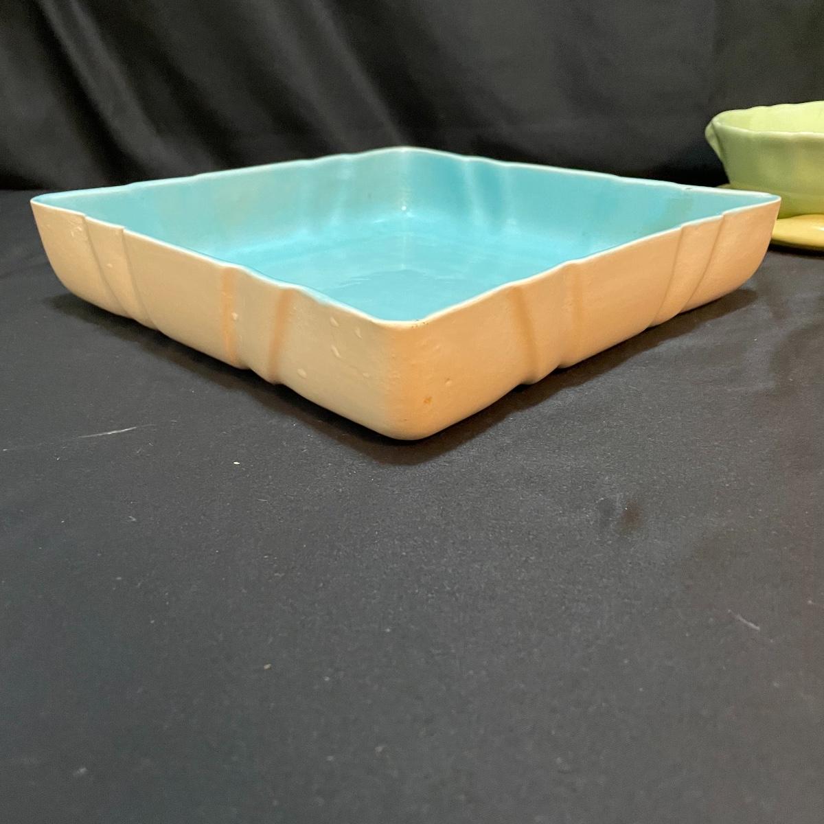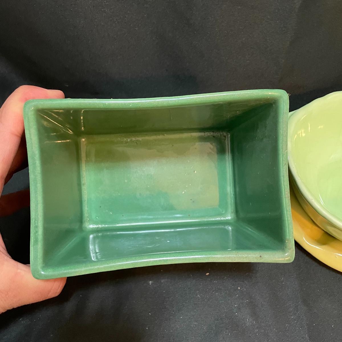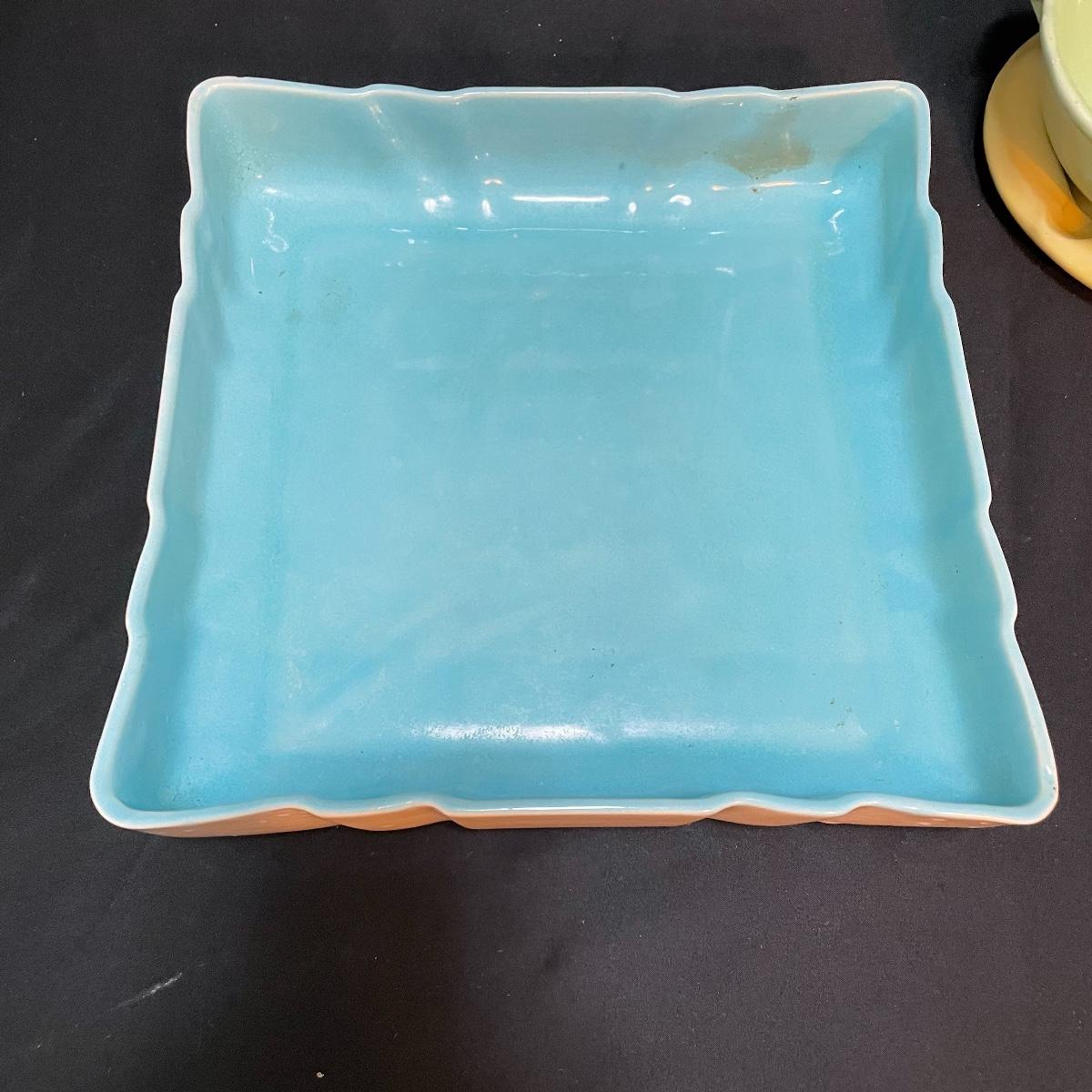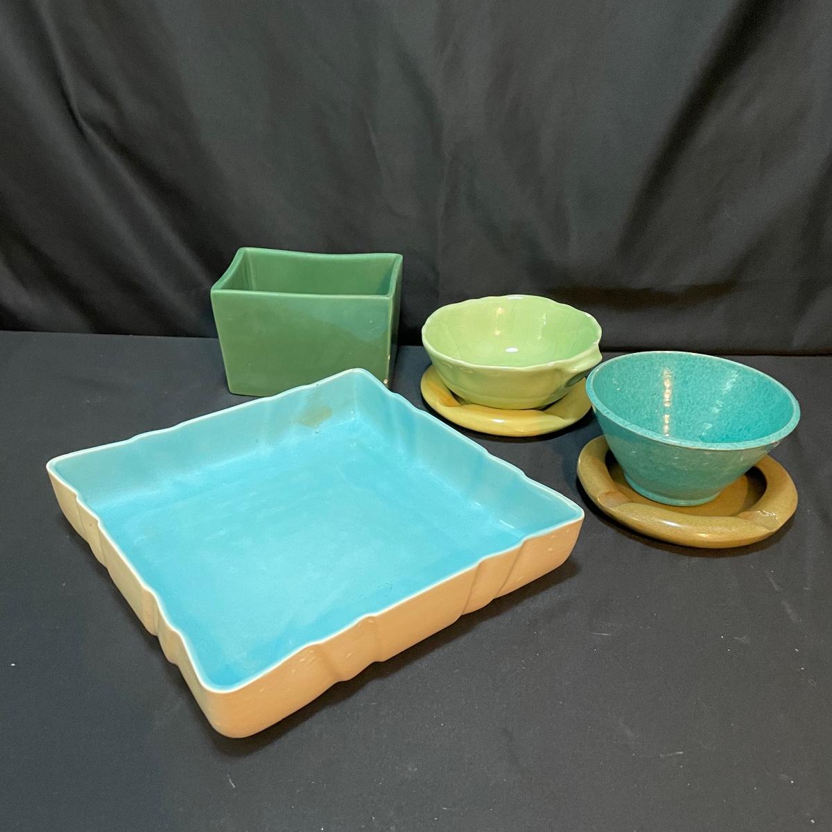 Here’s a colorful pottery lot perfect for inside or out! A deep emerald colored Haeger planter measuring about 6” x 4” x 4”. Lot offers two folded over plates that would be a great candle or planter stand. A light green Jessica Maioliche dish and a teal bowl both look great with a 10”sq baby blue and white square dish. We noticed a few chips shown in images. Shipping Available.