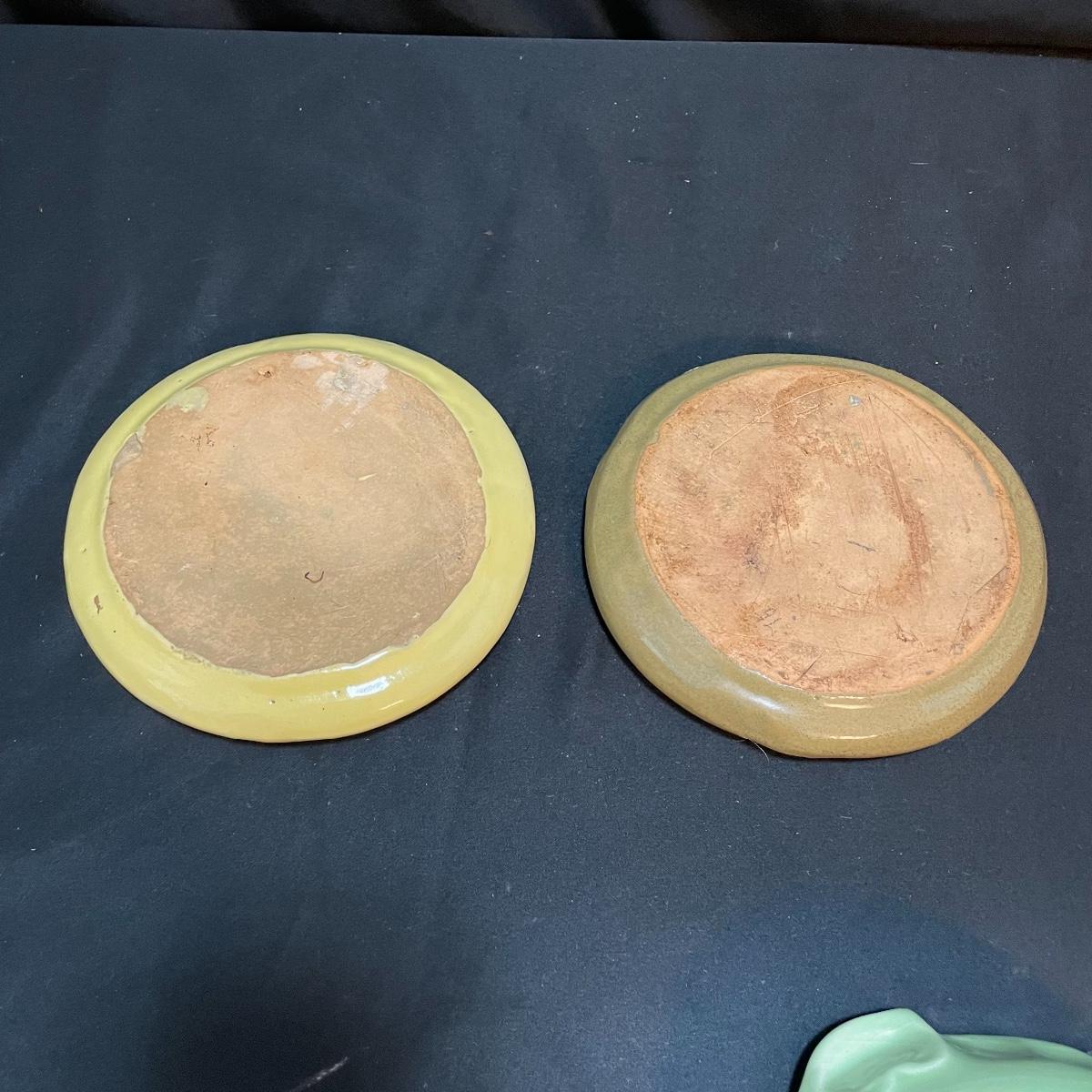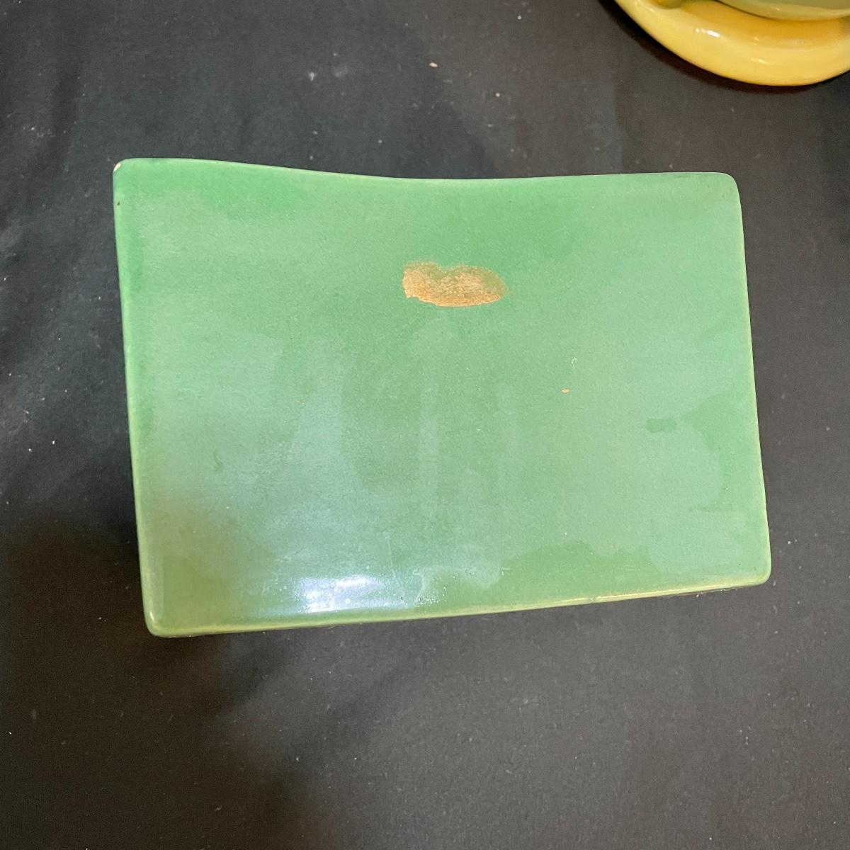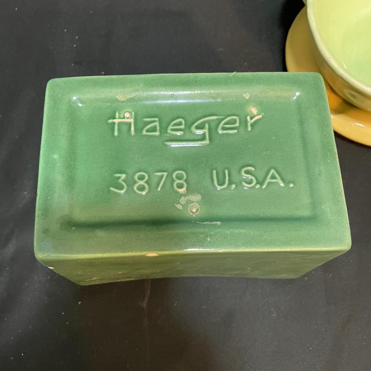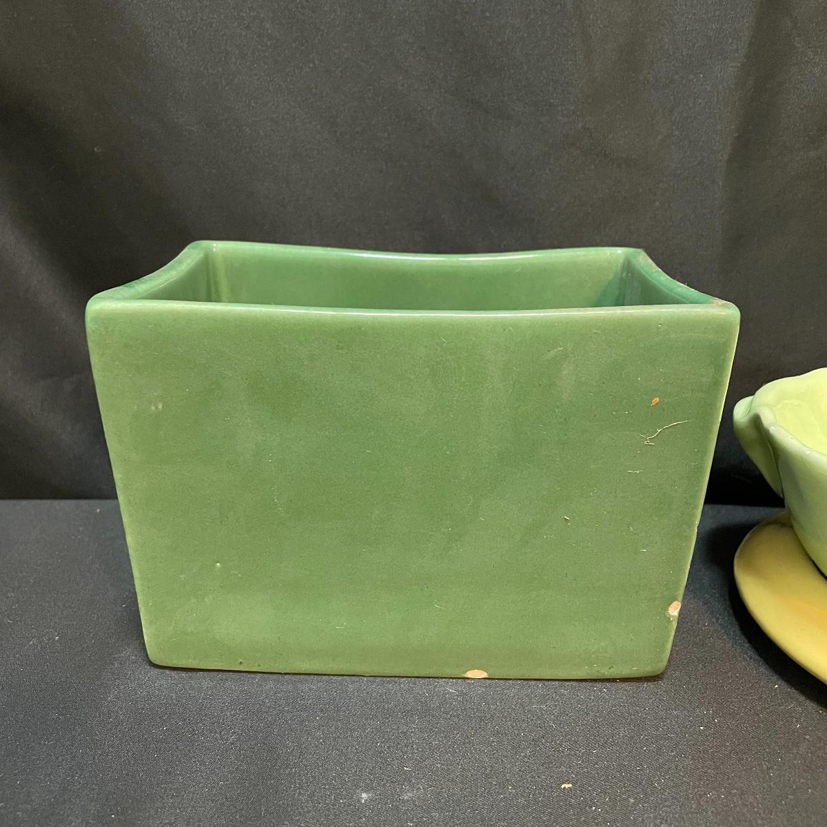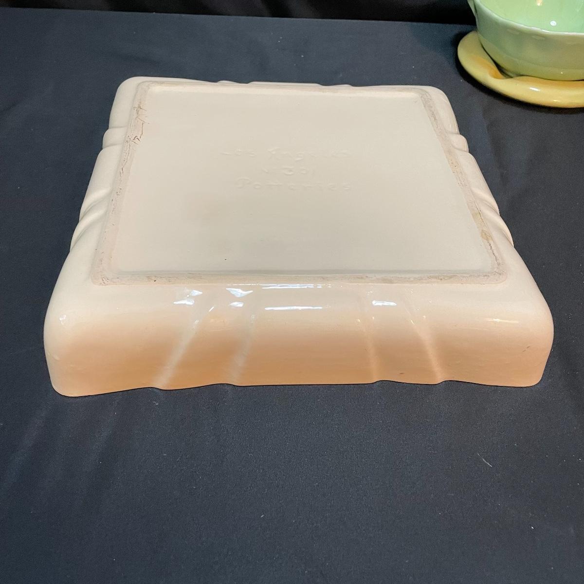 Here’s a colorful pottery lot perfect for inside or out! A deep emerald colored Haeger planter measuring about 6” x 4” x 4”. Lot offers two folded over plates that would be a great candle or planter stand. A light green Jessica Maioliche dish and a teal bowl both look great with a 10”sq baby blue and white square dish. We noticed a few chips shown in images. Shipping Available.
