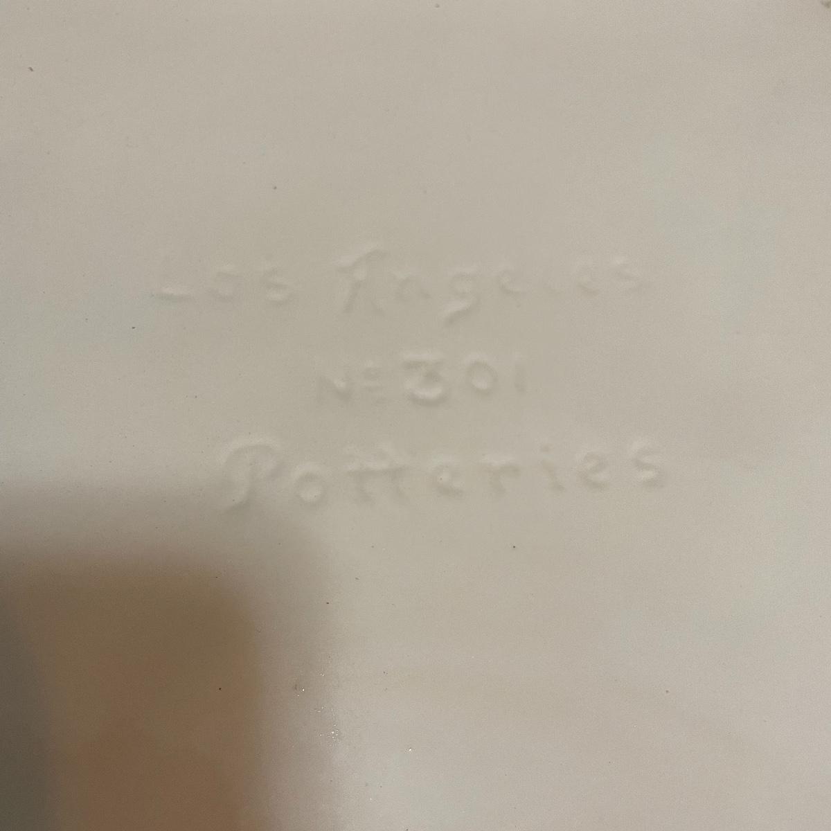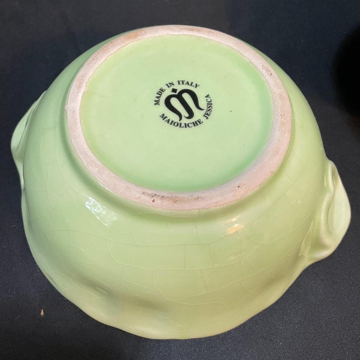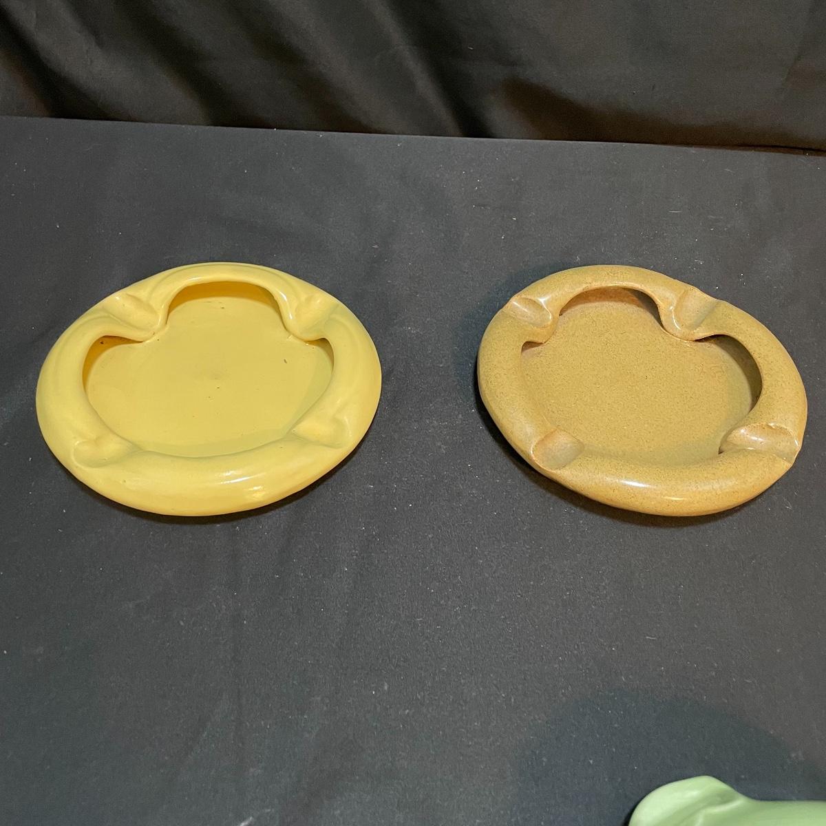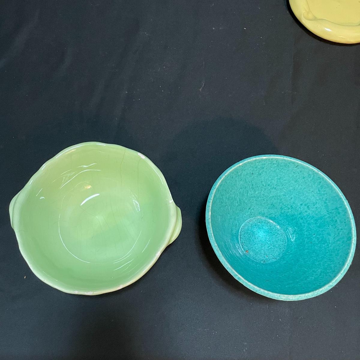 Here’s a colorful pottery lot perfect for inside or out! A deep emerald colored Haeger planter measuring about 6” x 4” x 4”. Lot offers two folded over plates that would be a great candle or planter stand. A light green Jessica Maioliche dish and a teal bowl both look great with a 10”sq baby blue and white square dish. We noticed a few chips shown in images. Shipping Available.