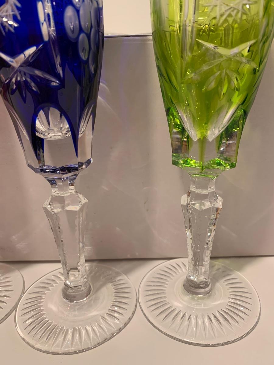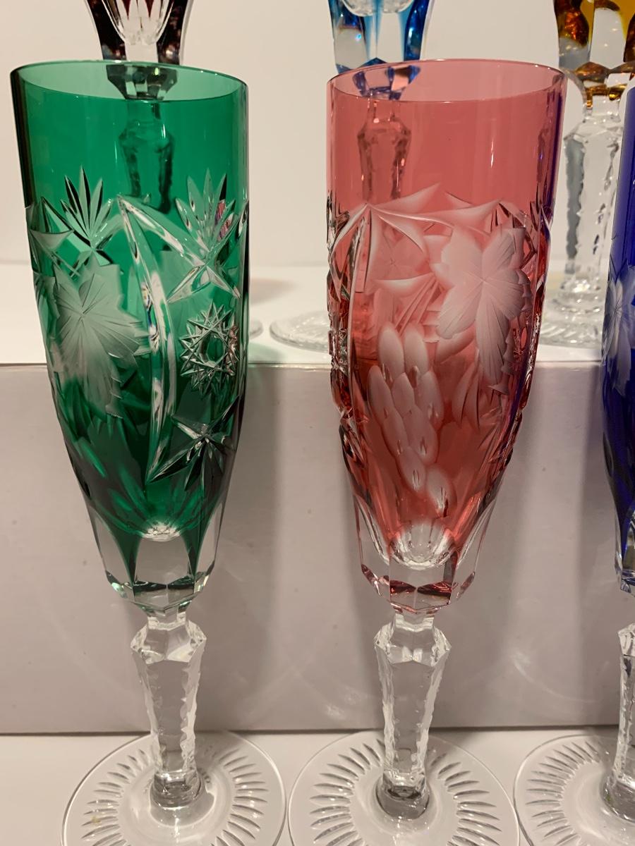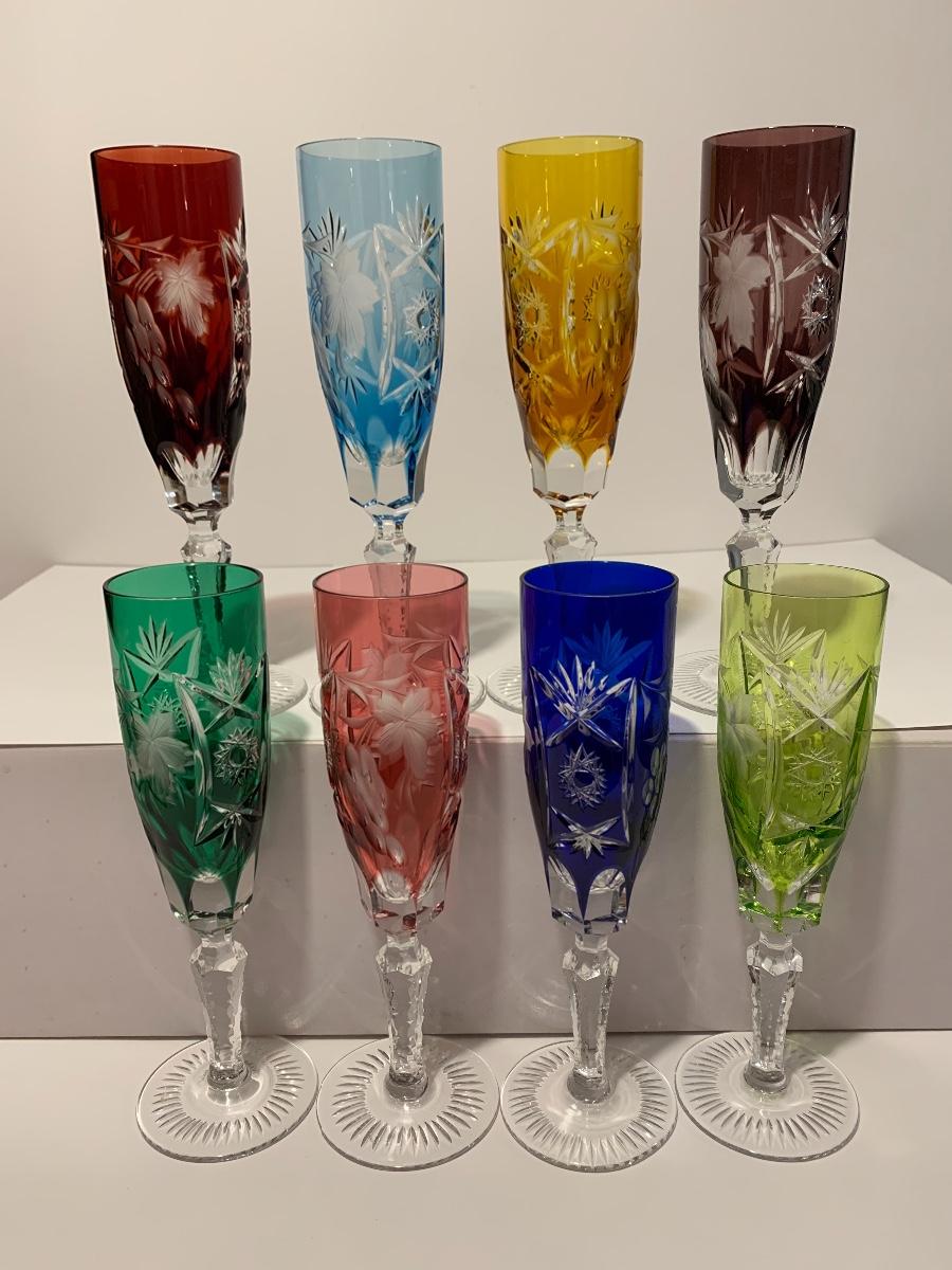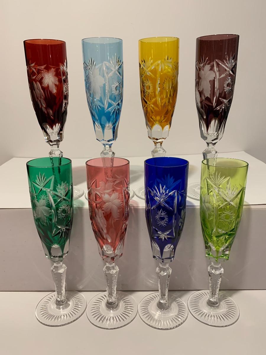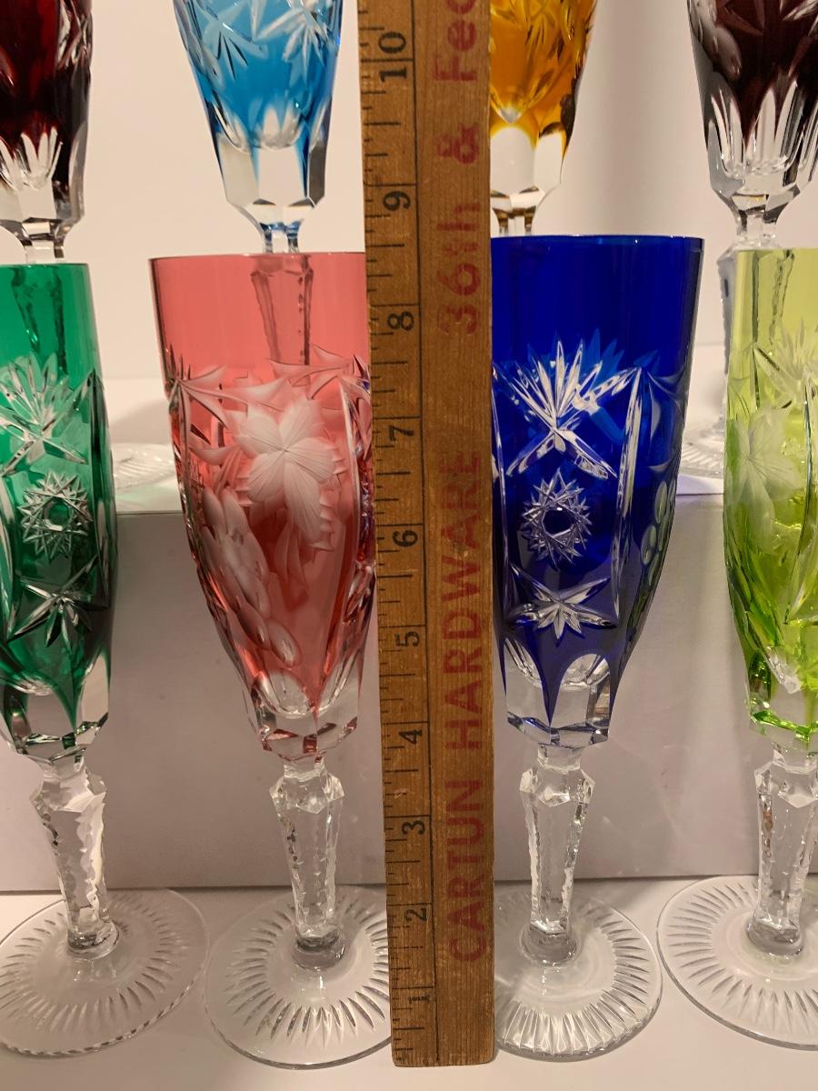 Beautiful set of 8 multicolored cut to clear flutes with notched stems from Germany Just stunning. They have had minimal use if any. The crystal is nice and clear without any residue.