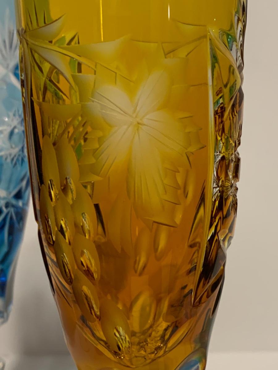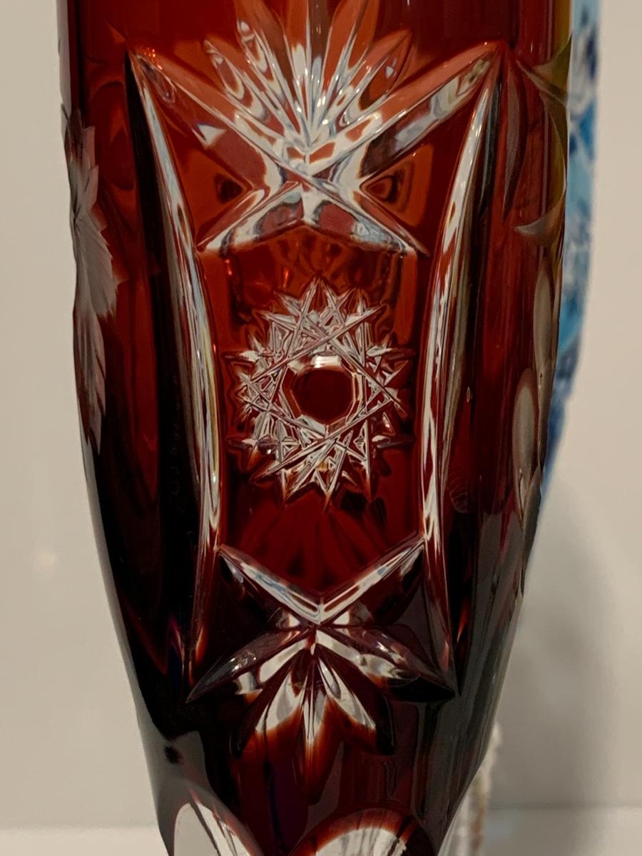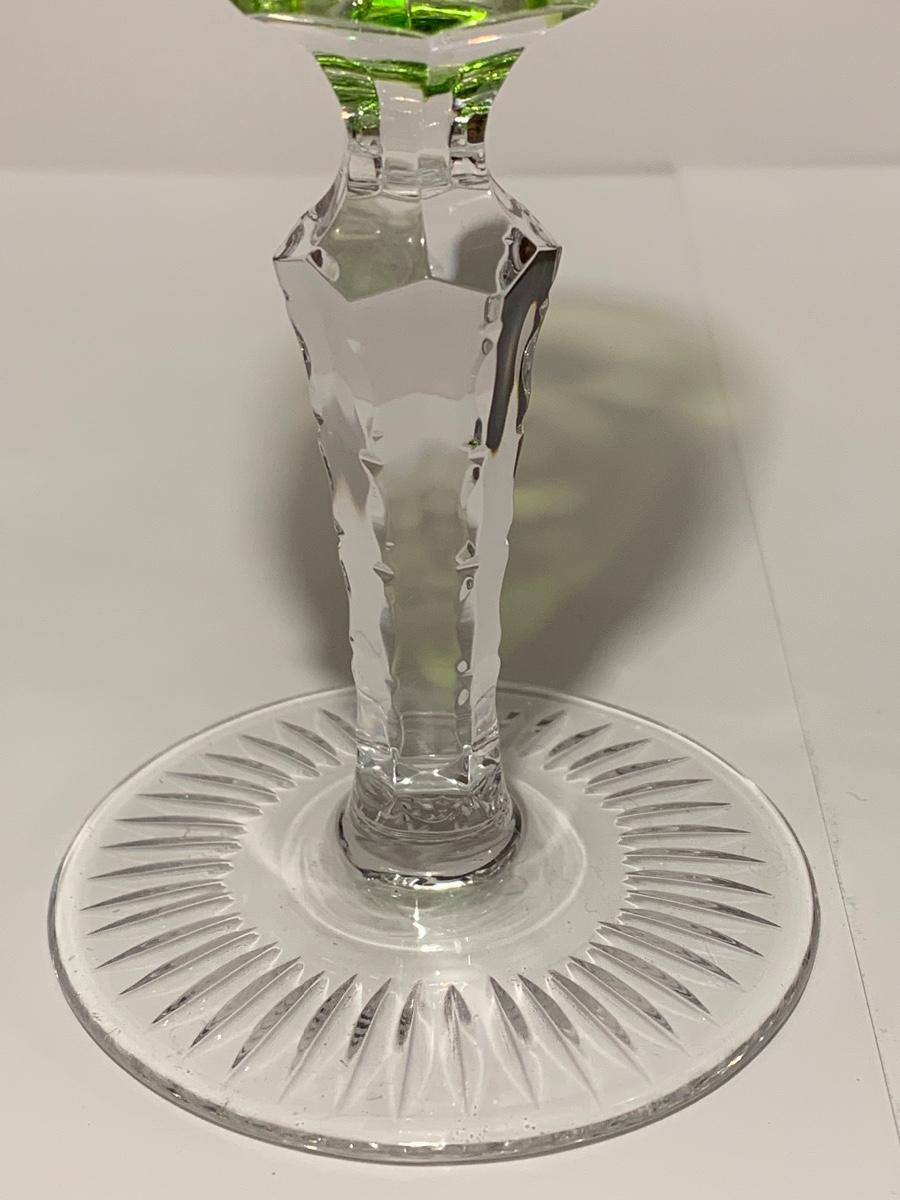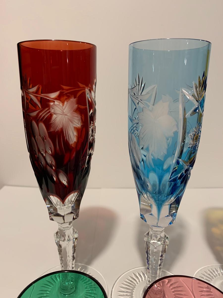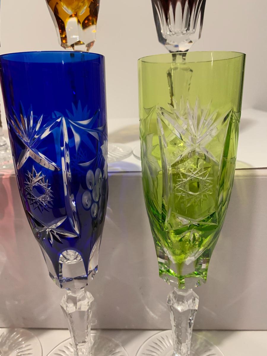 Beautiful set of 8 multicolored cut to clear flutes with notched stems from Germany Just stunning. They have had minimal use if any. The crystal is nice and clear without any residue.
