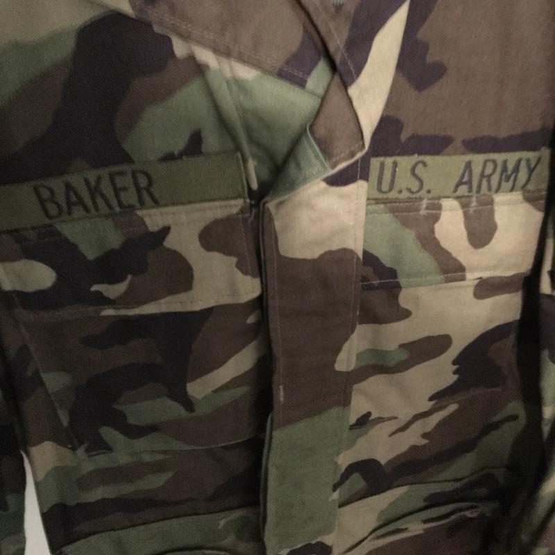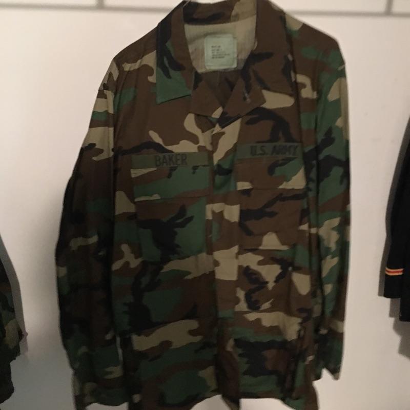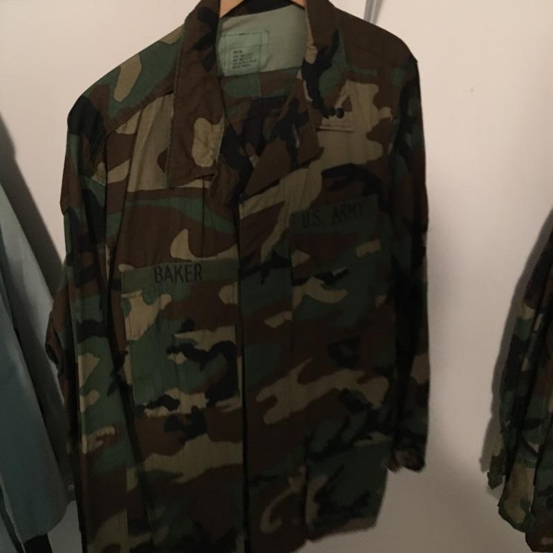 Four Army Camouflage uniforms with Baker and US Army on front. For sizes see pictures. No one will see you coming when you wear this lot.