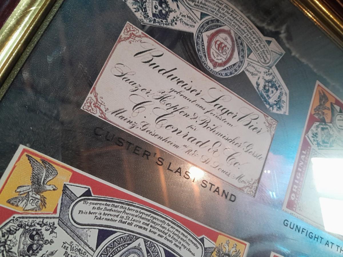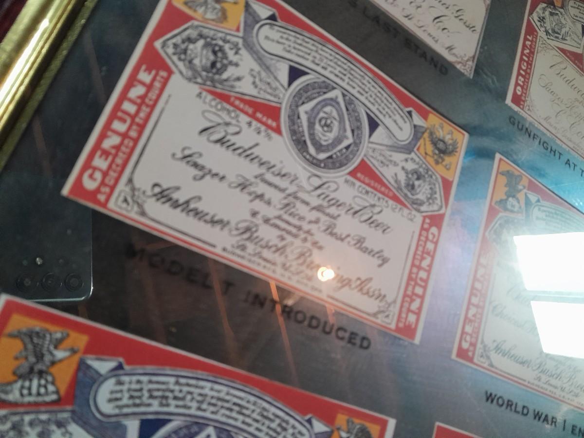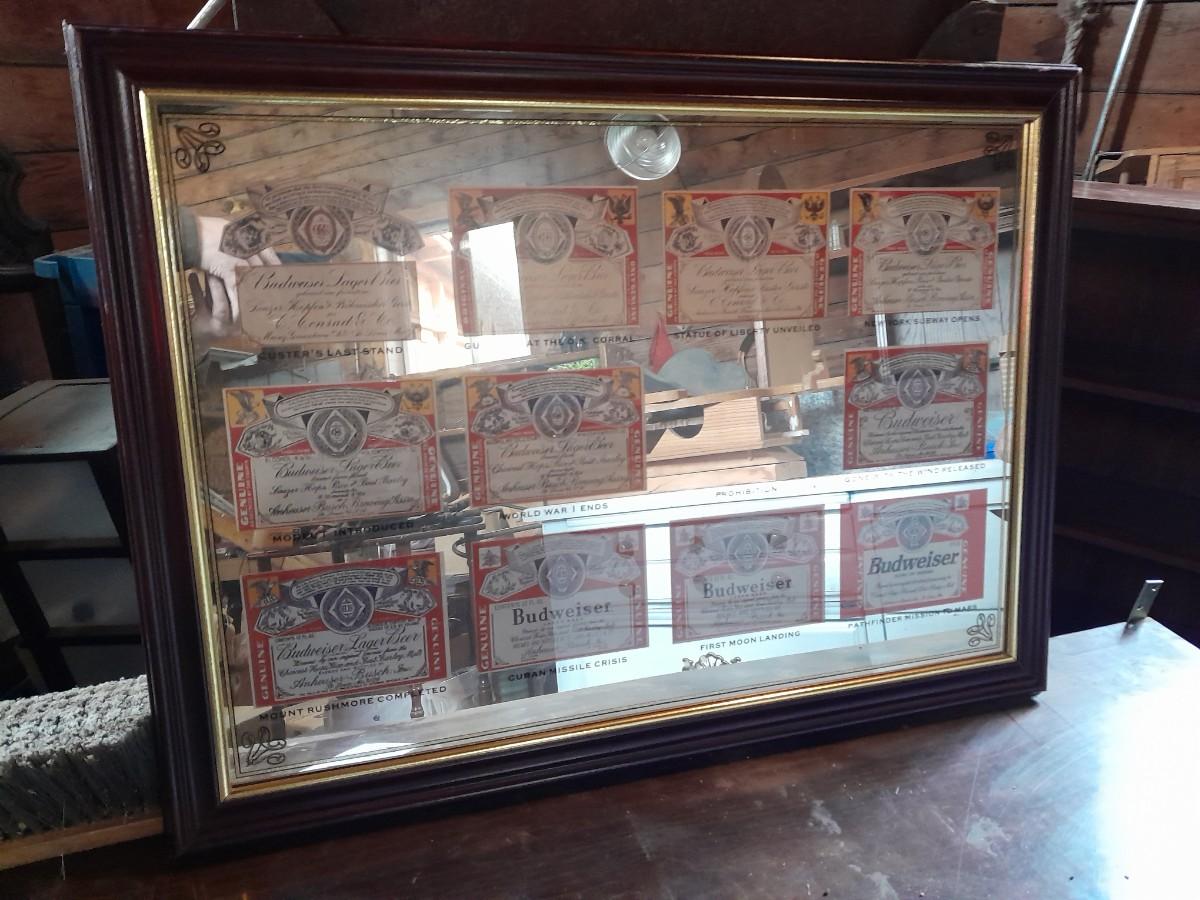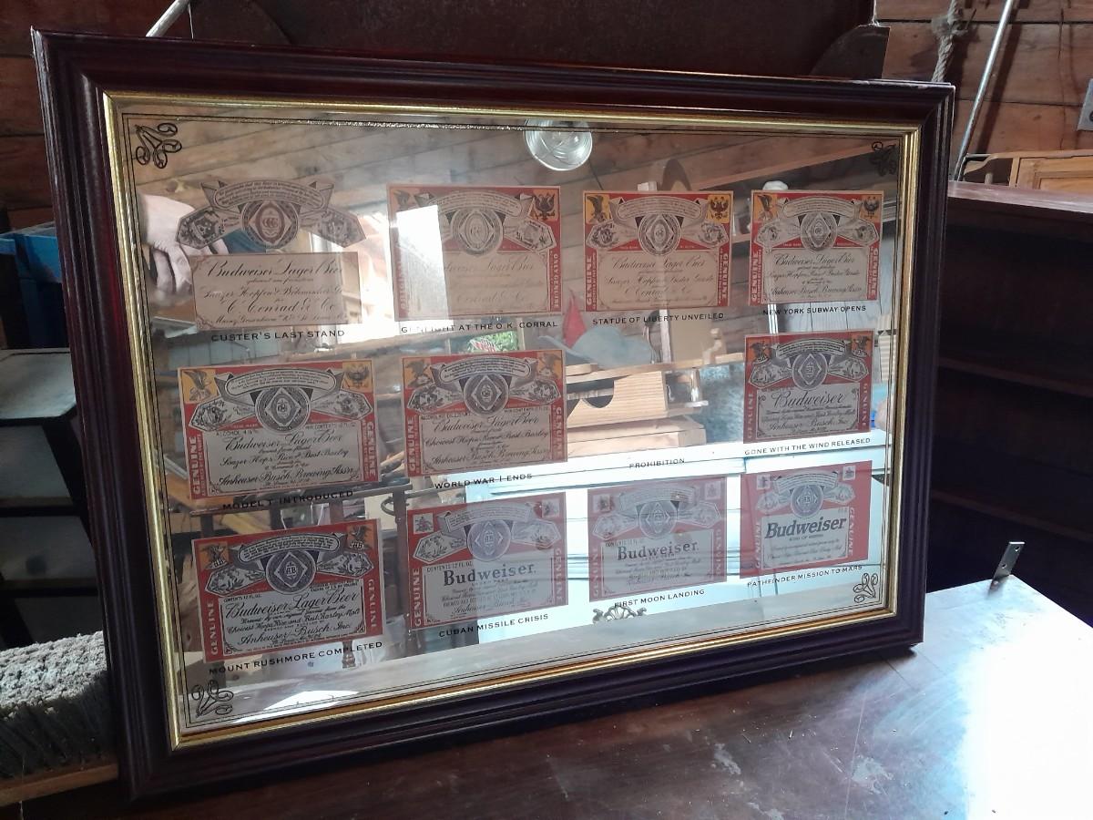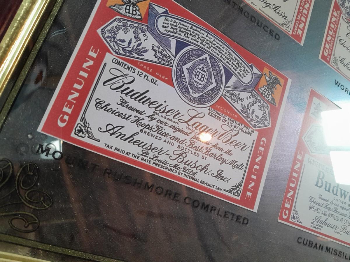BUDWEISER LABLES THROUGH THE YEARS FRAMED MIRRORED ADVERTISING 30" X 22"
