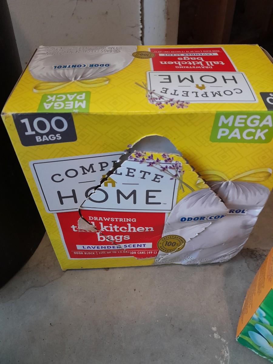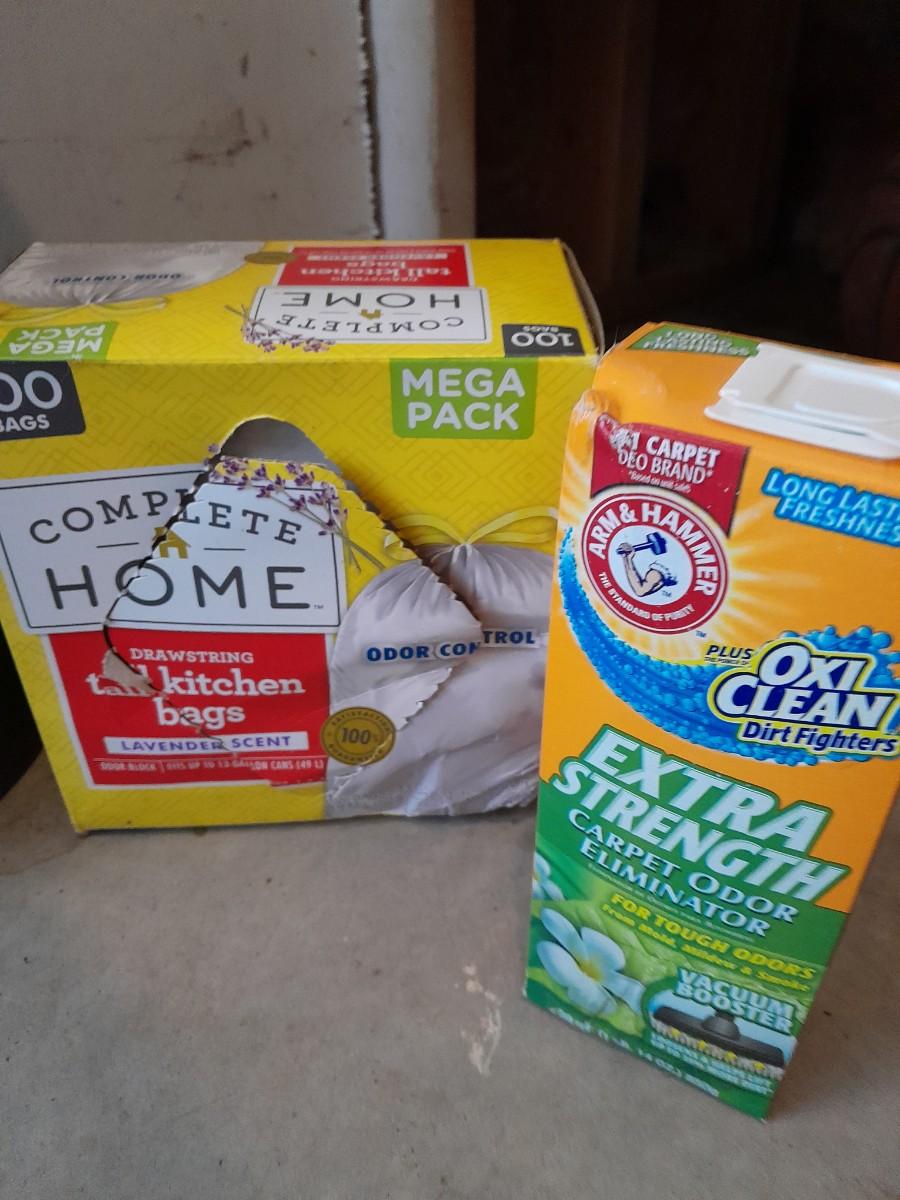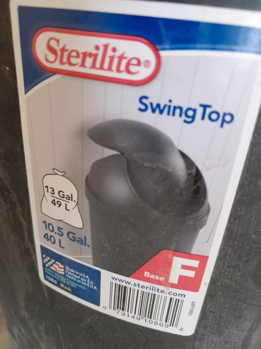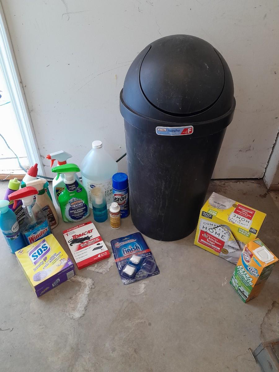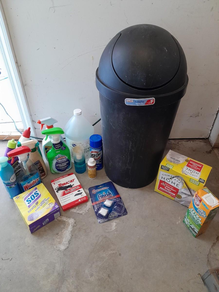 CLEANING CHEMICALS, 13 GALLON SWING TOP STERILITE TRASH CAN, WITH TRASH BAGS.