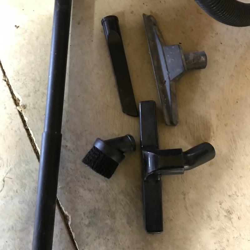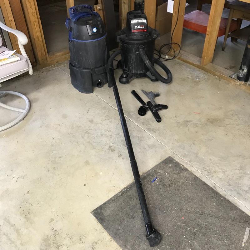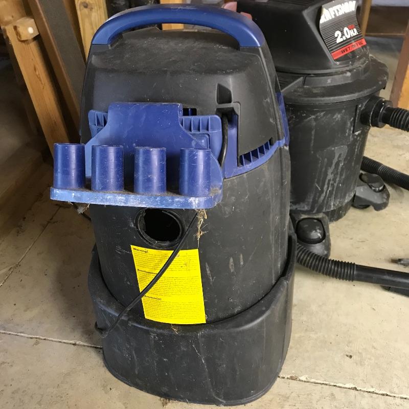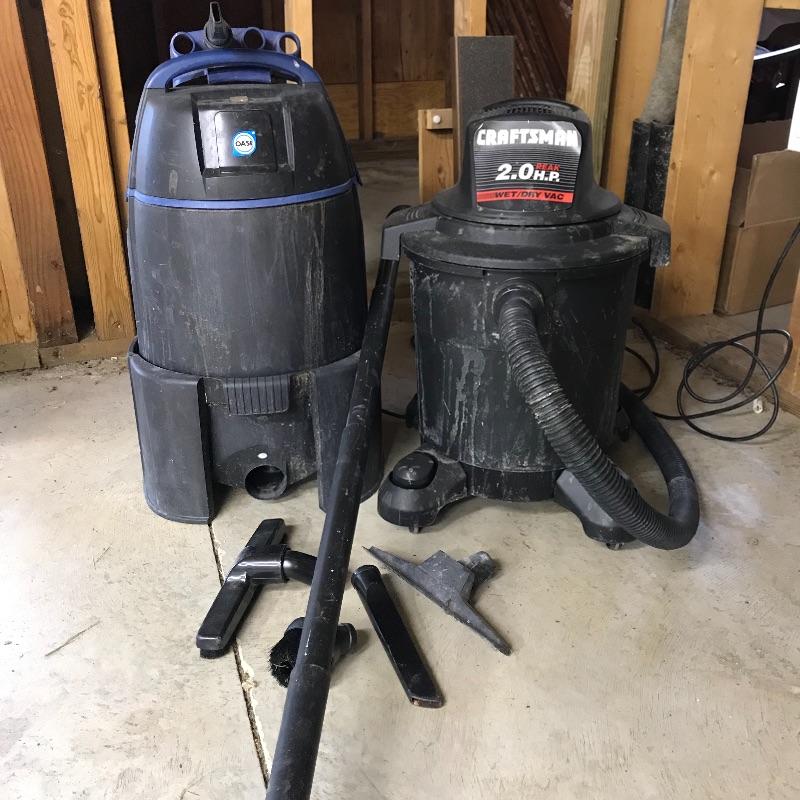 Two wet/dry vacs with some attachments. The first is a Craftsman 2.0 Peak H.P. on wheels. It rolls easily and has the attachments shown in photos. Next is an Oase without wheels. See photos for model numbers. These vacs are on the smaller side and appear to be around 2.5 gallon. Both power up nicely when plugged in and turned on. No shipping.