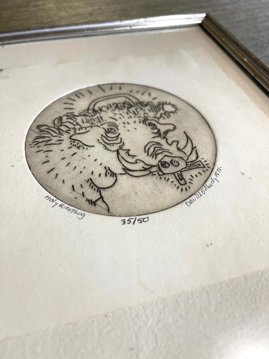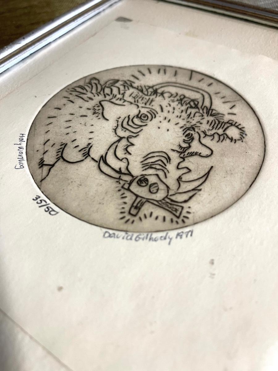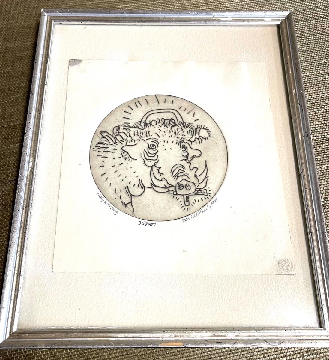 LOT 120 - David Gilhooly - American, 1943-2013 - etching, pencil signed. Dated 1971, numbered 35/50. This item is part of the David-Pleydell-Bouverie Estate at Bouverie Ranch in Glen Ellen. This item can be viewed at our Green + Cate Showroom in Sebastopol from July 15th - July 18th between the hours of 9am-5pm. For the benefit of the Bouverie Preserve of Audubon Canyon Ranch.