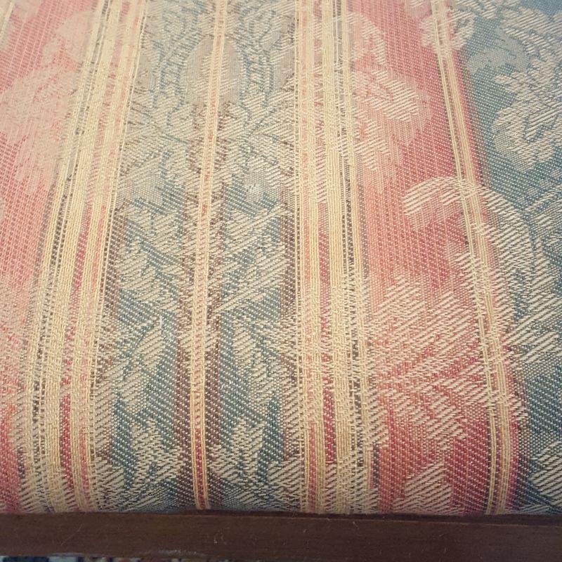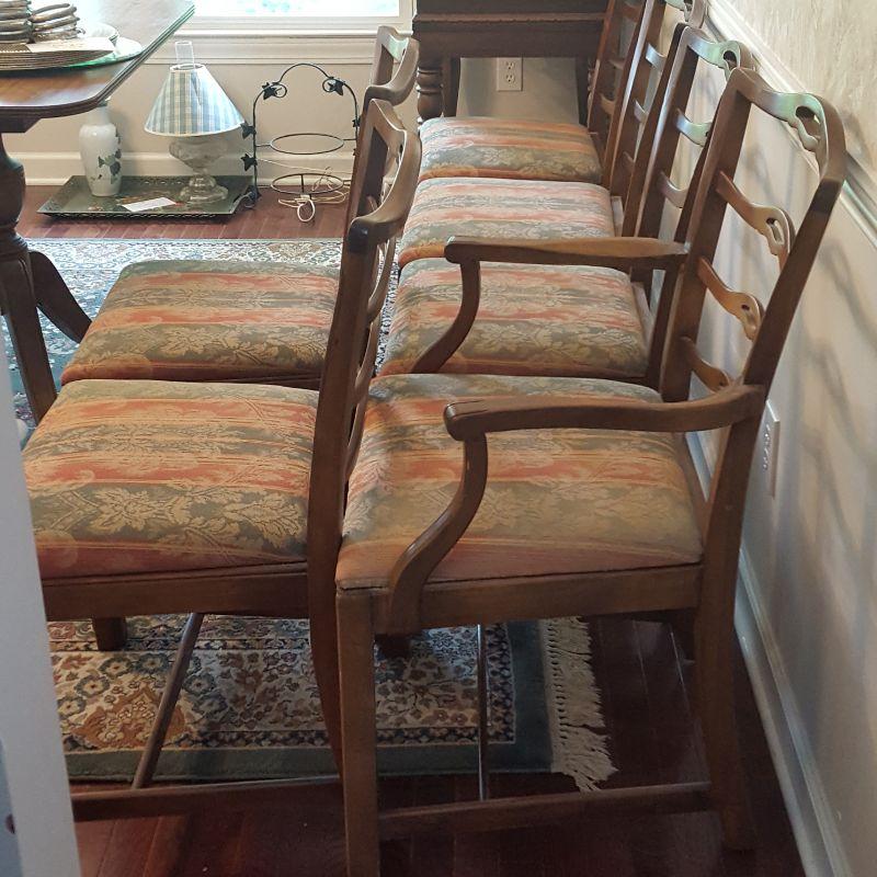 This lot contains 6 dining room chairs. These elegant chairs were with the table in Lot 119. One of the 6 chairs has arms, all the rest do not. The arm chair measures 23x23x37 inches. They are in great condition with a pretty striped upholstery and the chairs measure 20 x 17 x 35 in.