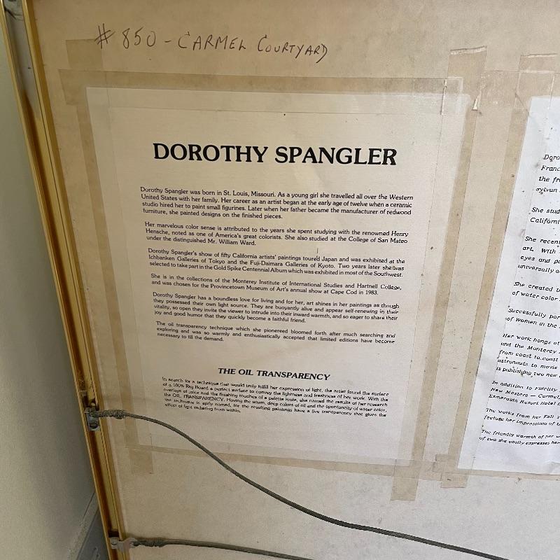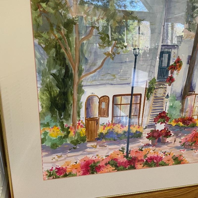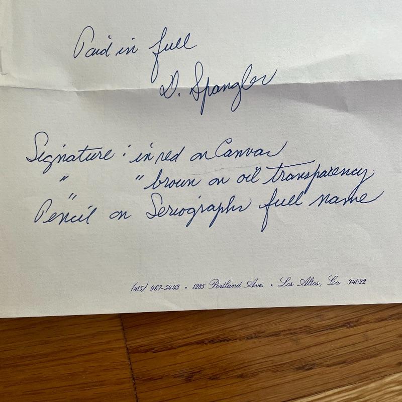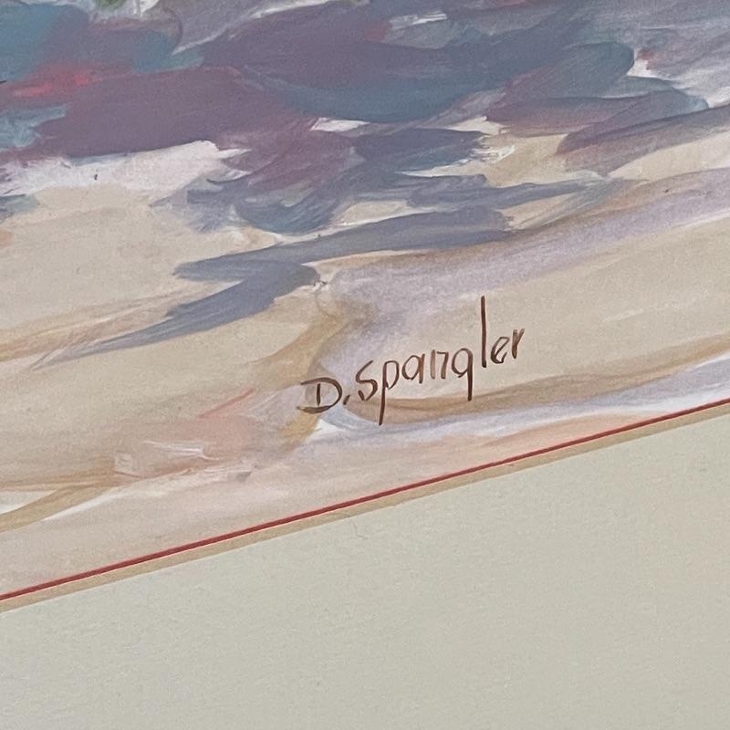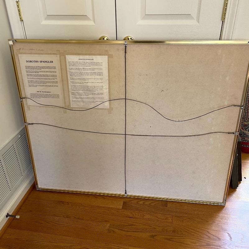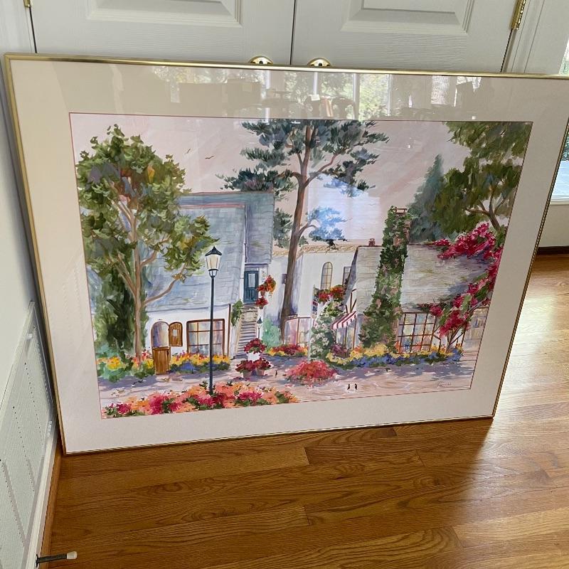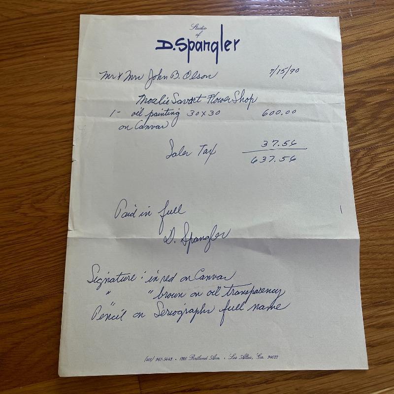 Let us showcase yet another piece of fascinating art. We’ve found some paperwork on the artist and a hand written sales receipt, shown in images and included in lot. The receipt states title “Moulie Savart Flower Shop” and that this piece is an oil painting. At the bottom of the receipt states art is an “oil transparency”, which other found documents state Mrs. Spangler helped innovate. Art sits in matting behind glass in a golden colored 47” x 37.5” metal frame. Shipping available. Please call UPS with dimensions at 828-252-6930 for a shipping quote prior to bidding.