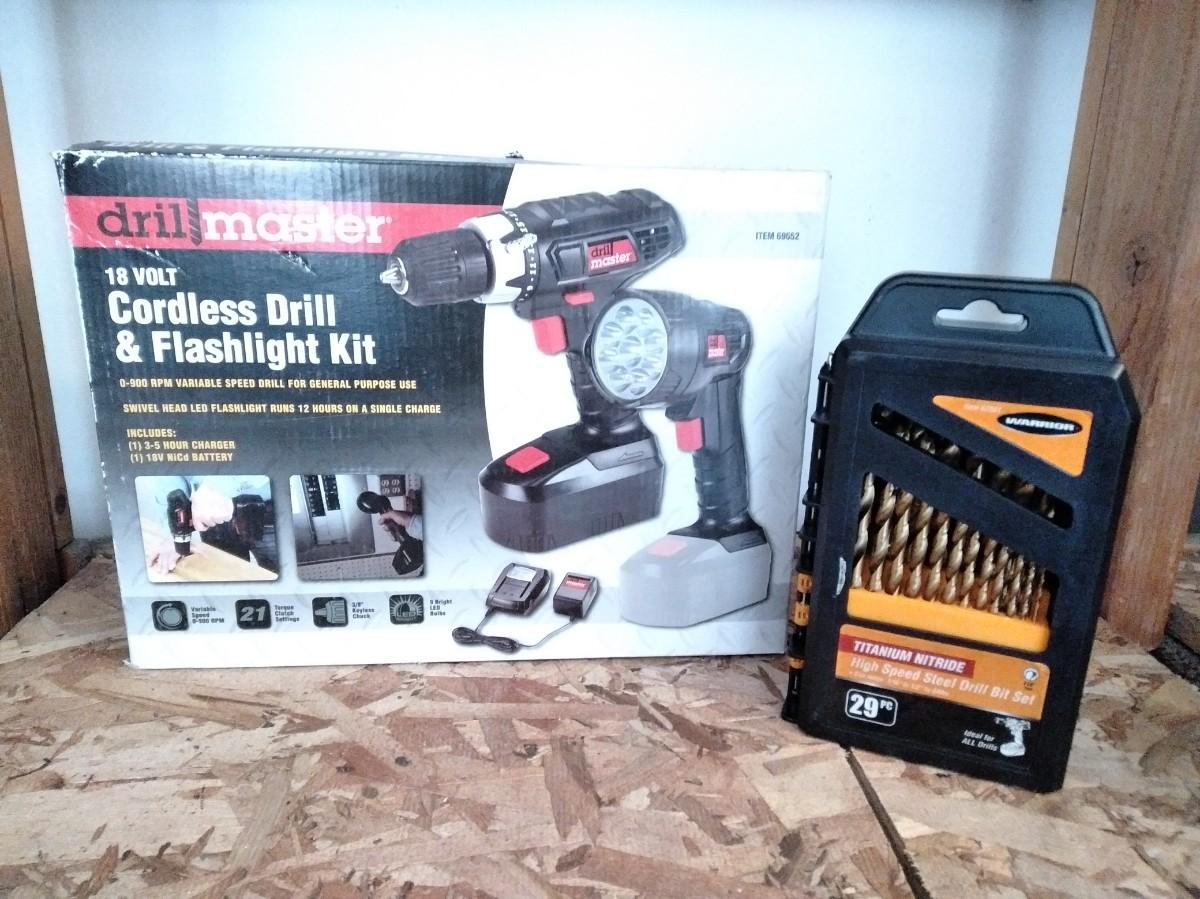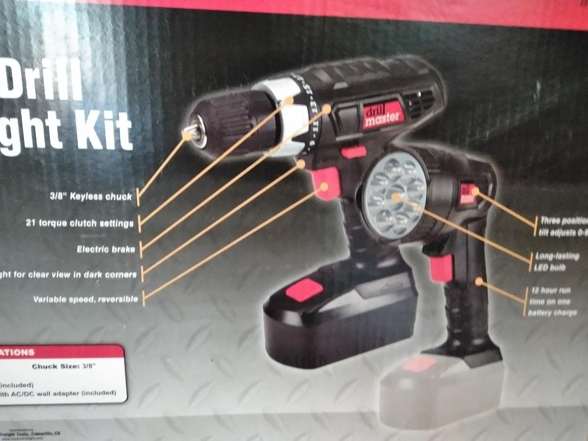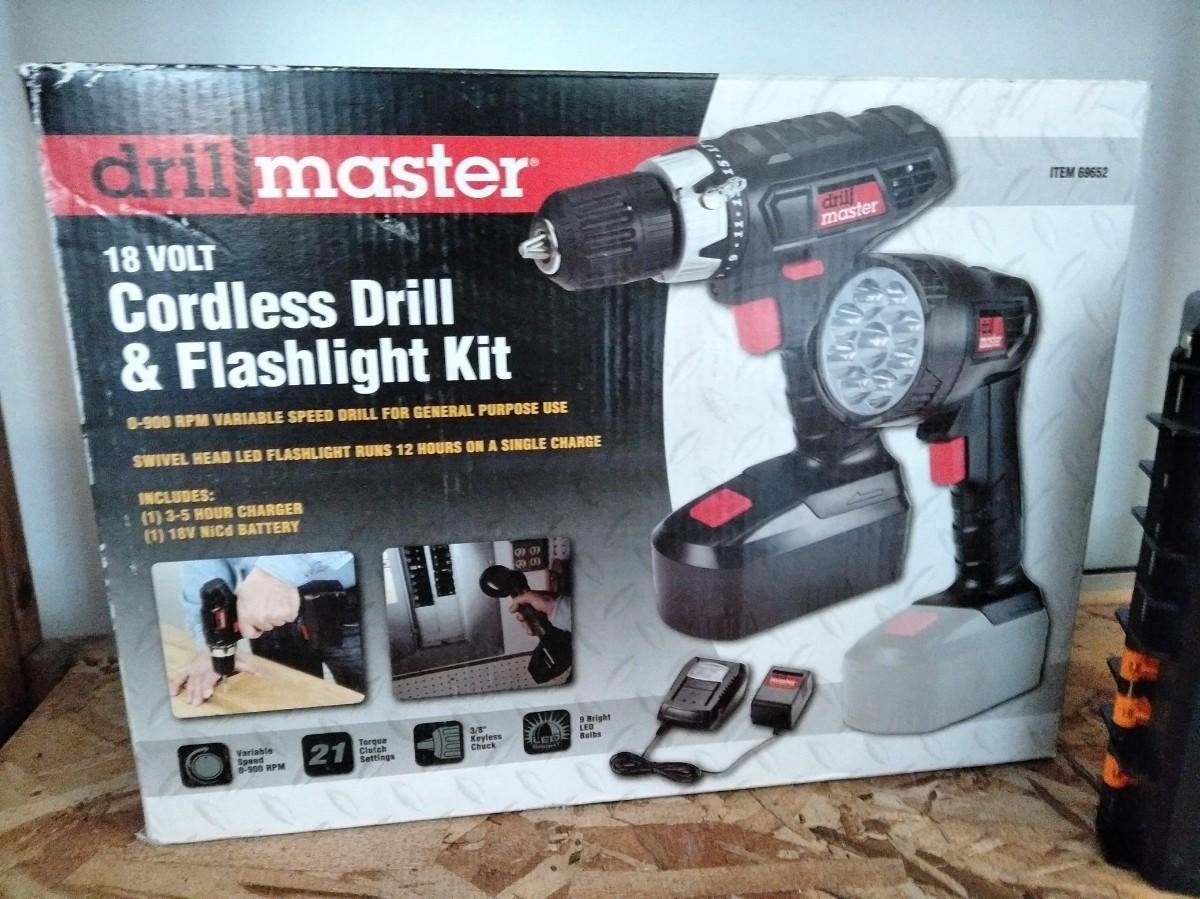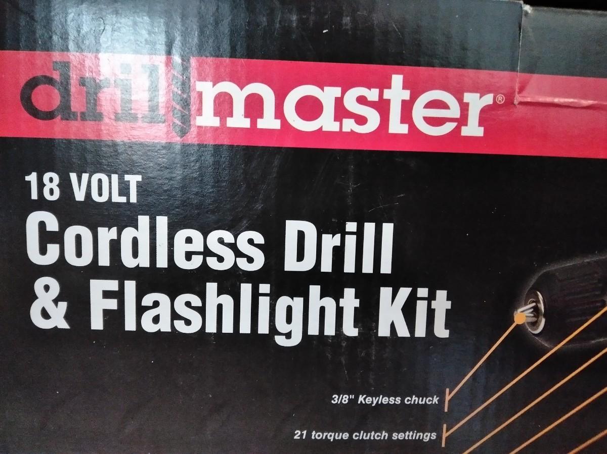 DRILL MASTER CORDLESS DRILL AND FLASHLIGHT KIT WITH A SET OF NEW DRILL BITS!