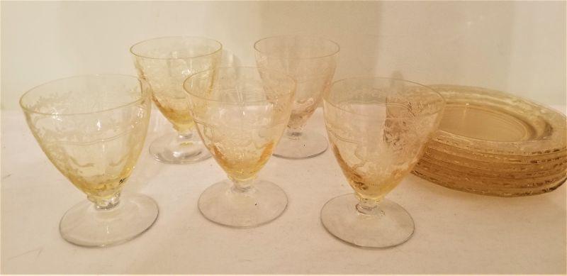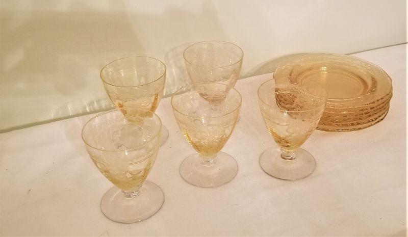 This lot comes with 12 footed tumblers - yellow - Fostoria "Versailles" pattern and 12 saucers. All in good condition. Tumblers measures 3.75" tall, saucers are 6" across. Good condition.