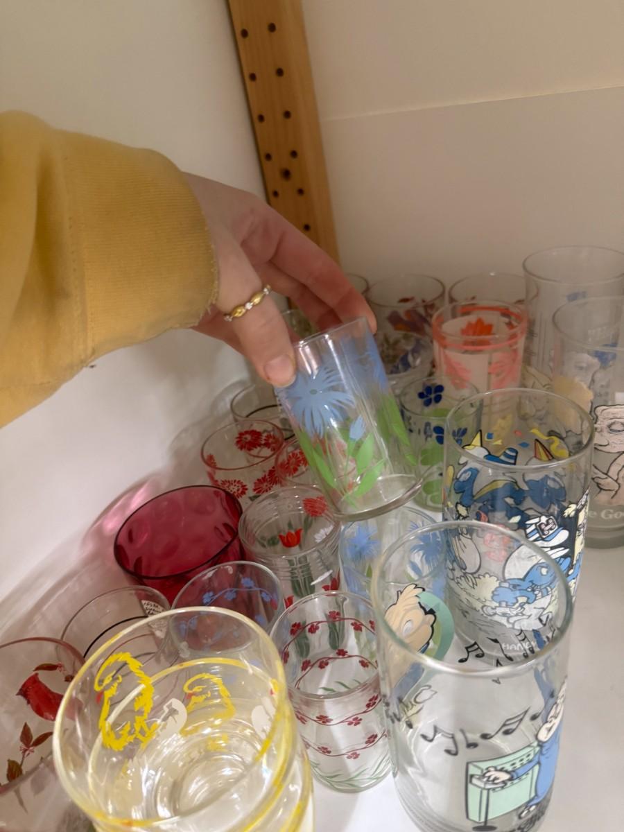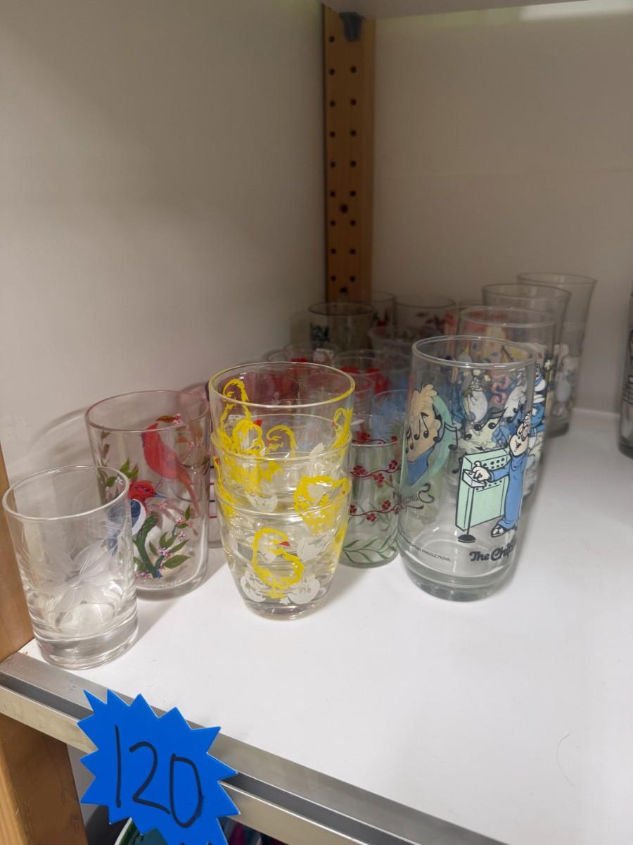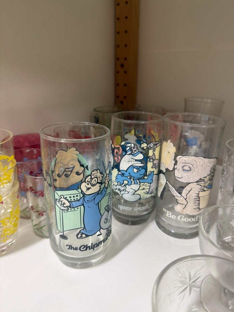Various glasses, including souvenir E.T. and Alvin and the Chipmunks