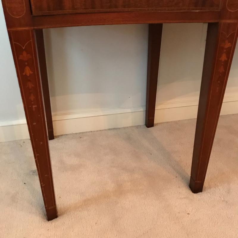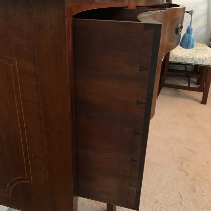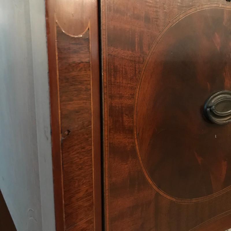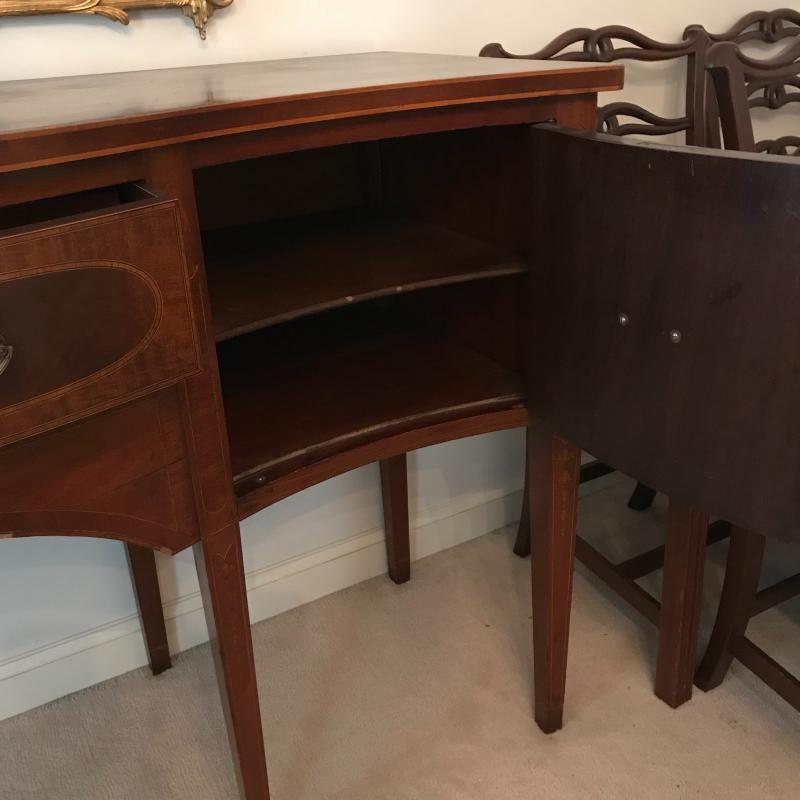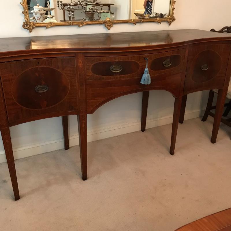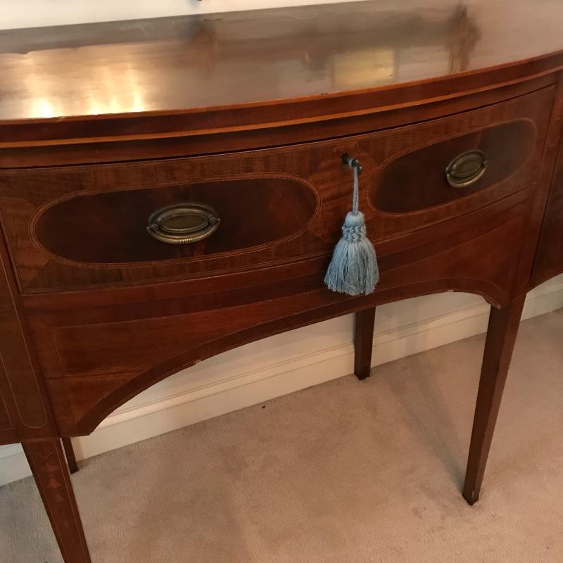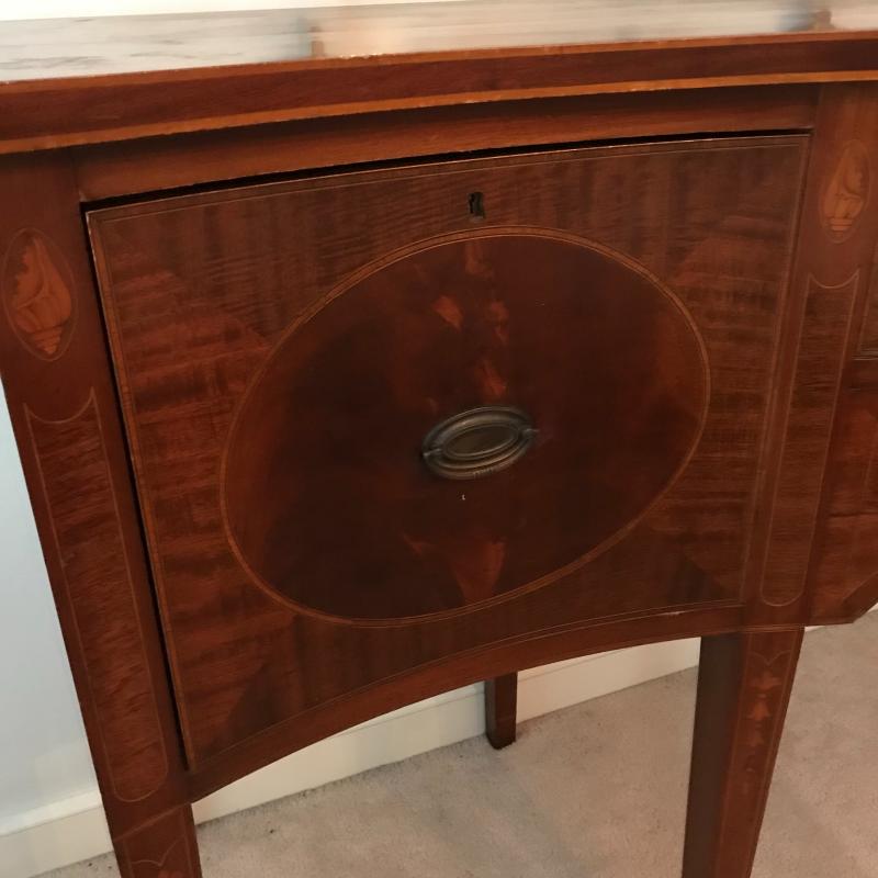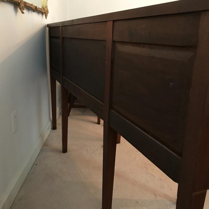 Gorgeous dark cherry stained wood buffet with elaborate inlay on front. Complete with key, one cabinet and two drawers- The middle drawer being the shallowest with a removable wooden organizer, the other drawer is approx. 13” deep. Cabinet has one shelf. Buffet measures approx. 72x24.5x38”. Excellent condition some nicks and blemishes. See photos. Piece is heavy, please bring help to load. No shipping.