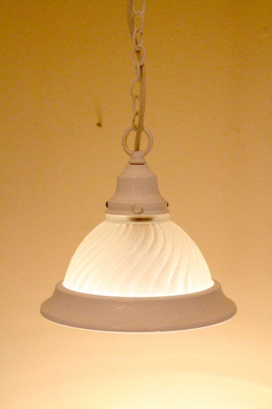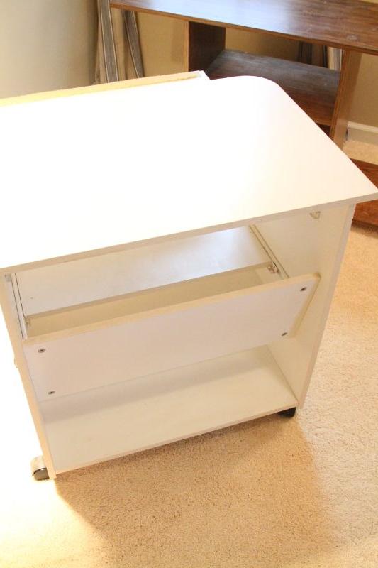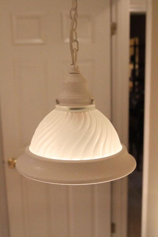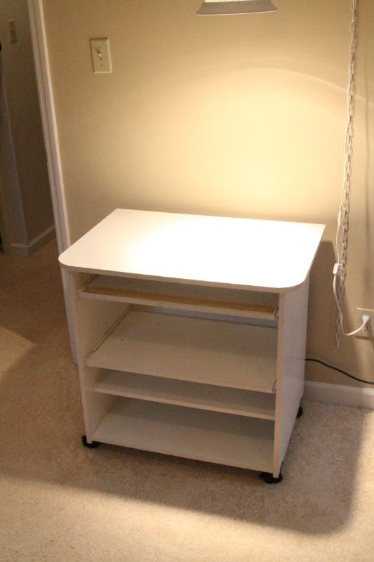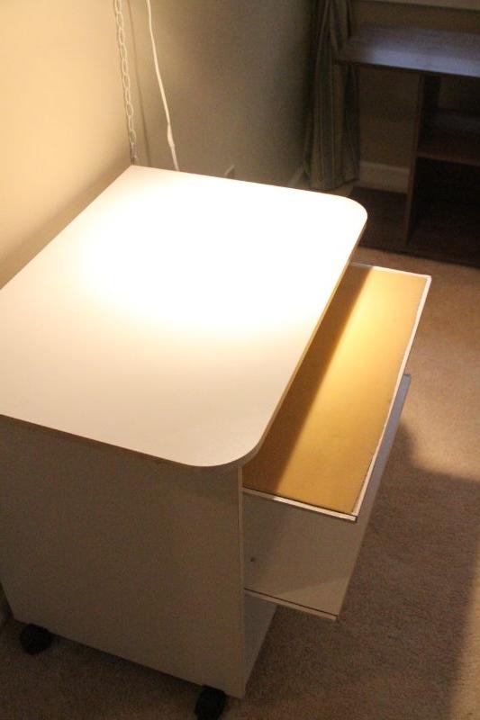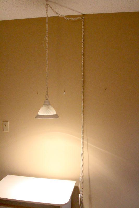 Hanging ceiling lamp with 132" long cord and chain. Ceiling hook not included. Also a white particle board rolling computer desk, 21" d x 29" h x 30' w.