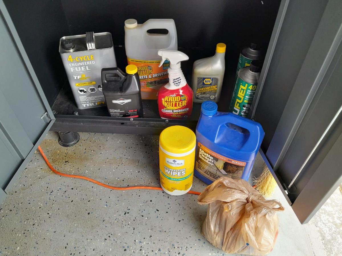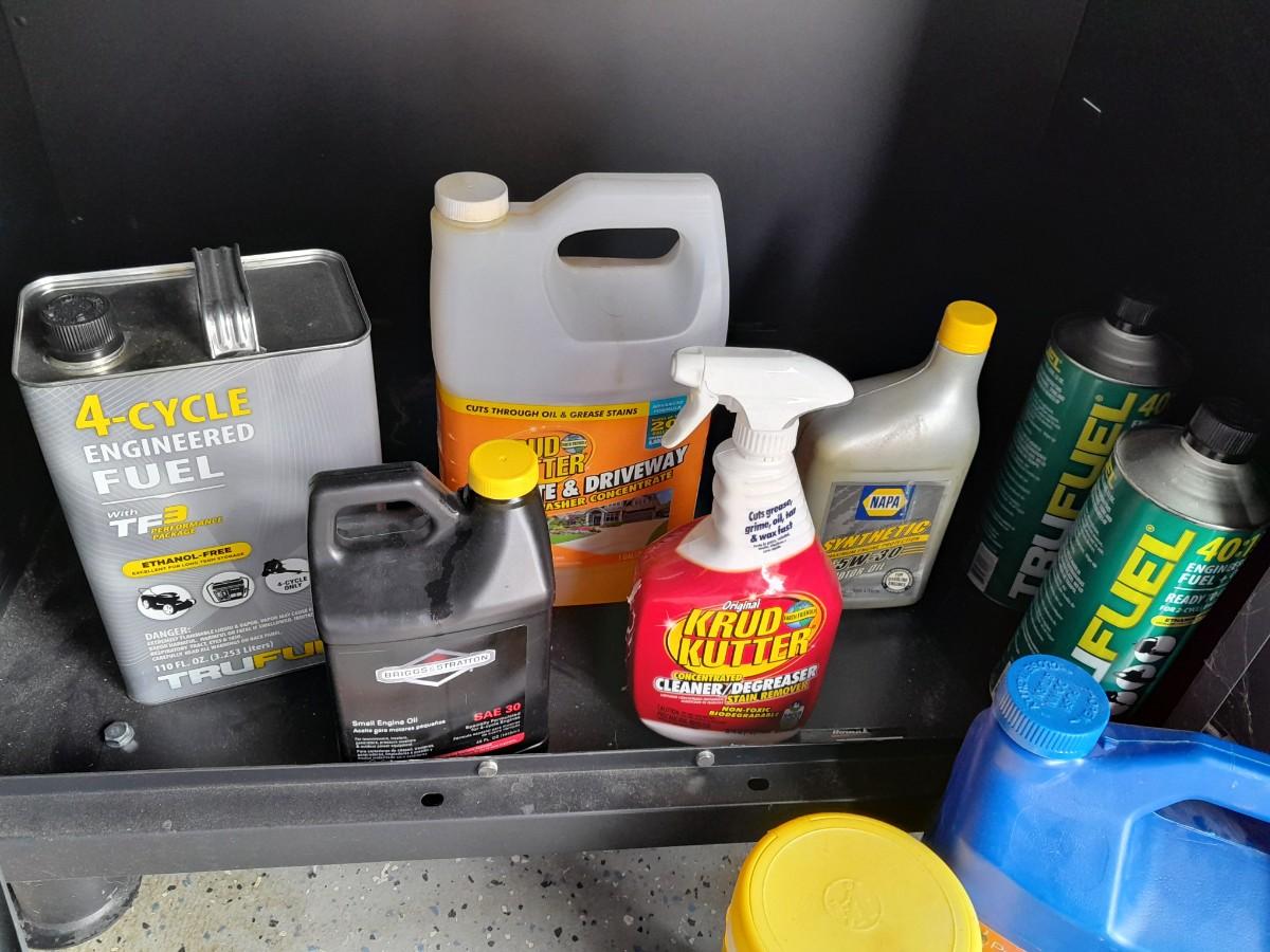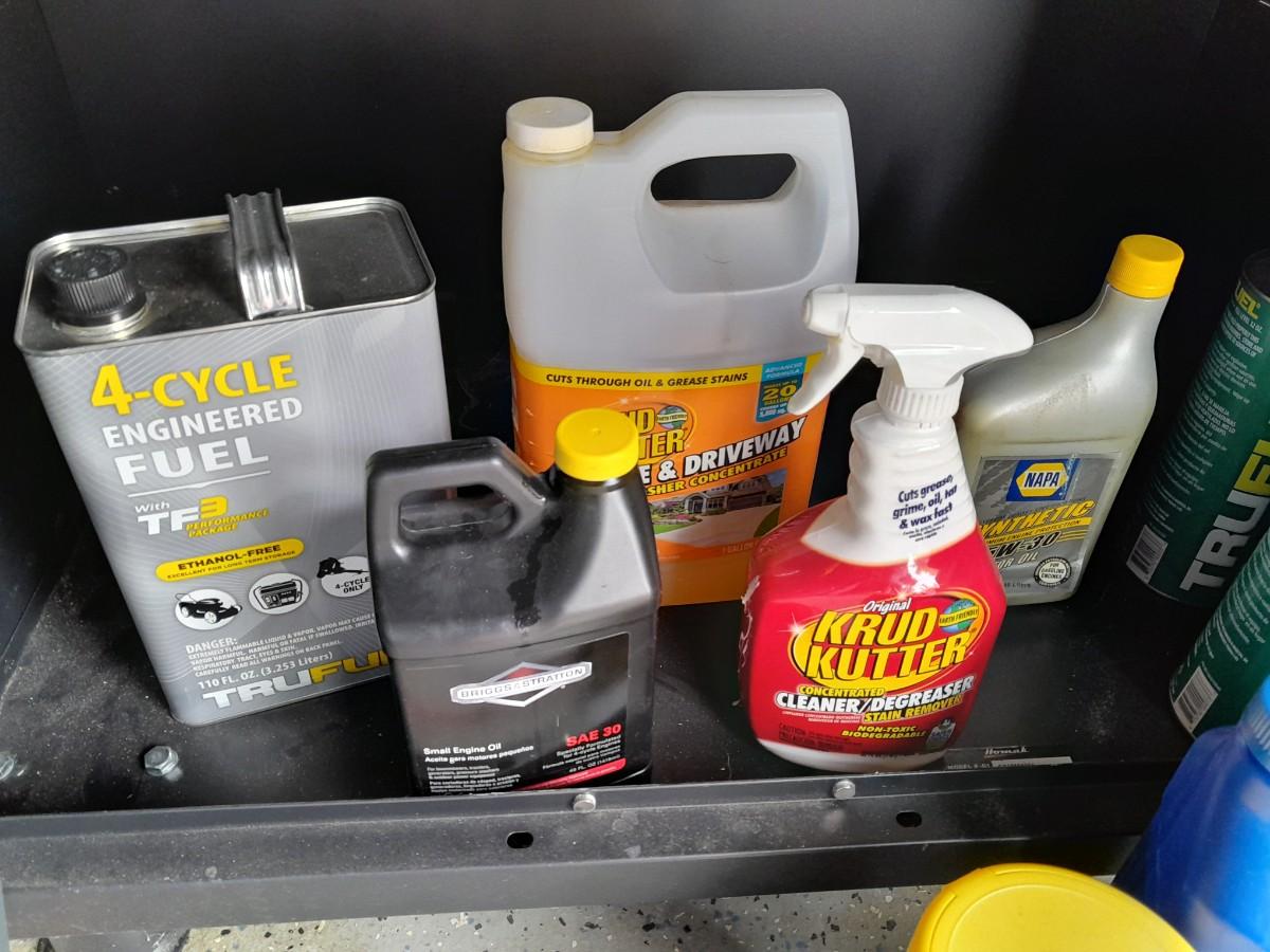 HOUSEHOLD CHEMICALS CLEANING CHEMICALS, DRIVEWAY CLEANER, OIL, 4-CYCLE FUEL, AND MORE WITH KNEE PADS